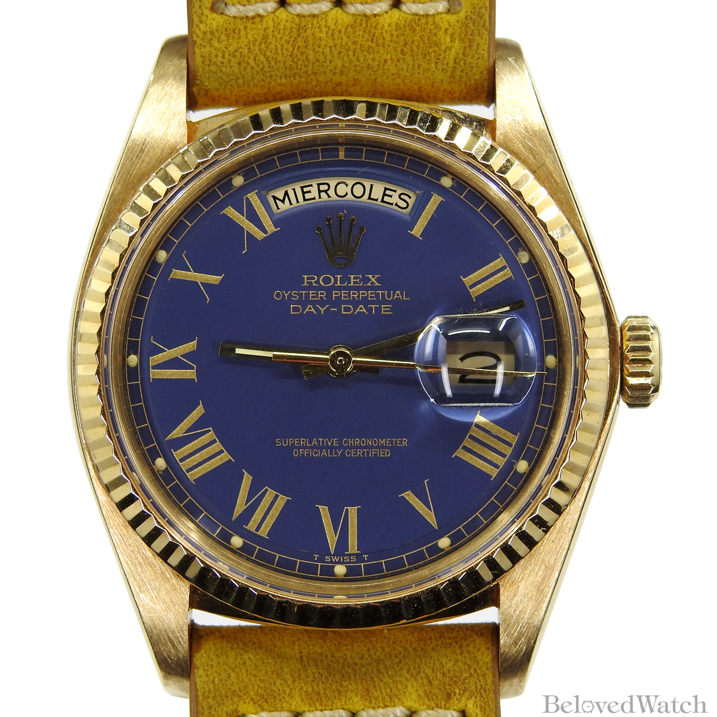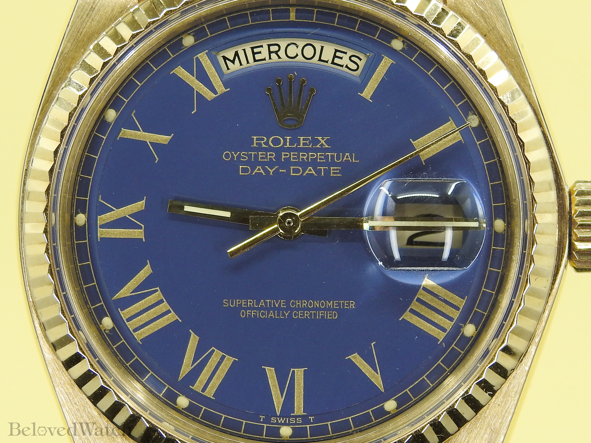 - Blue Buckley dial with refined thin Roman numeral hour markers in mint condition.