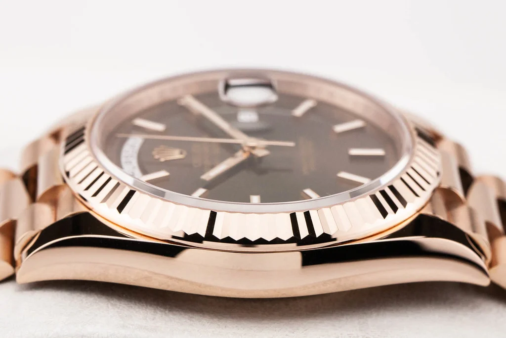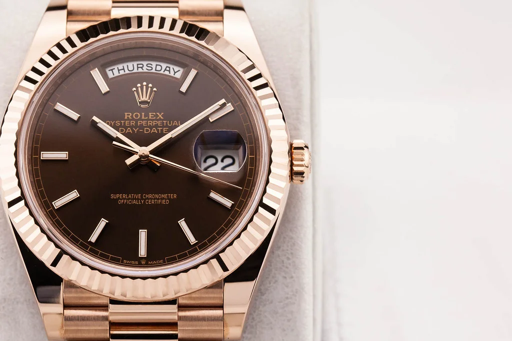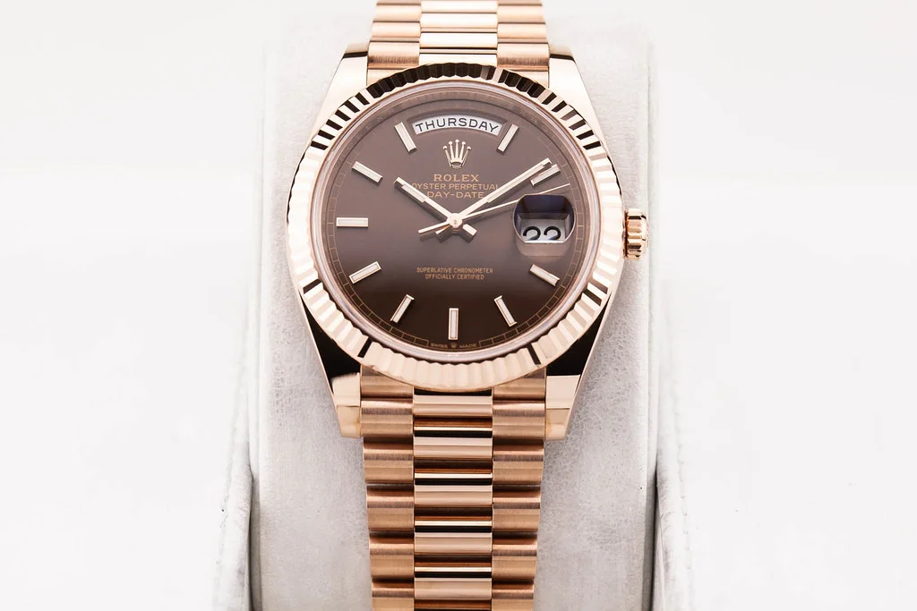 ·Up for sale is a brand new / unworn condition Rolex Day-Date 40mm Everose Gold Chocolate Brown Dial with Fluted Bezel on President Bracelet, reference # 228235 It comes complete with all boxes, papers, booklets, hang tags, and Rolex Warranty Card dated February 2025.