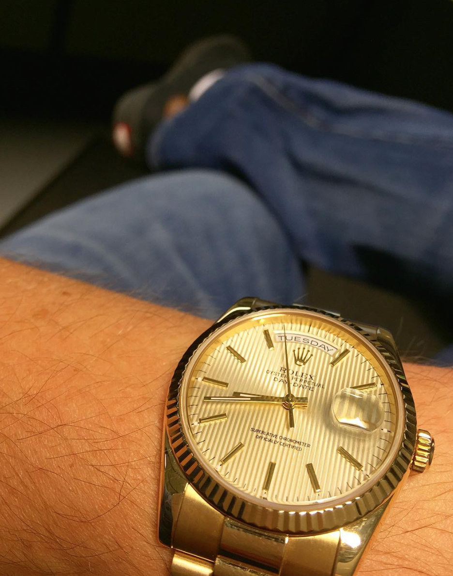 Rolex Day-Date Full-set Ref. 118238 produced in 2001 with a 36mm case made of 18k yellow gold housing a tapestry dial surrounded by an 18k yellow gold fluted bezel. This piece is powered by Caliber 3155.