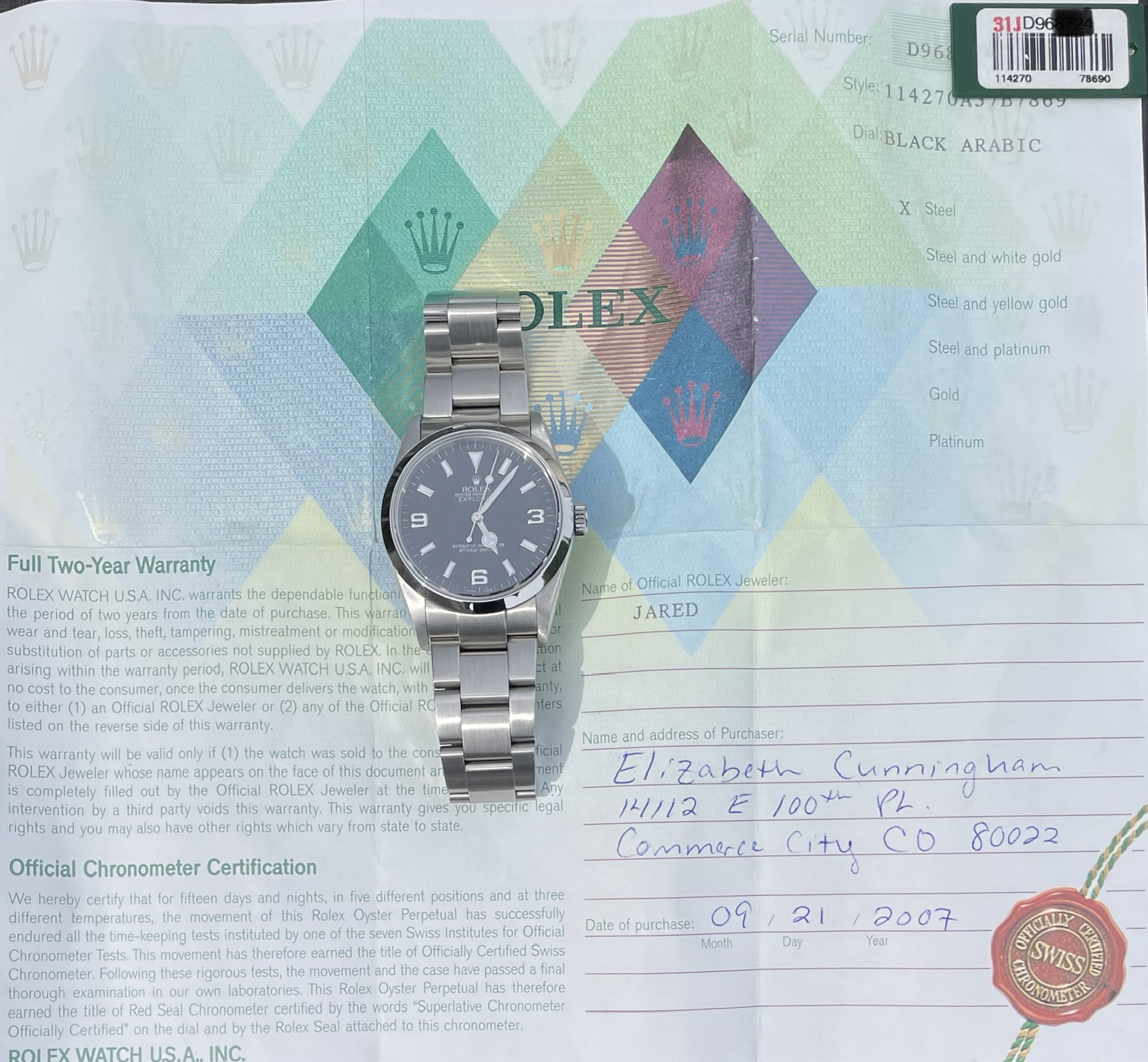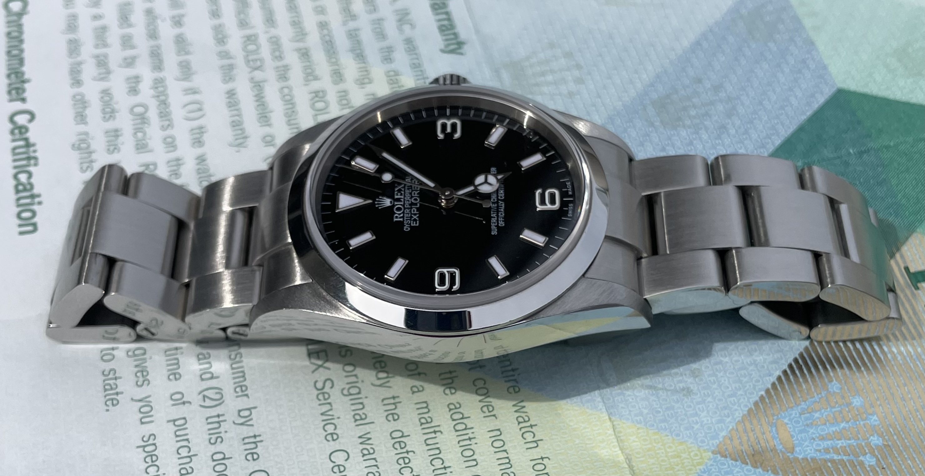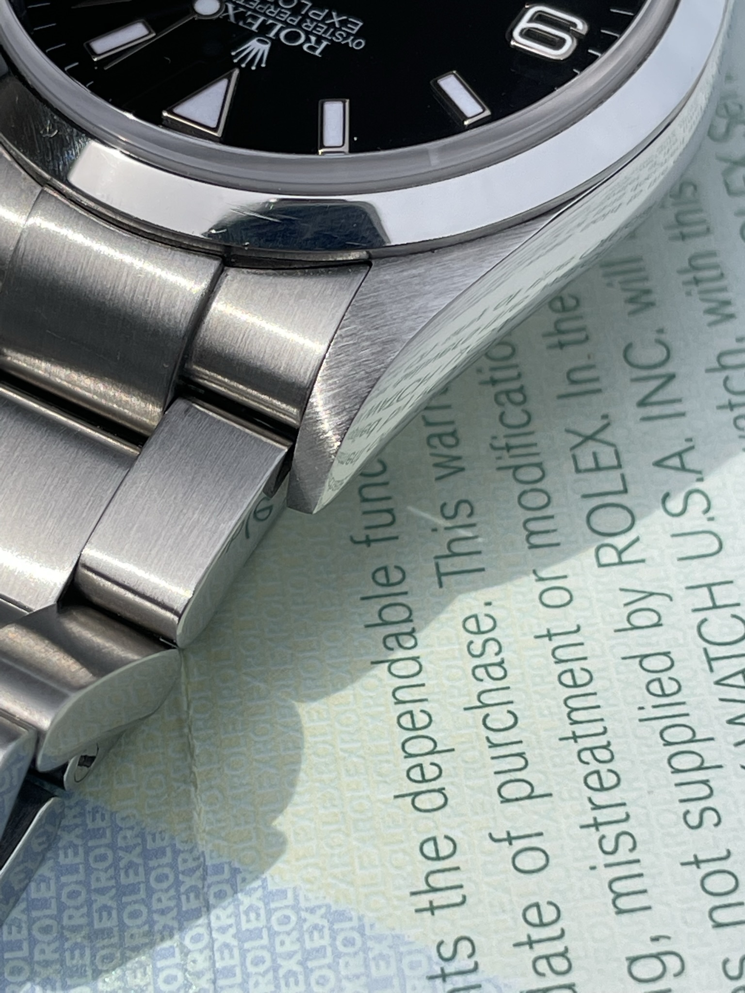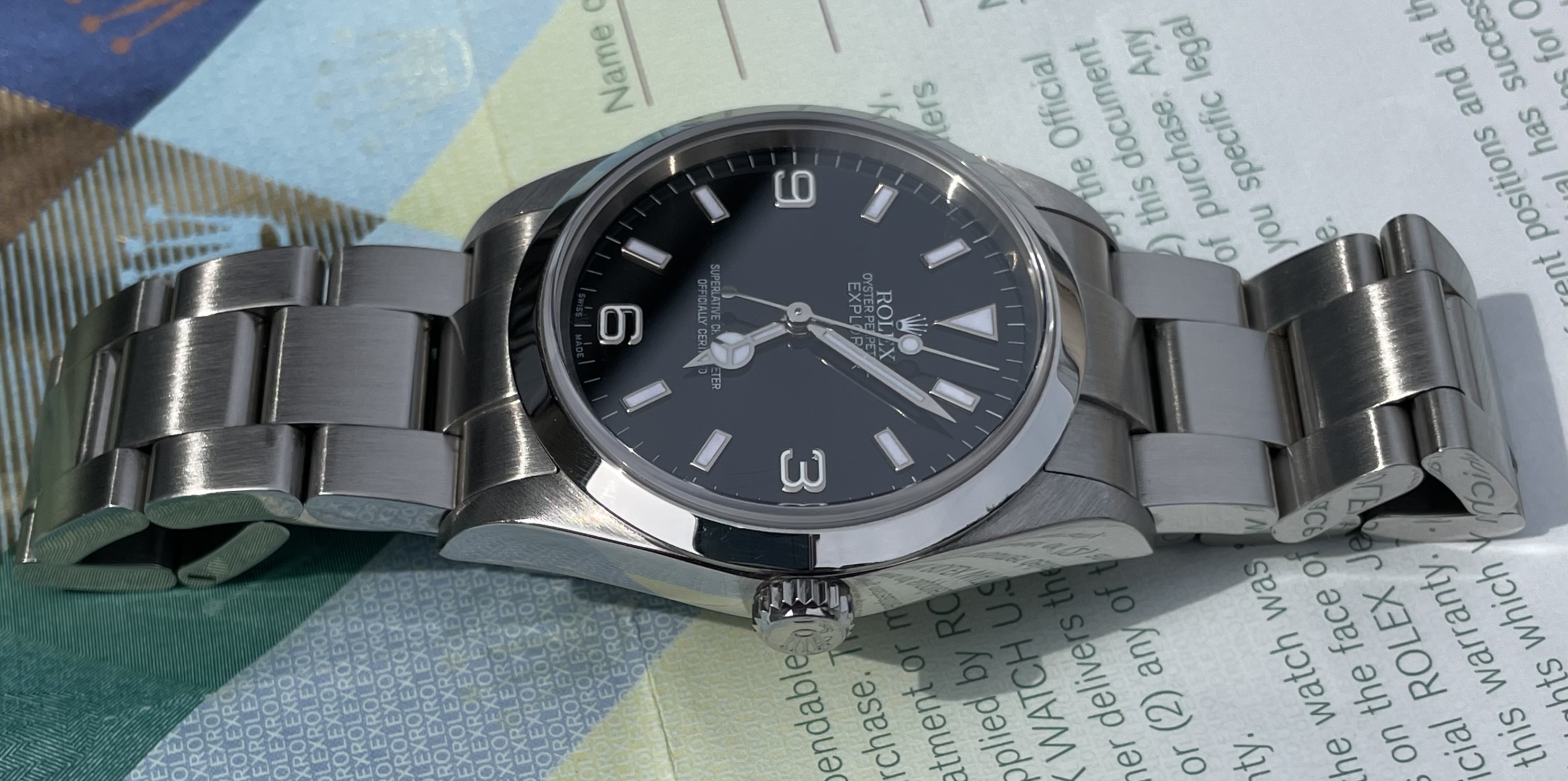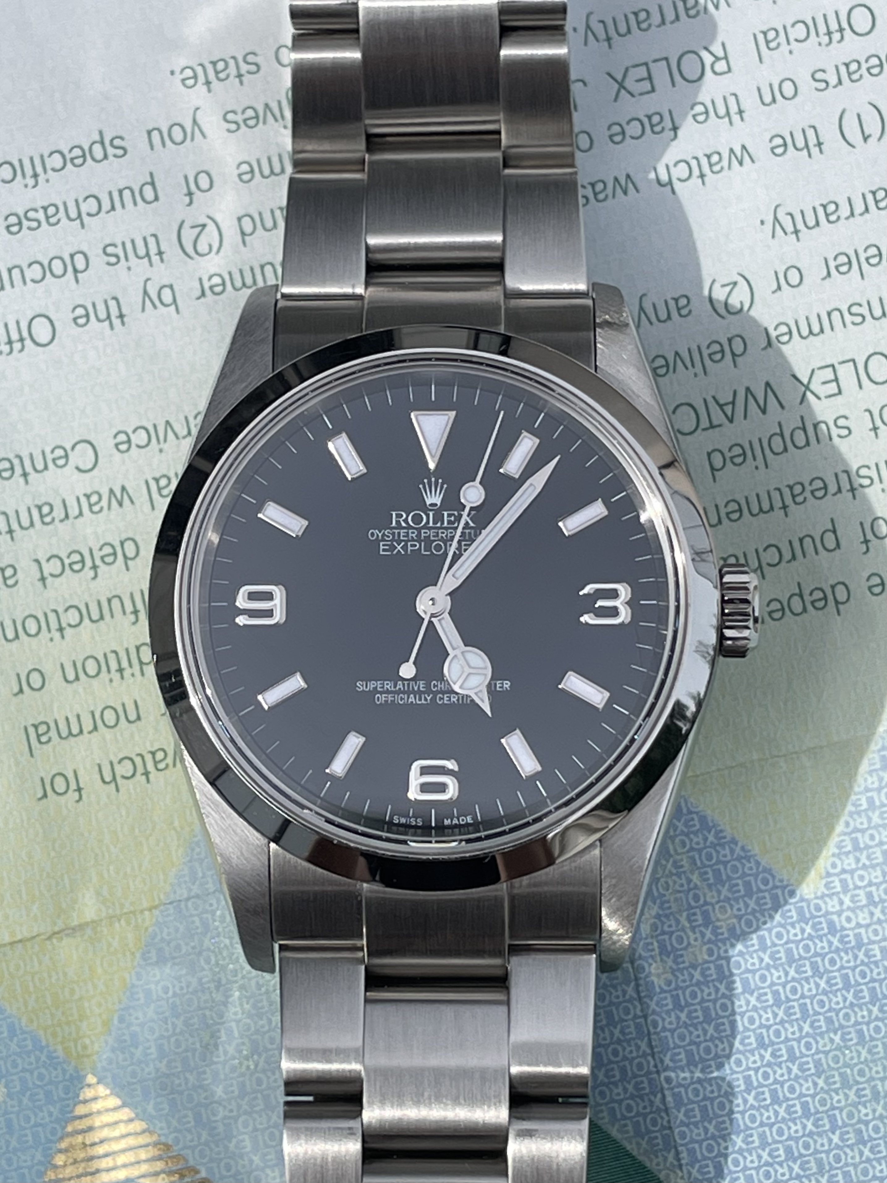 ·Hello up for sale is a Rolex Explorer 114270, D serial with original warranty paper (dated 2007) and matching hang tag. Watch is in excellent appearance with zero stretch in bracelet. Case and bracelet show only superficial signs of wear. Service history unknown but watch is running at time of listing.