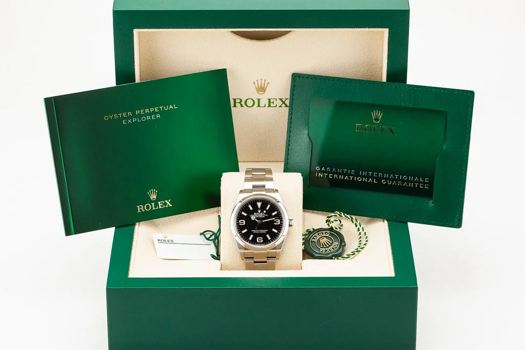 ·Up for sale is an excellent condition Rolex Explorer 36mm Black Dial Oyster Bracelet reference # 124270. It comes complete with all boxes, papers, booklets, hang tags, and Rolex Warranty Card dated August 2021.