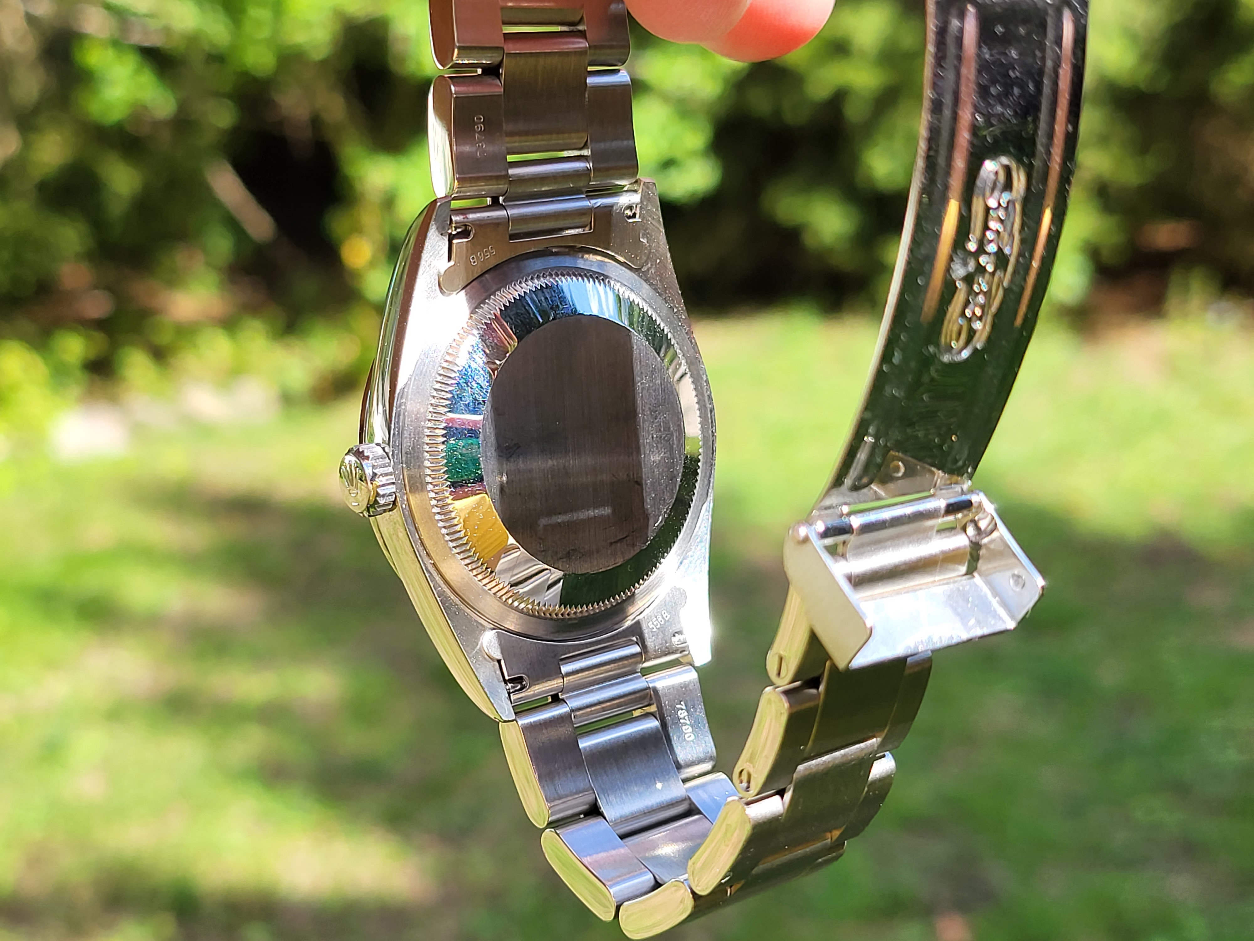 Bracelet is in great shape for its age and shows minimal stretch. The crystal has a tiny mark right around the 9. No holes case.