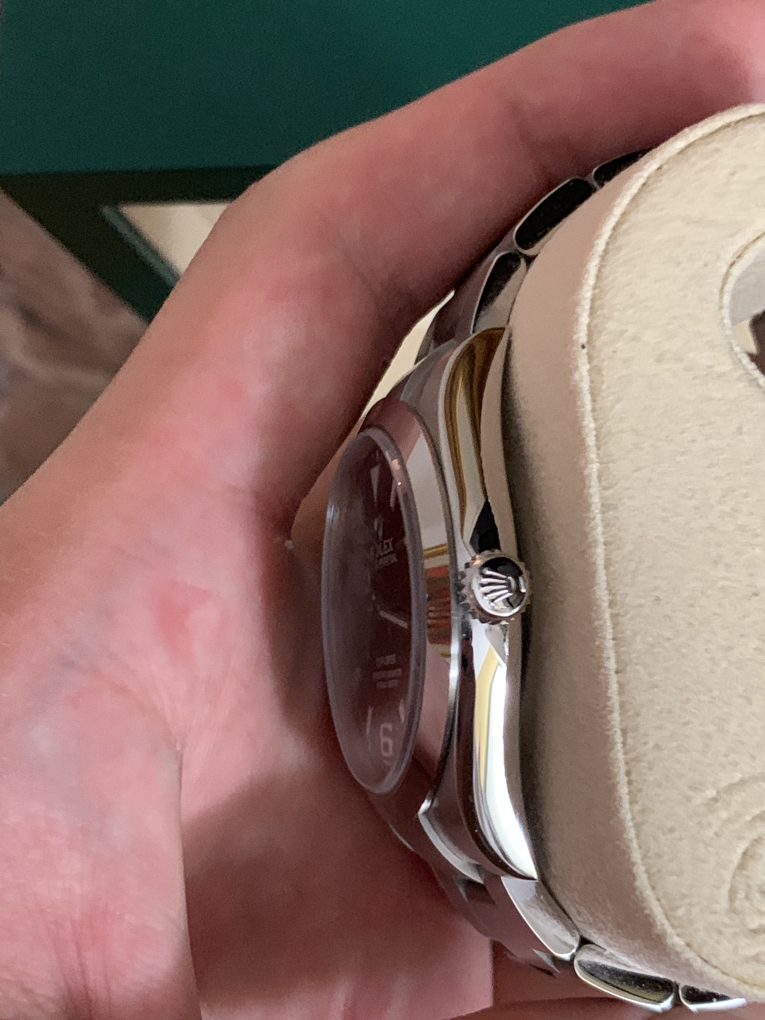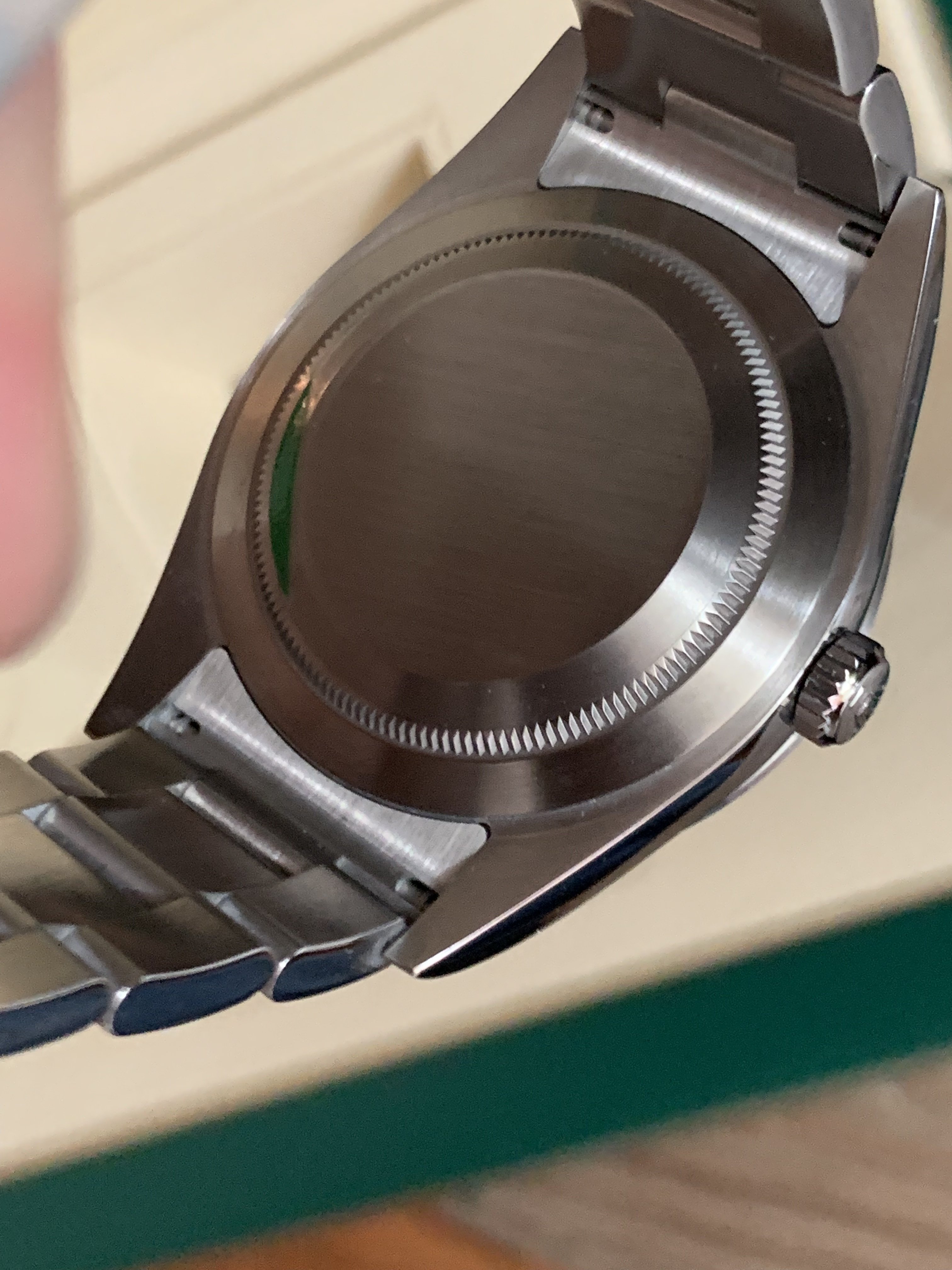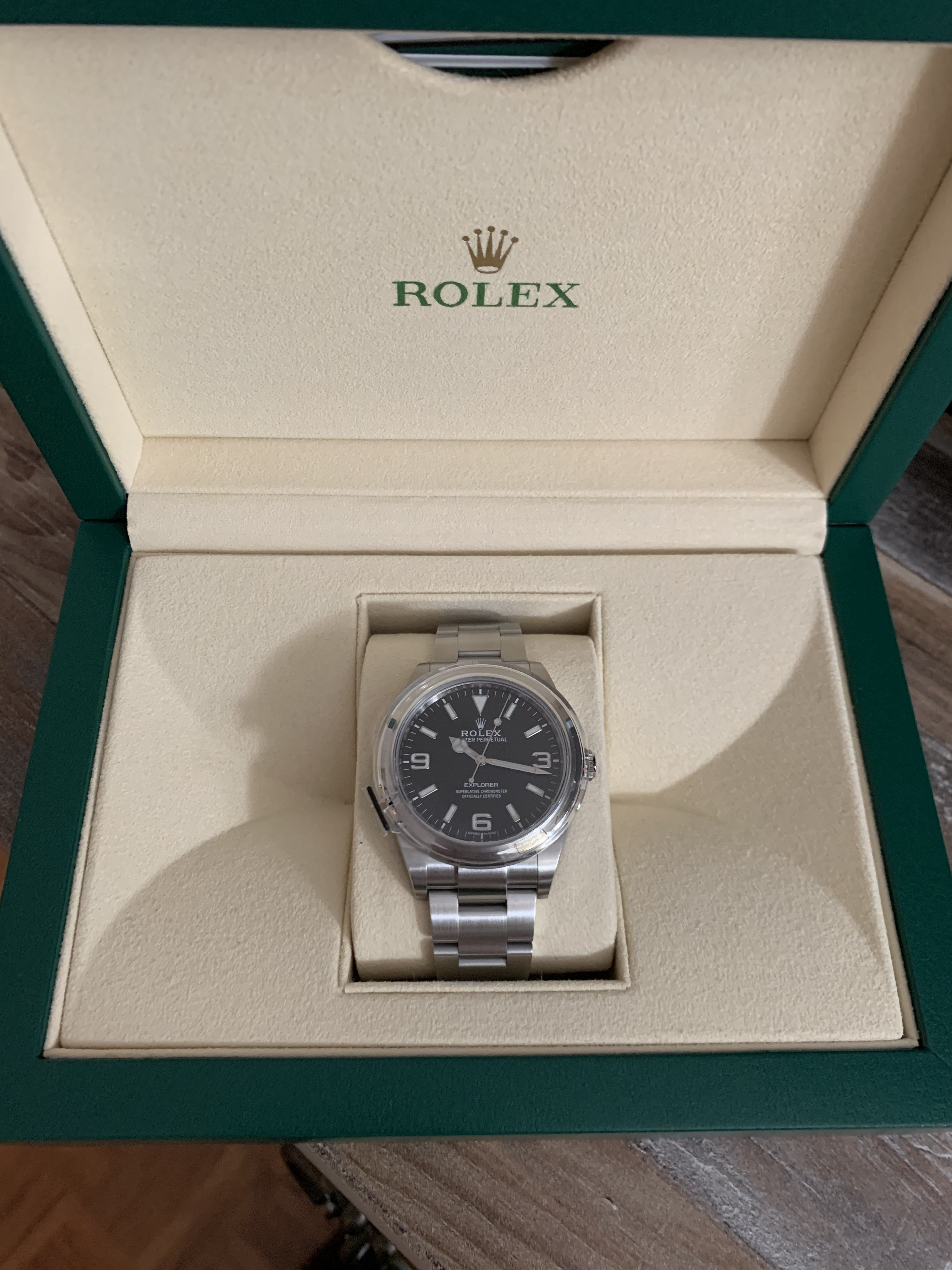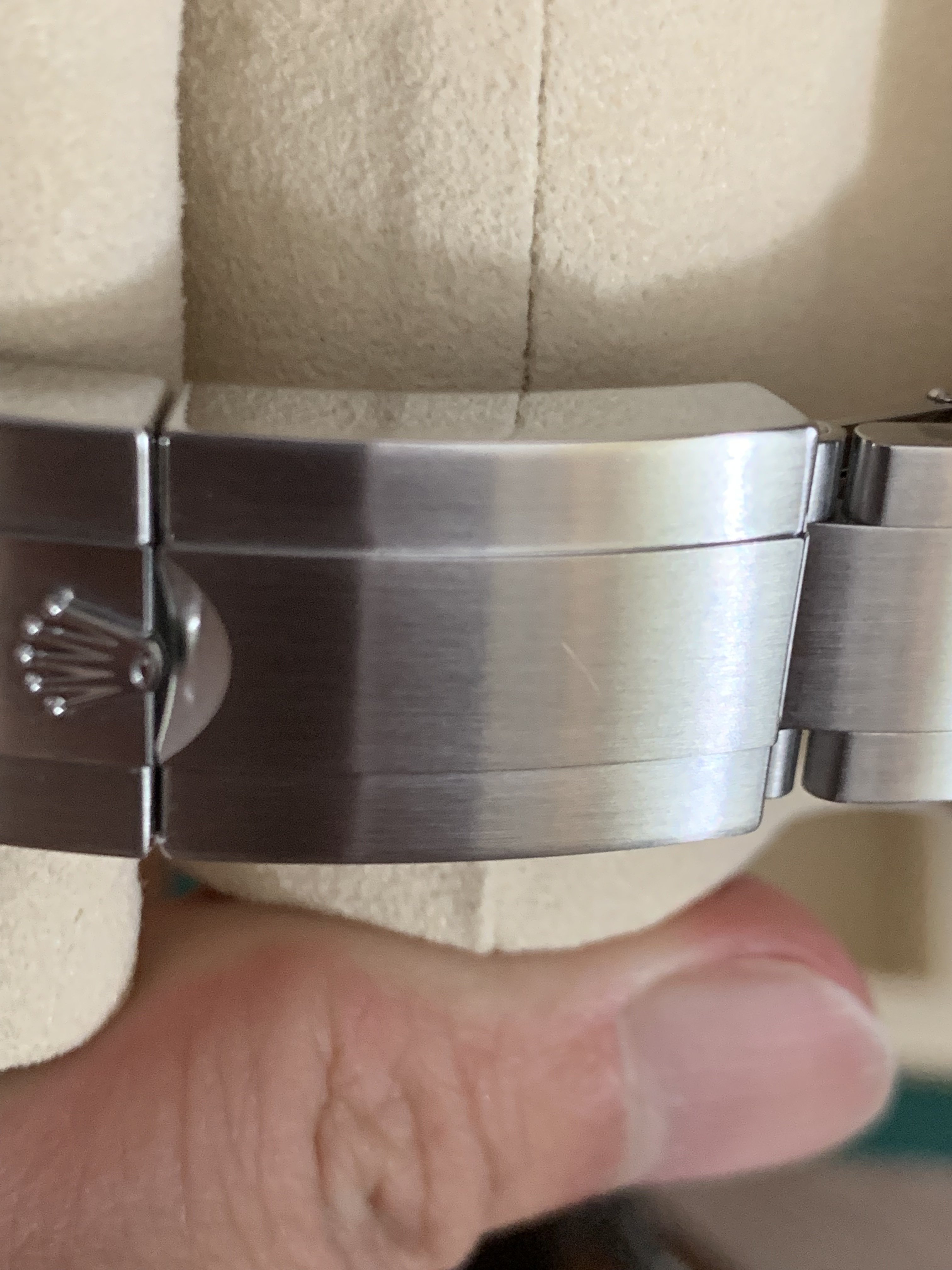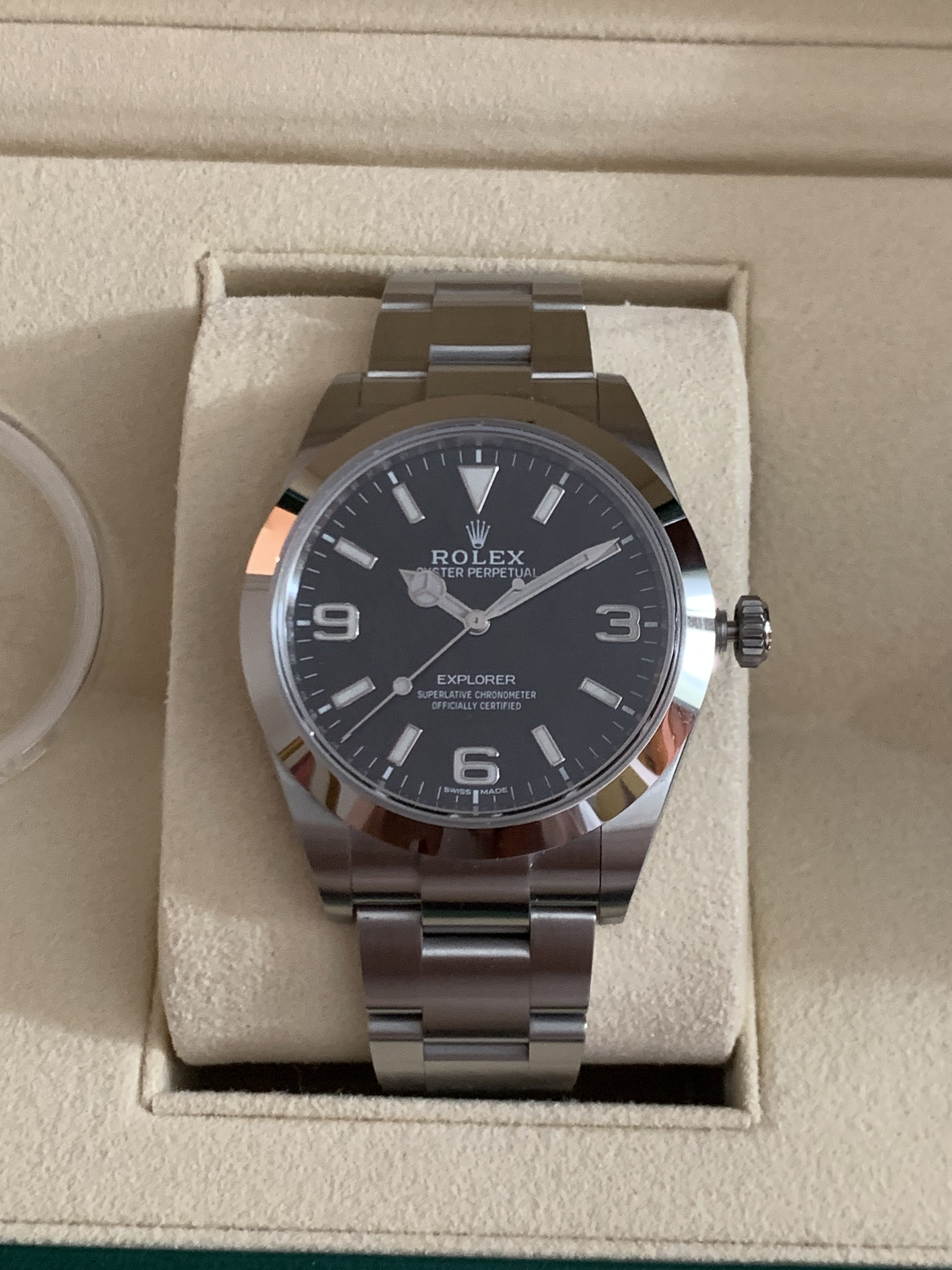 I have for sale a full set 2019 Rolex Explorer 214270 with an all lume dial (so-called Mark II). It was carefully worn for about 4 months. I have highlighted the marks on the case that I could find with the pics below. The bezel is in perfect shape and the marks on the side of the caseband and clasp are very light.
