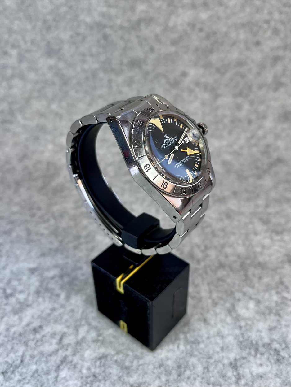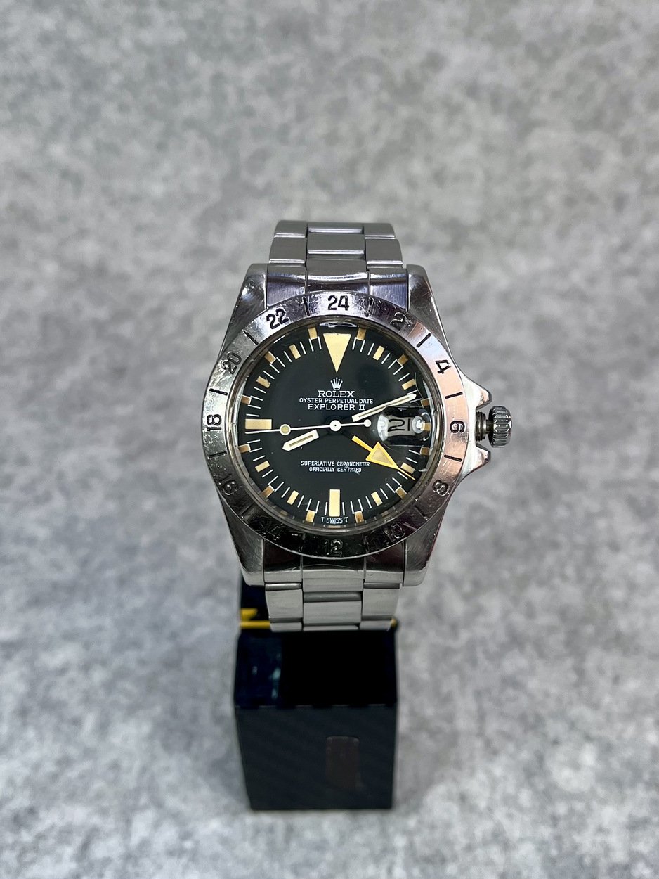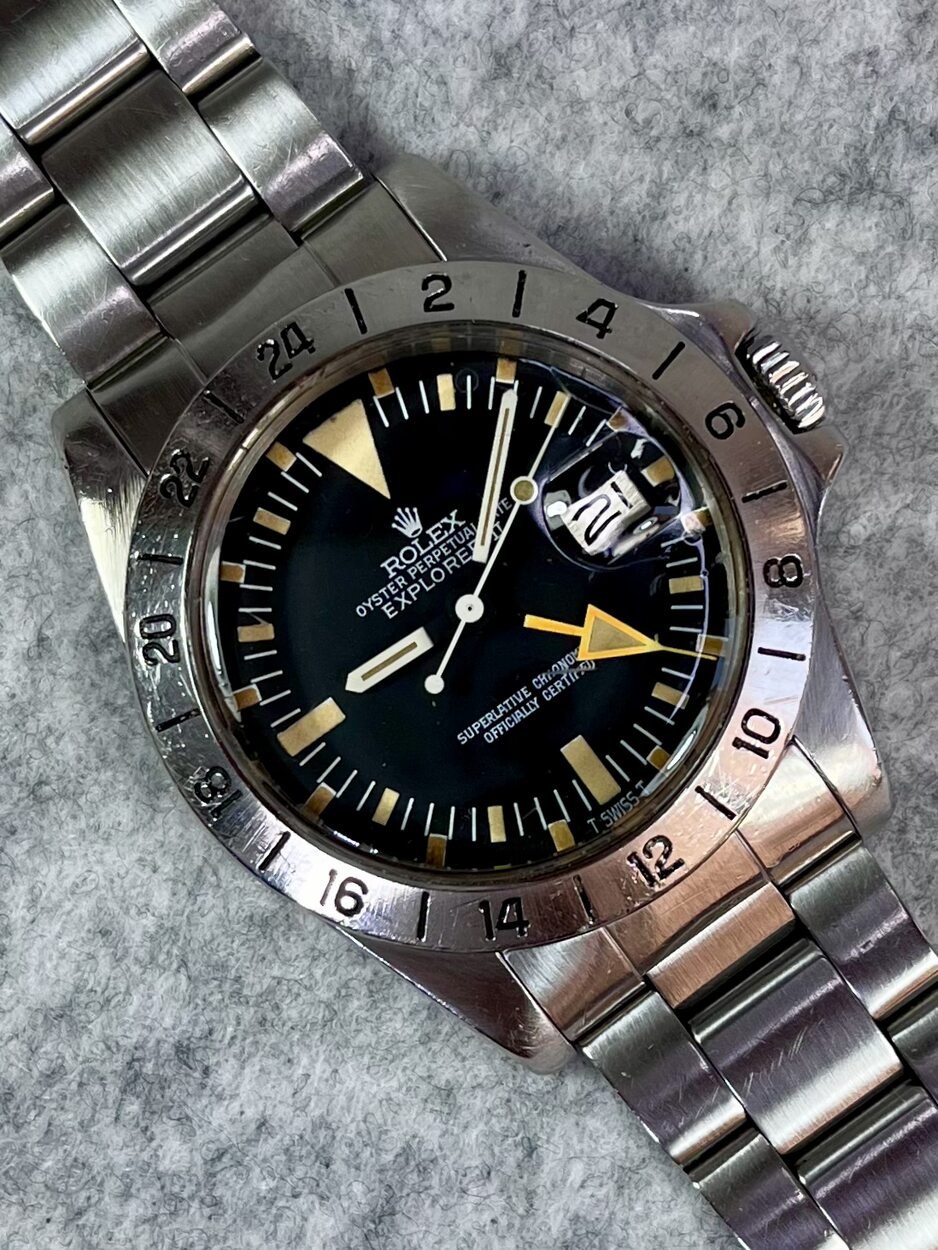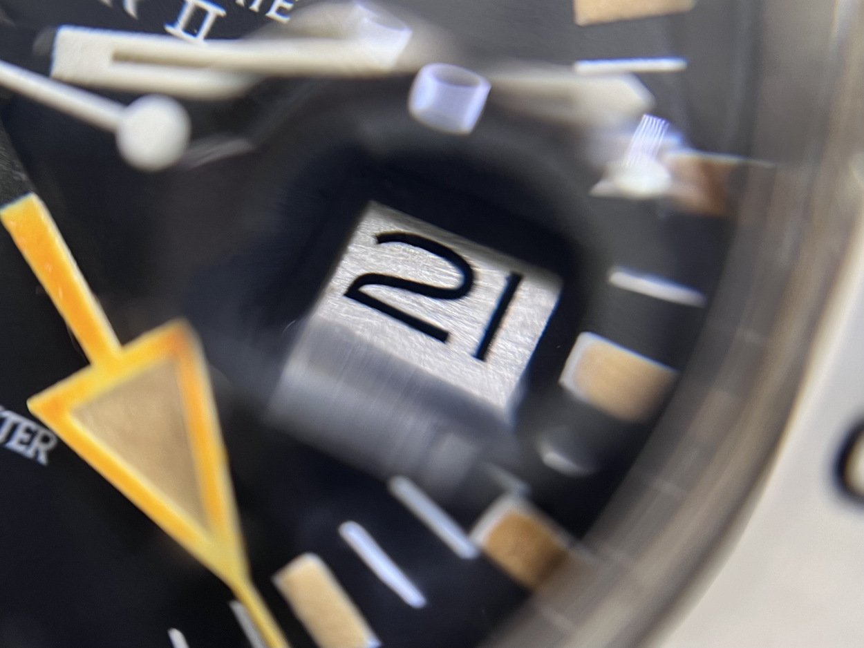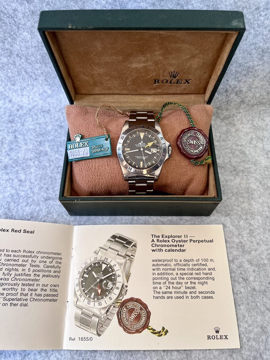 I have a 5 Million serial, 1978 MK2 Rolex Explorer II 1655 ‘Steve McQueen’ with the more sought after ‘Rail Dial’- where the letter ‘C’ in ‘Chronometer’ is perfectly aligned with the letter ‘C’ in ‘Certified’ in the ‘Superlative Chronometer Officially Certified’ text on the dial. Also dubbed the ‘Freccione dial, with its large luminous hour markers and orange 24-hour hand, it’s particularly iconic and sought after by enthusiasts.