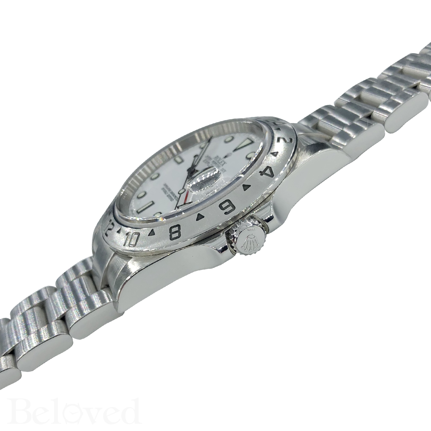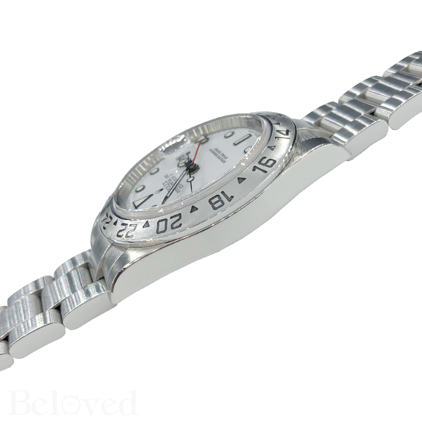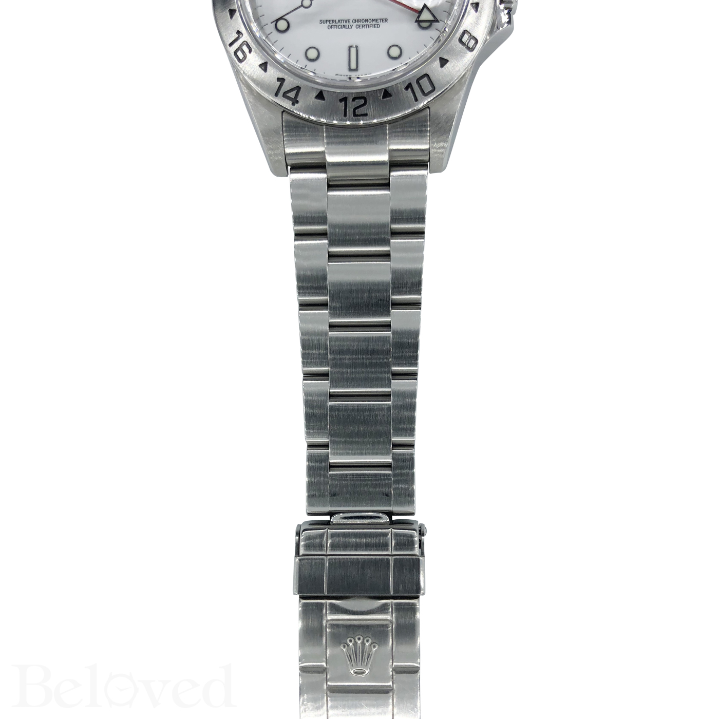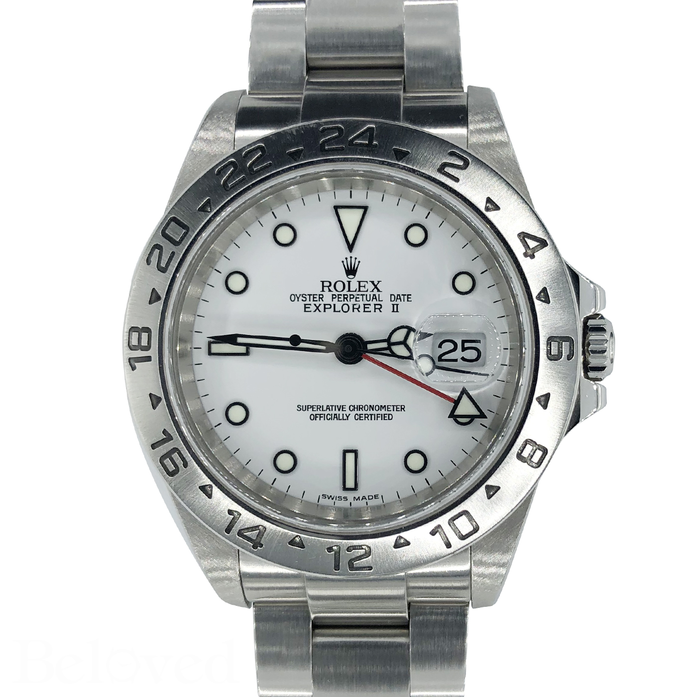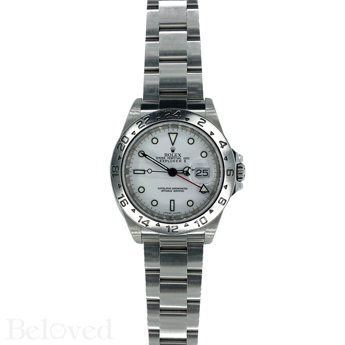 ·Manufactured by Rolex. This Rolex is a model 16570 T. This Rolex Explorer II 16570 T was produced in the year 2004. On a condition scale ranging from fair to unworn, this specific 16570 T is in excellent condition. The Dial is stark white with black surrounds round lume hour markers and black print / red GMT hand. The Rolex Explorer 16570 T with stainless steel case is 40mm in diameter. This Explorer II is secured with a Rolex Oyster bracelet and flip lock Rolex clasp which is in stainless steel. This Explorer II is powered by an automatic Rolex Caliber 3186.
