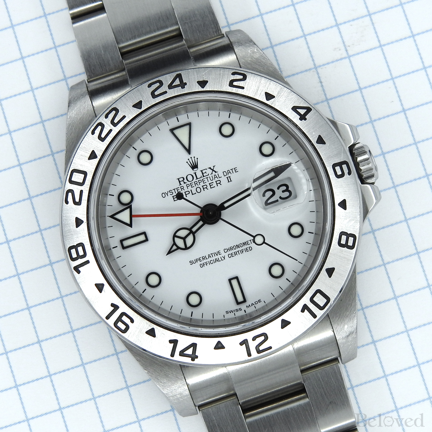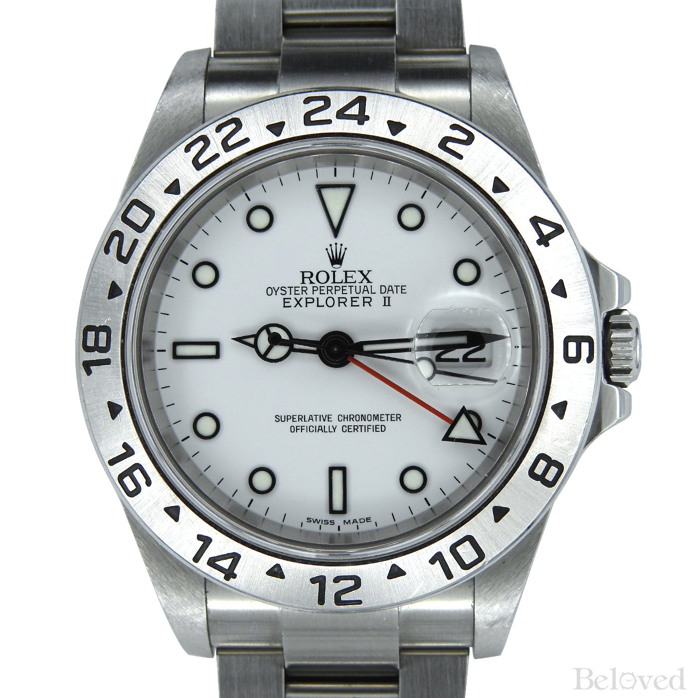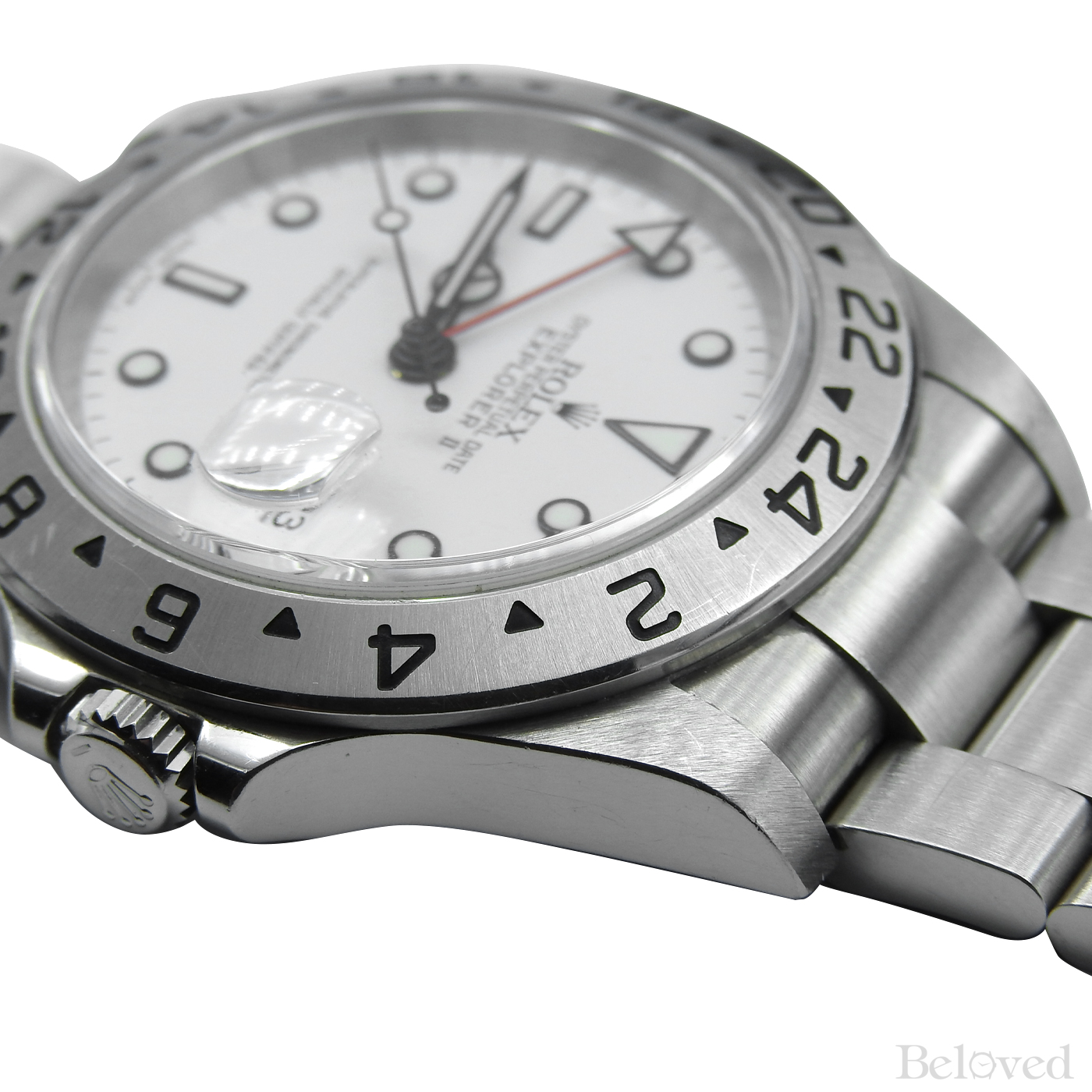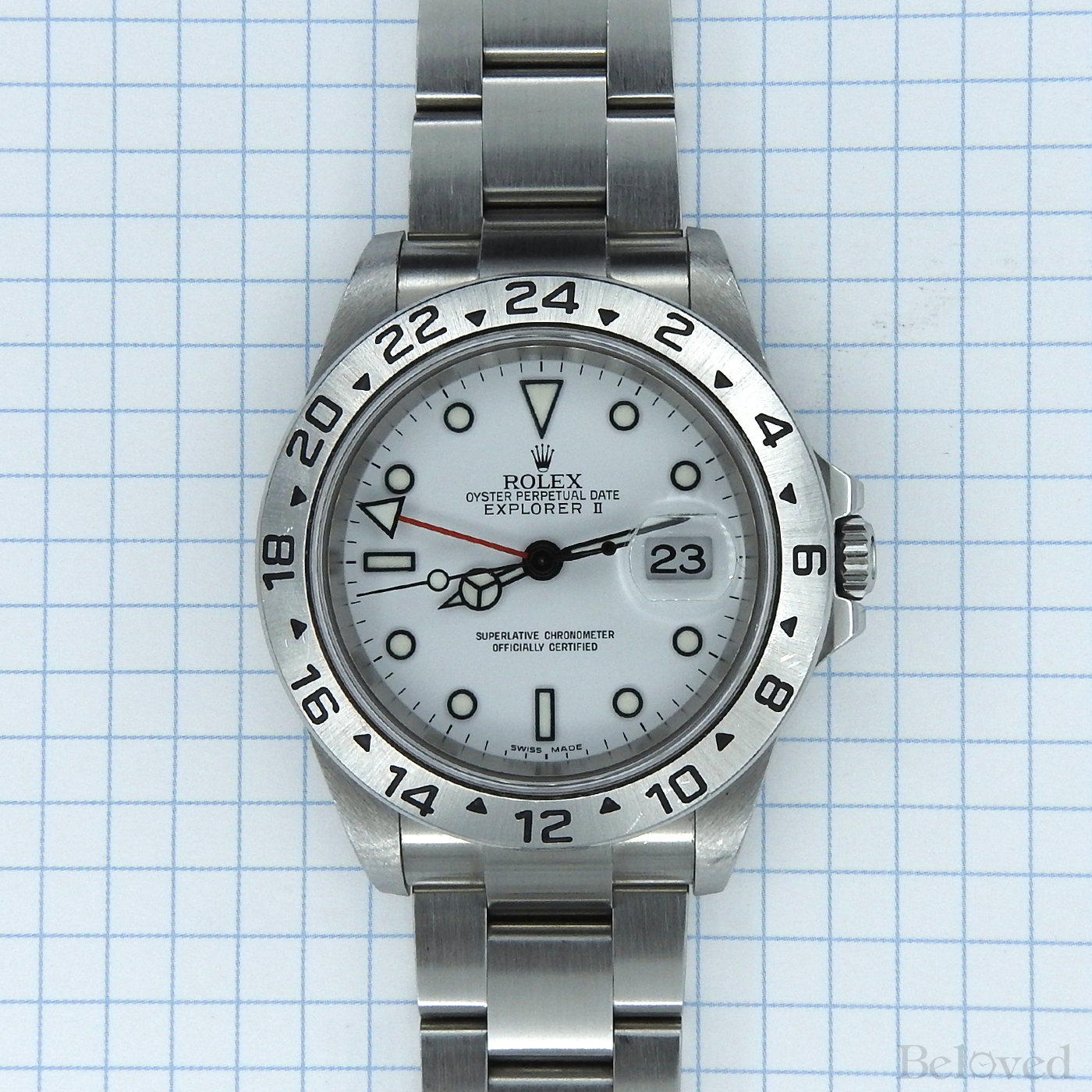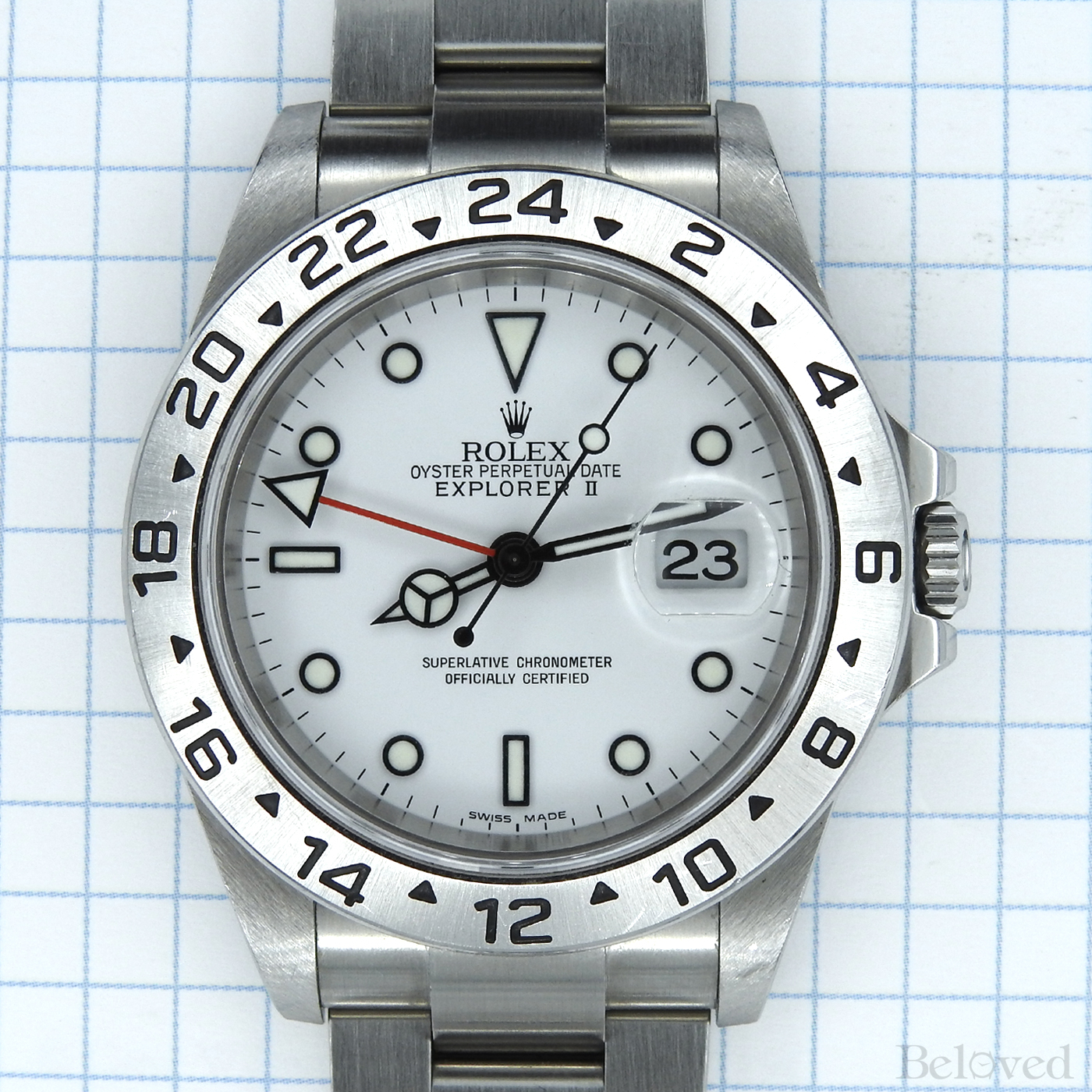 Posts 993 Likes 1,870 MPWATCH ·Aug 8, 2020 Rolex Explorer II Model 16570 Produced in the year 2007 (Z series) Near Mint unpolished condition Bracelet "slack" test rating 9.5/10 (near mint) 40mm in diameter Powered by an automatic Rolex Caliber 3185 Steel SEL (Solid End Link) Oyster bracelet with half-size flip-lock clasp $7,850