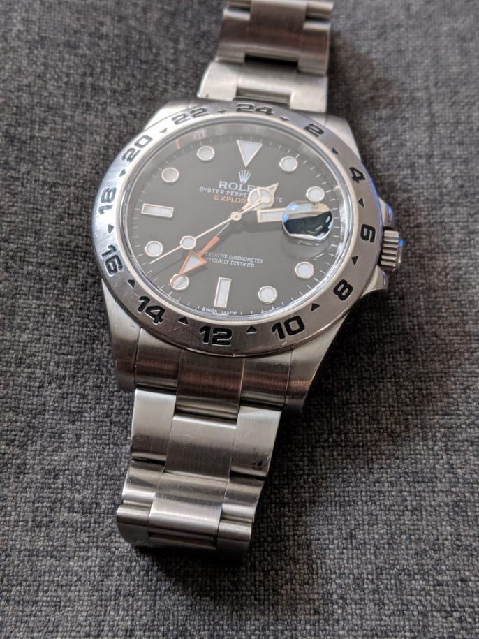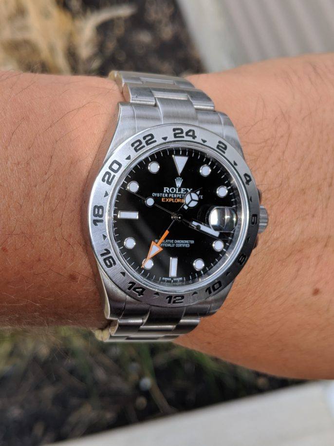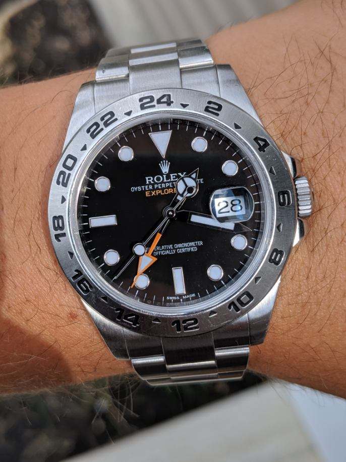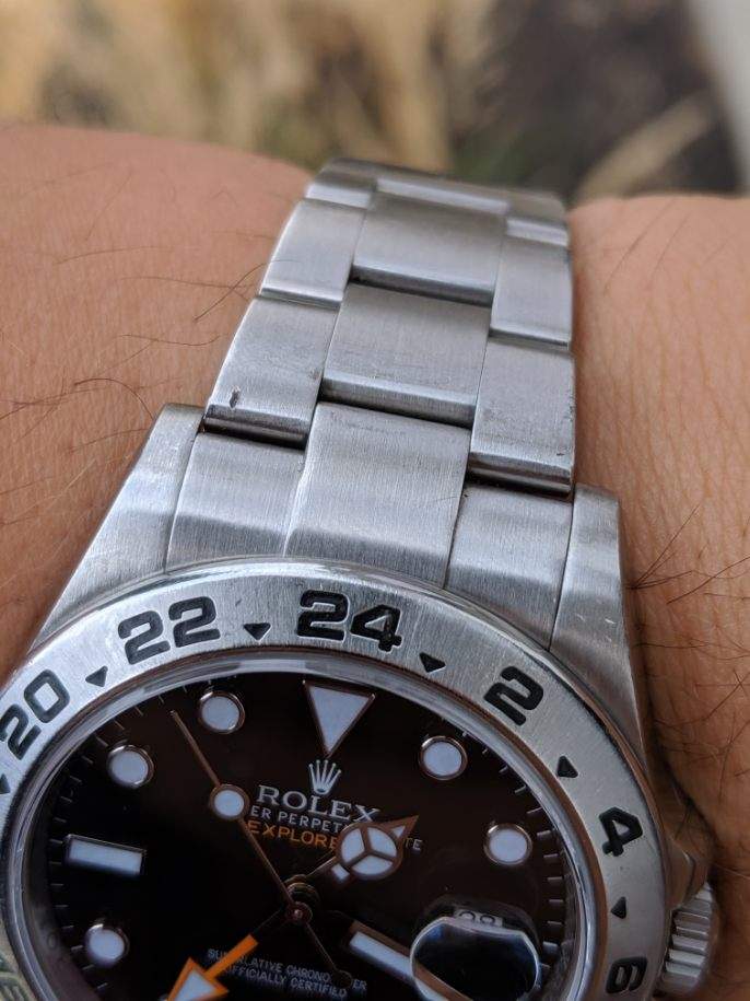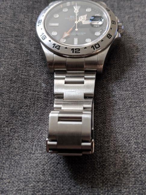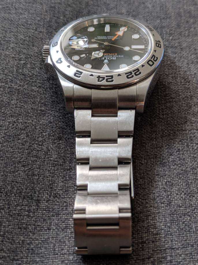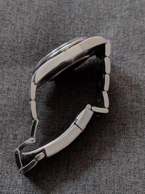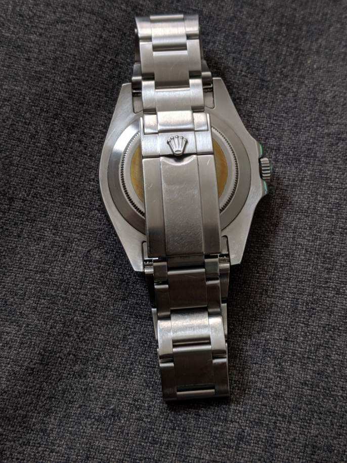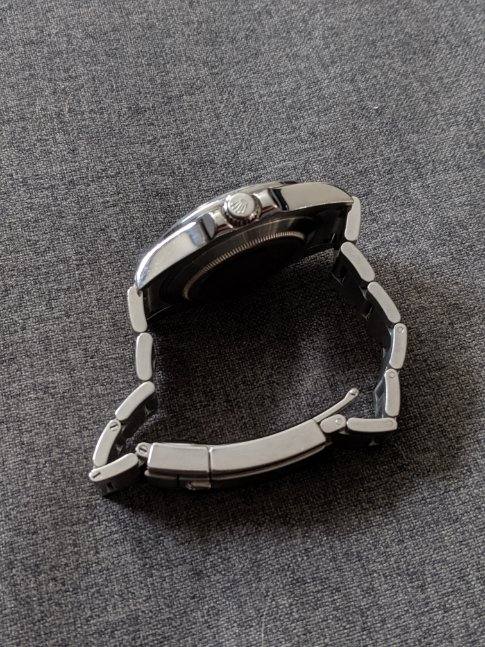 ·Catch and realease for me. Watch is keeping accurate time, but service history unknown. Winds smoothly and is in good condition. 11 links, will comfortably fit a 7.4 or slightly larger wrist. One ding on the bracelet on the 12 o'clock side as pictured, otherwise normal wear from daily use. Some scuffs to the finish. One small flea bite on the edge of the crystal at 9 o'clock. Hardly noticable and doesn't show up in photos well. Watch is offered with the head and bracelet. No box or papers. Authenticity guaranteed. Only interested in trading down for a 14060, 16610, 16800, or 168000 close to the $6000 mark.