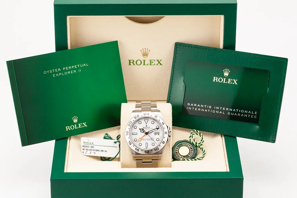 ·Up for sale is an excellent condition Rolex Explorer II 42mm Polar White Dial, reference # 226570. It comes complete with all boxes, papers, booklets, hang tags and Rolex Warranty Card dated September 2022.