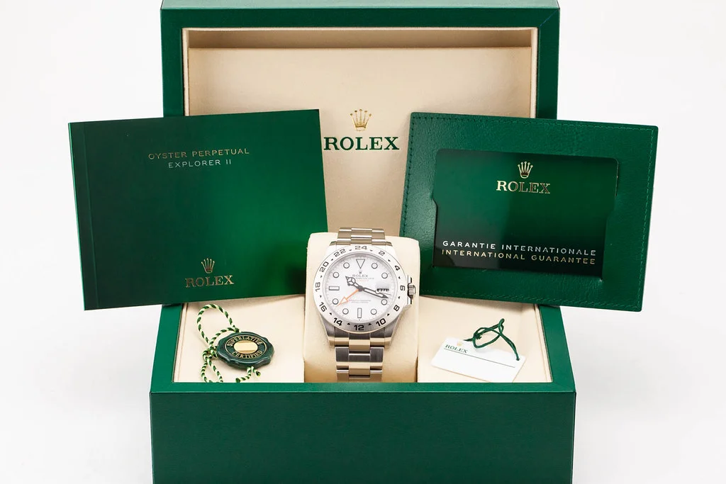 ·Up for sale is a brand new Rolex Explorer II 42mm Polar White Dial, reference # 226570. It comes complete with all newly redesigned boxes, papers, booklets, hang tags, and Rolex Warranty Card dated August 2025.