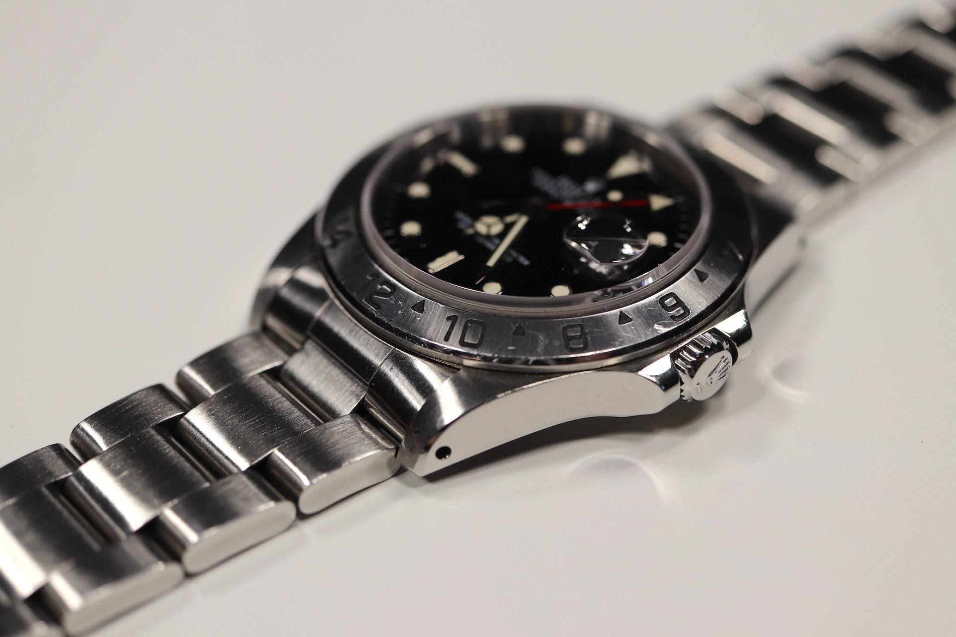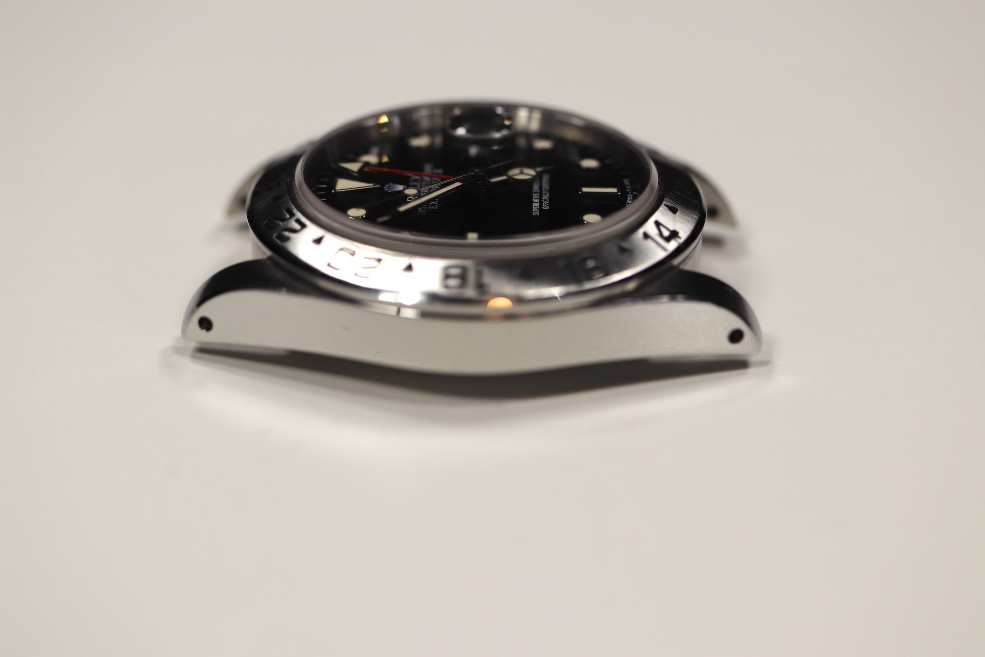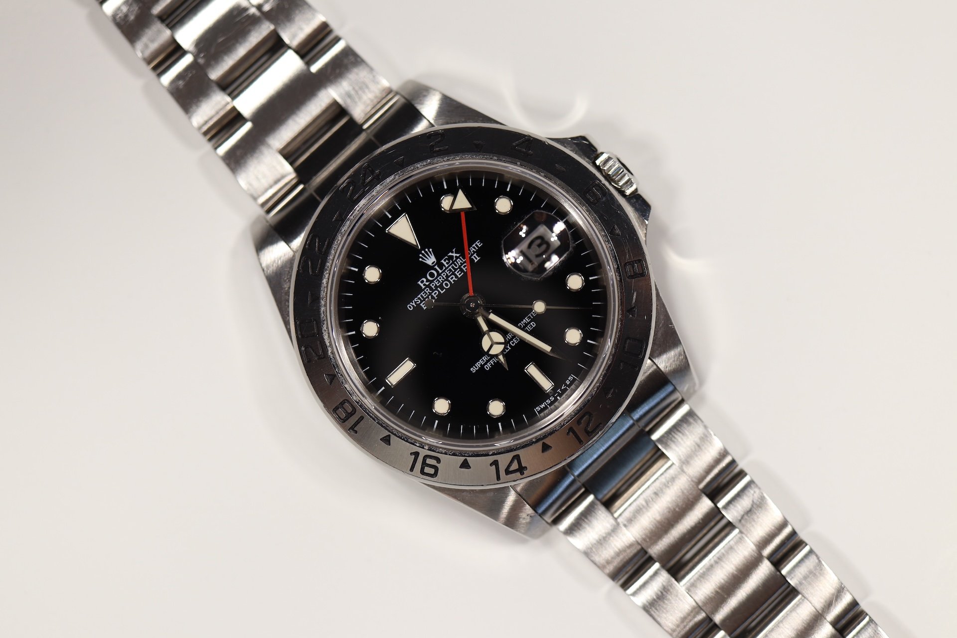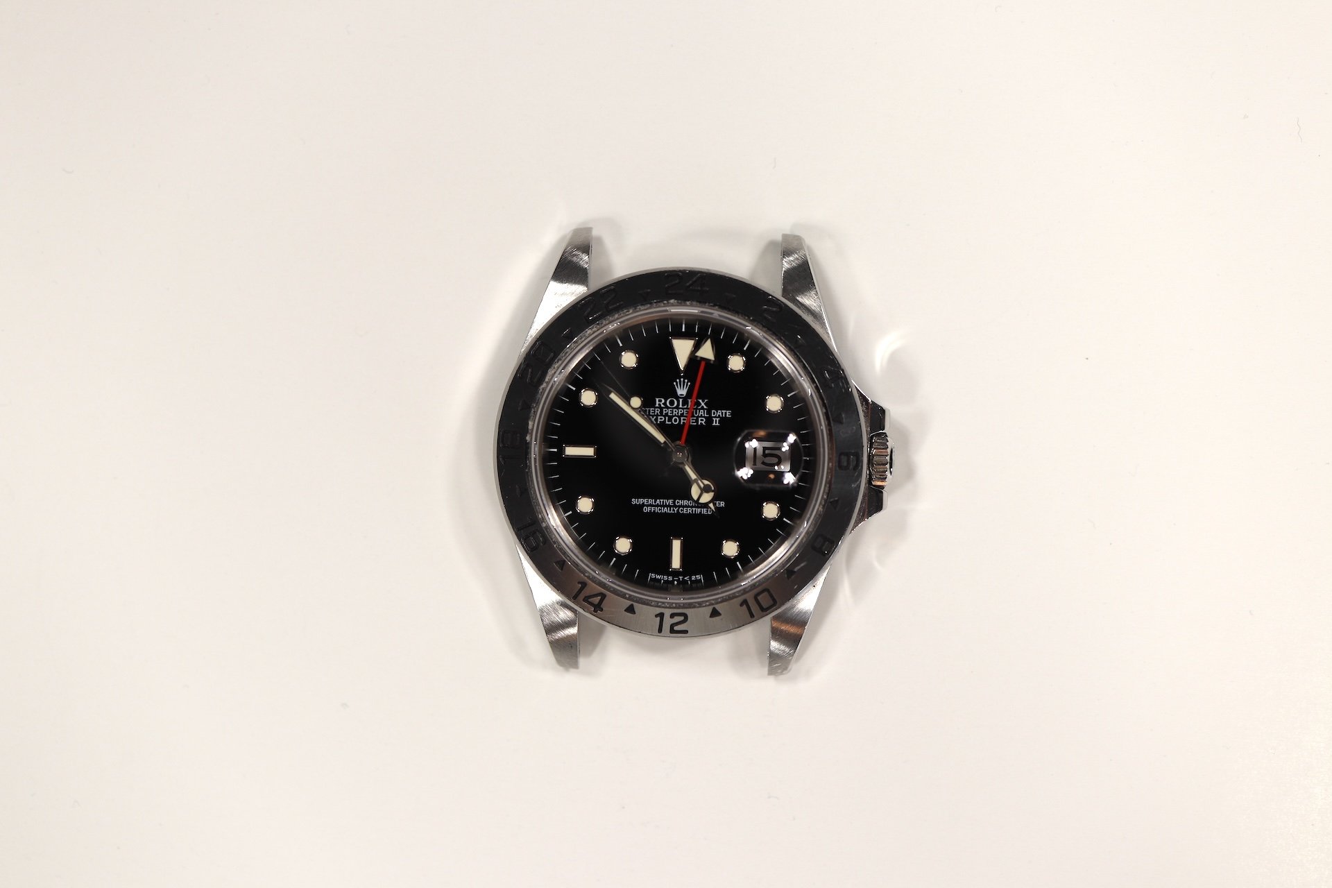 ·For sale, I have a Rolex Explorer II ref. 16570. Equipped with the Rolex 3185 Movement. The case measures 40mm without the crown. It's an E serial number dating back to 1990. The watch is working well, and all functions are working correctly. Service history is not available. The watch has aged very nicely, and the Patina is a rich, creamy colour.