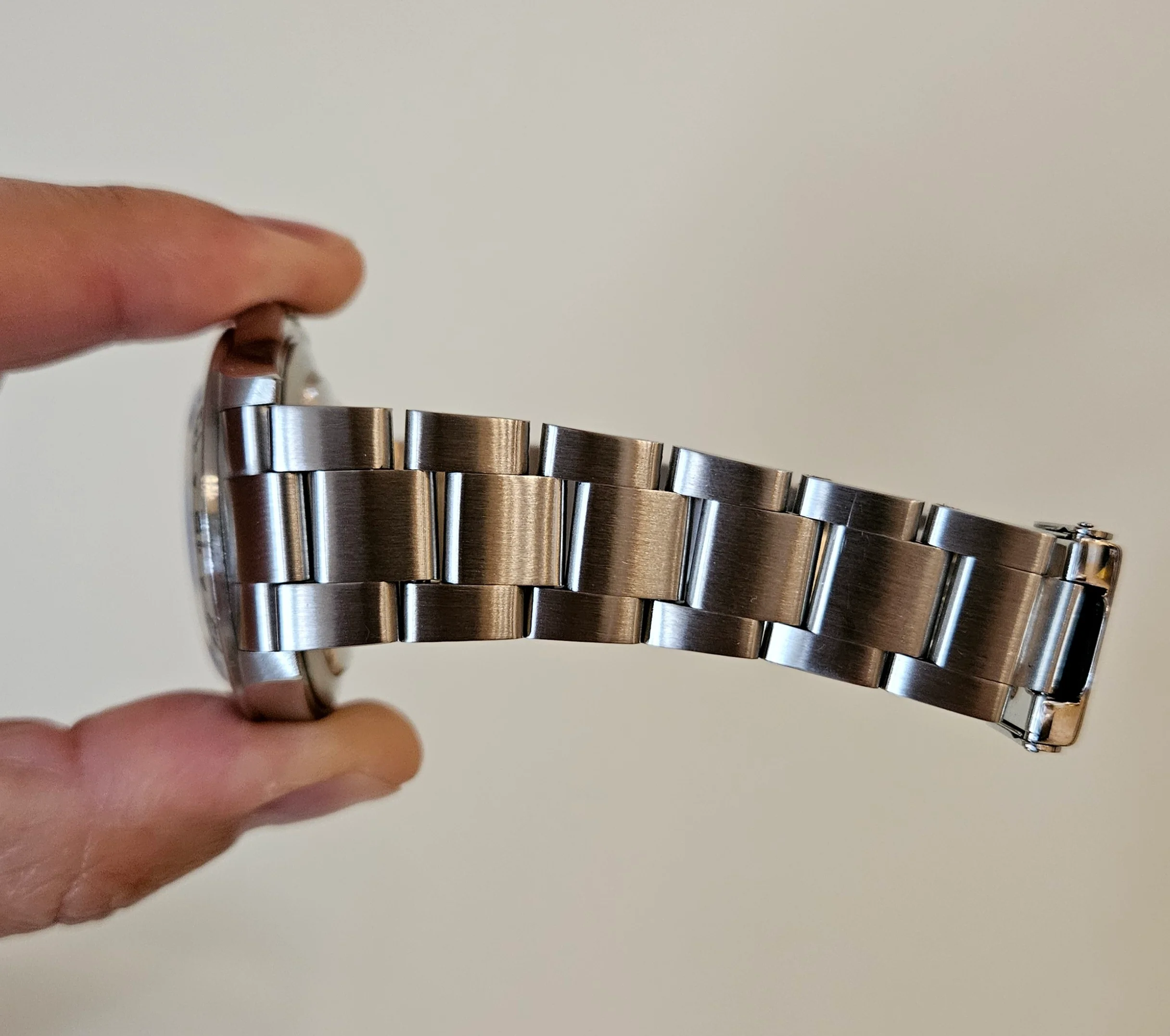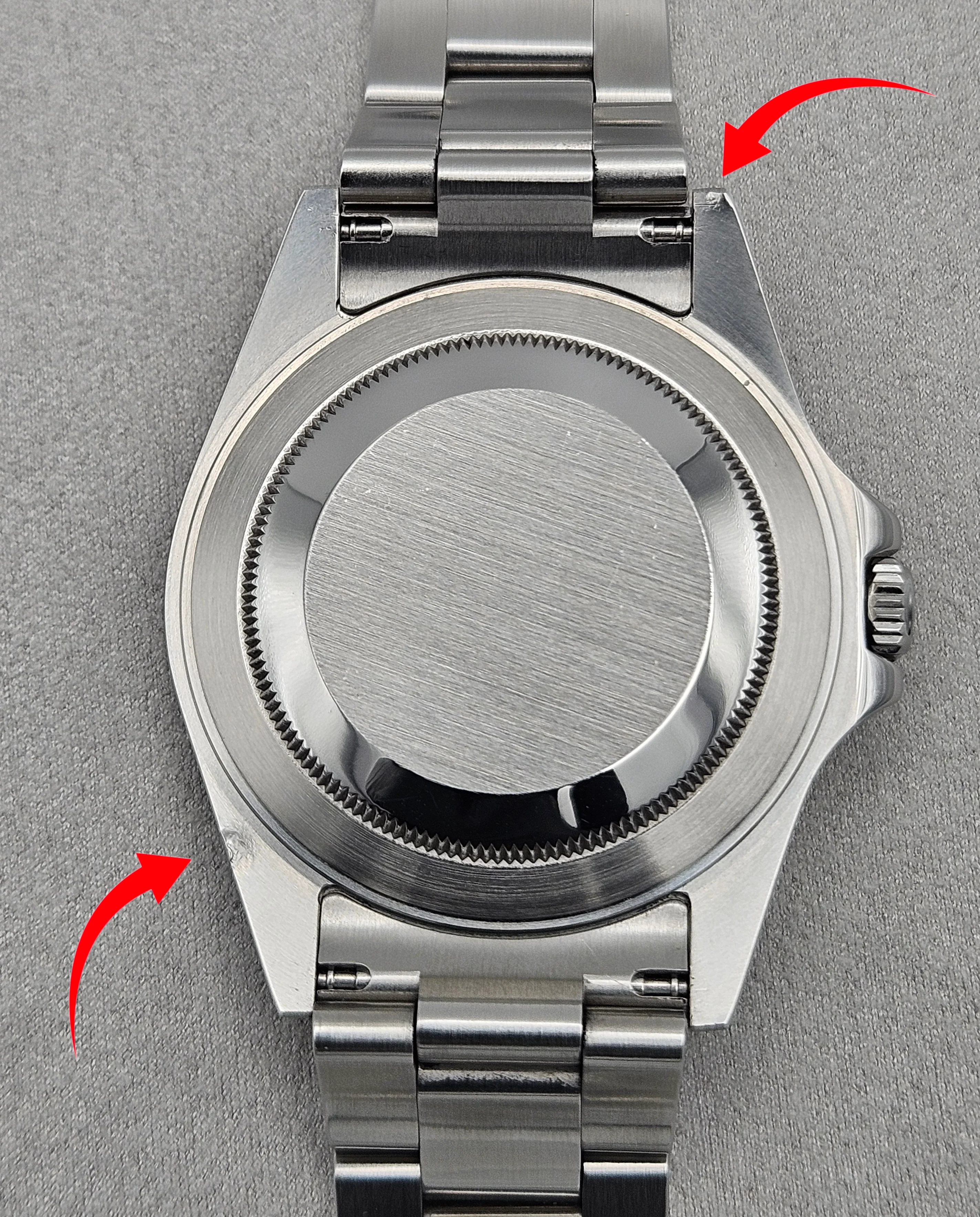 Aesthetic Condition: The (double oval) laser etched crystal is free of any chips, scratches or scuffs. Double oval laser etching denotes the newest style anti-reflective coating on the crystal. Small hairline scratches on the bezel, and fading of the enamel on some of the bezel numbers. The lugs are in exceptional condition with zero blemishes to note. Two small irregularities (bumps?) on the bottom of the case. These are not visible when the watch is on your wrist.
