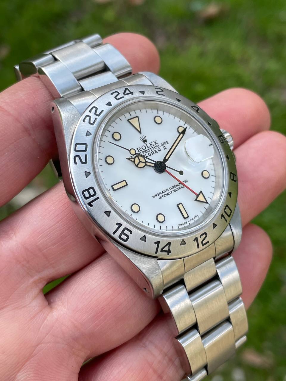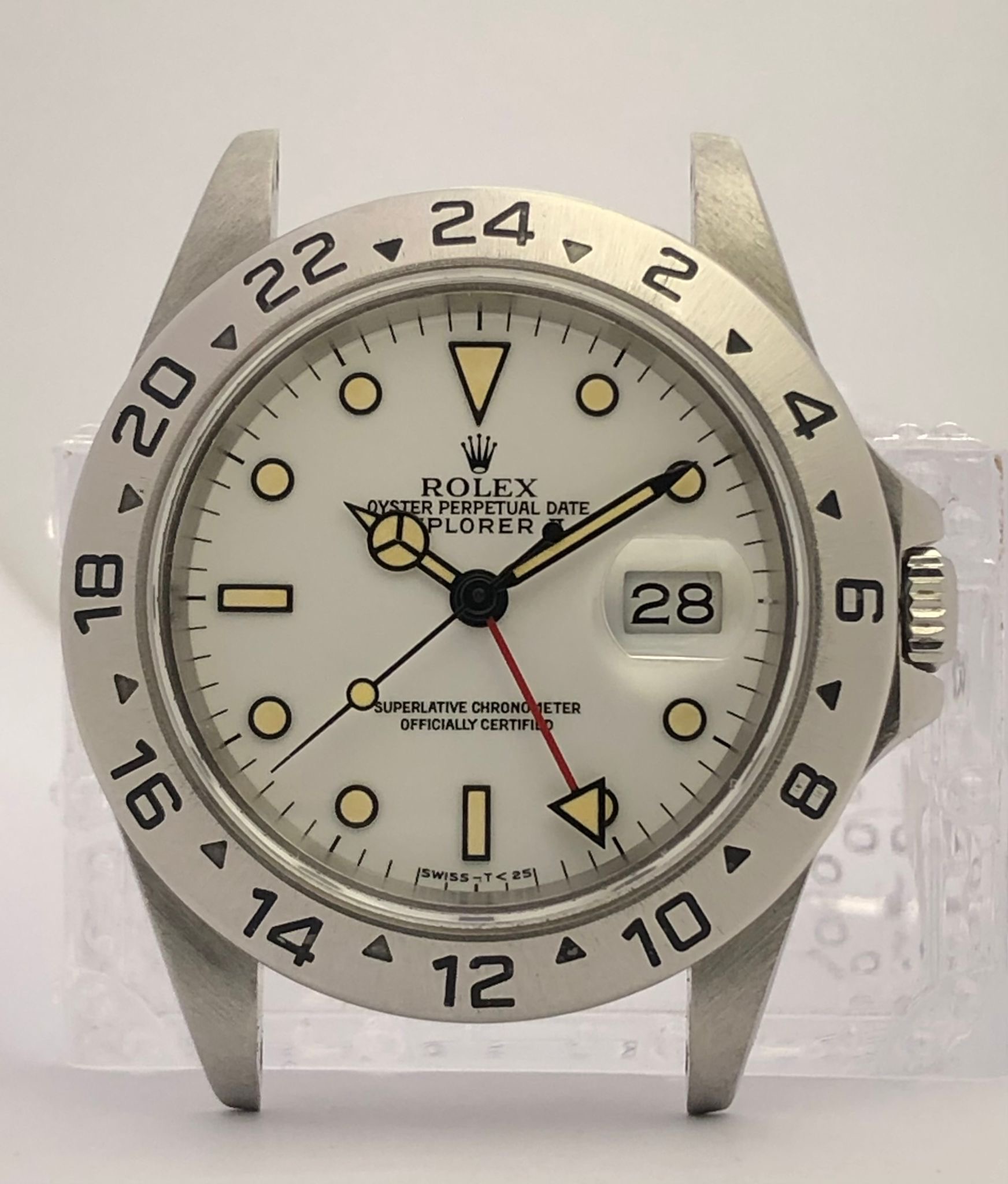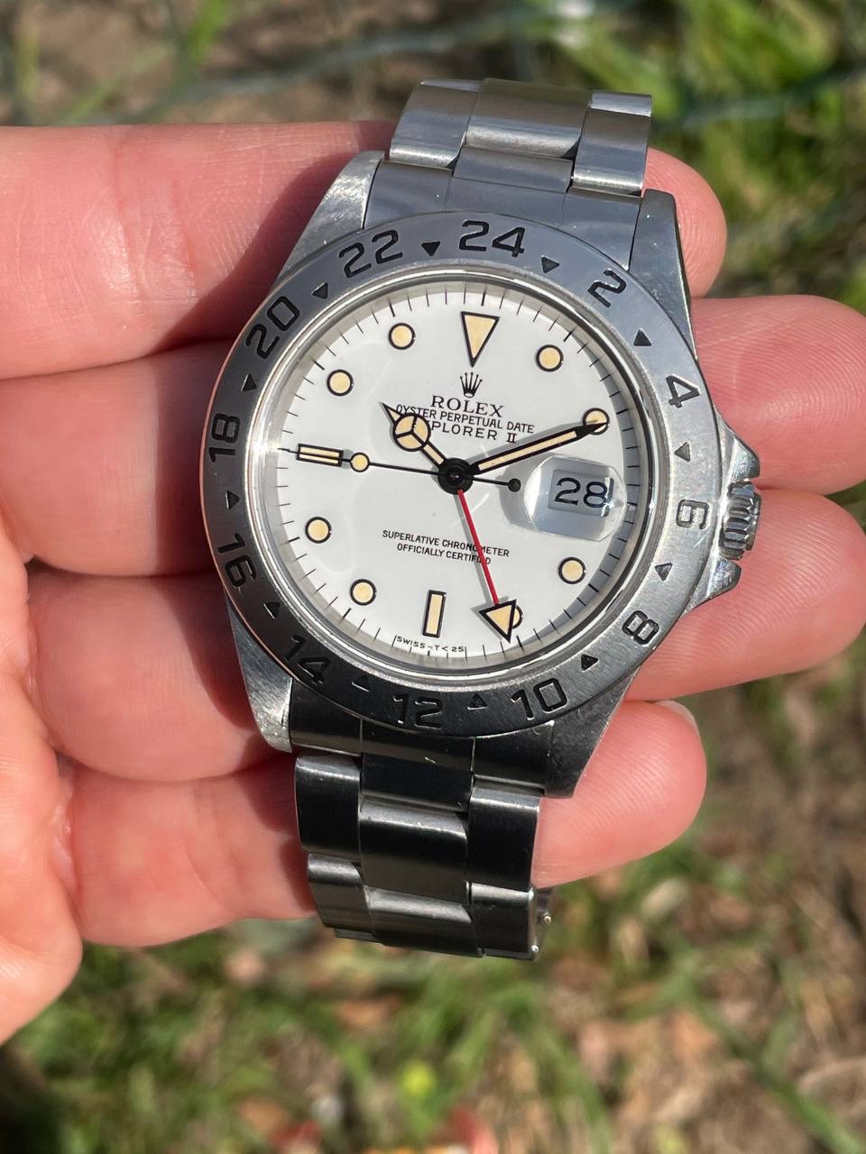 This is an exquisite example of the rarest of the Explorer II ref.16570: the "corn grain dial" (from the Italian "chicchi di mais"), nicknamed this way because in this specimen the tritium of the hour markers ages taking a yellow cream patina.