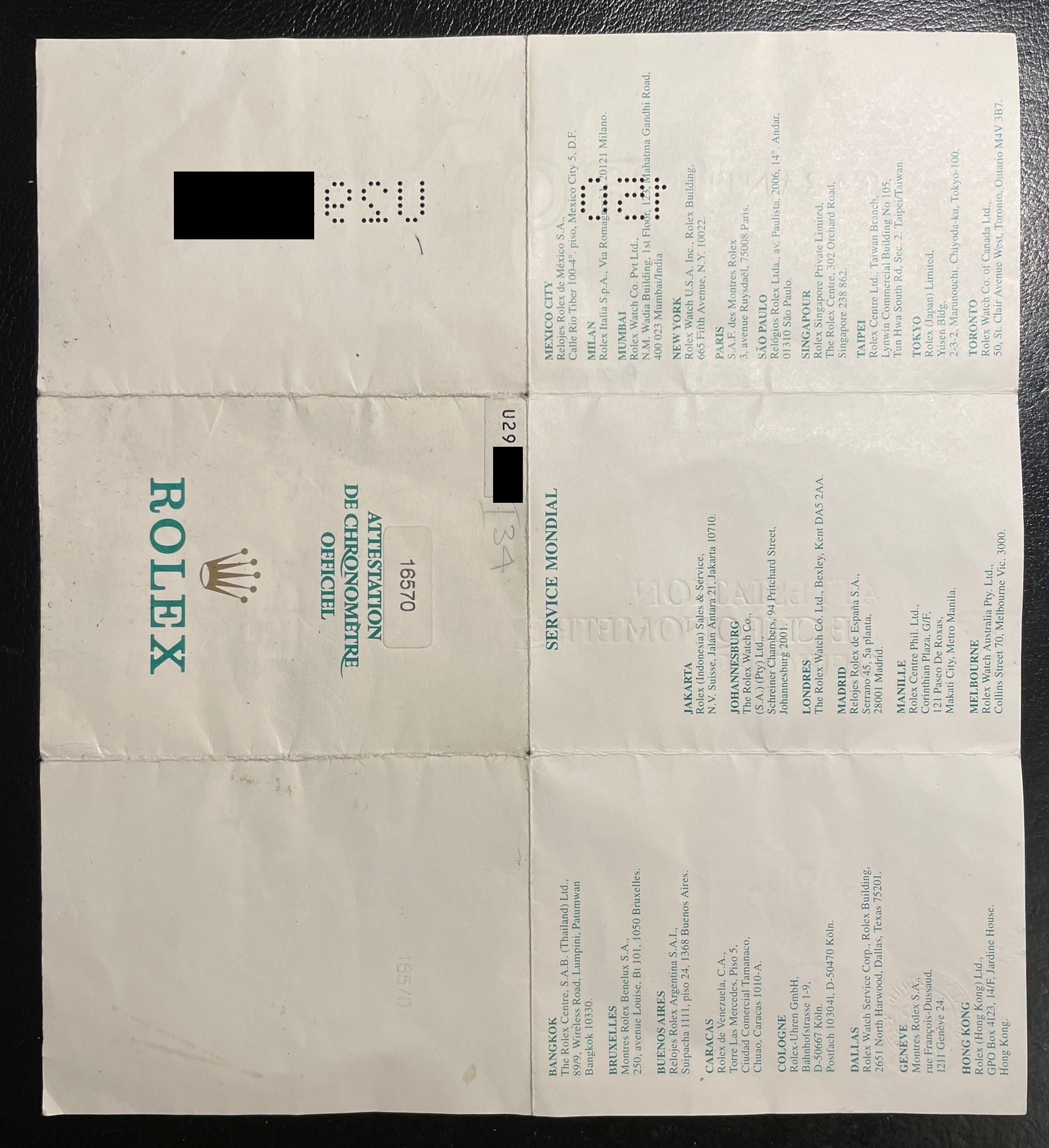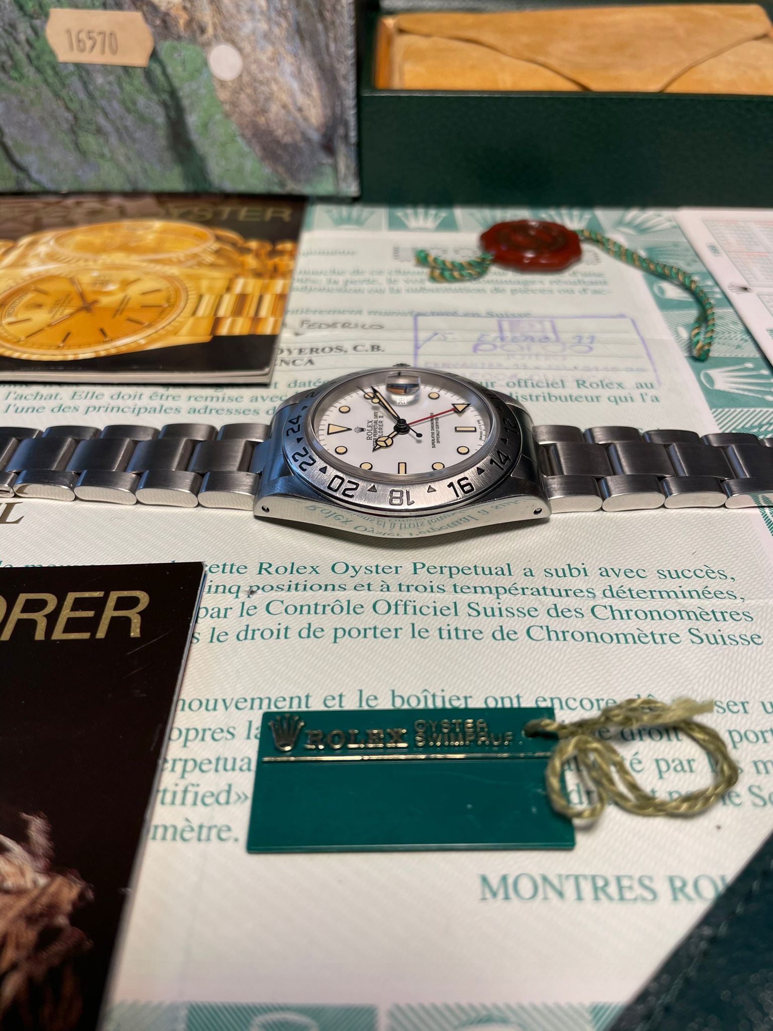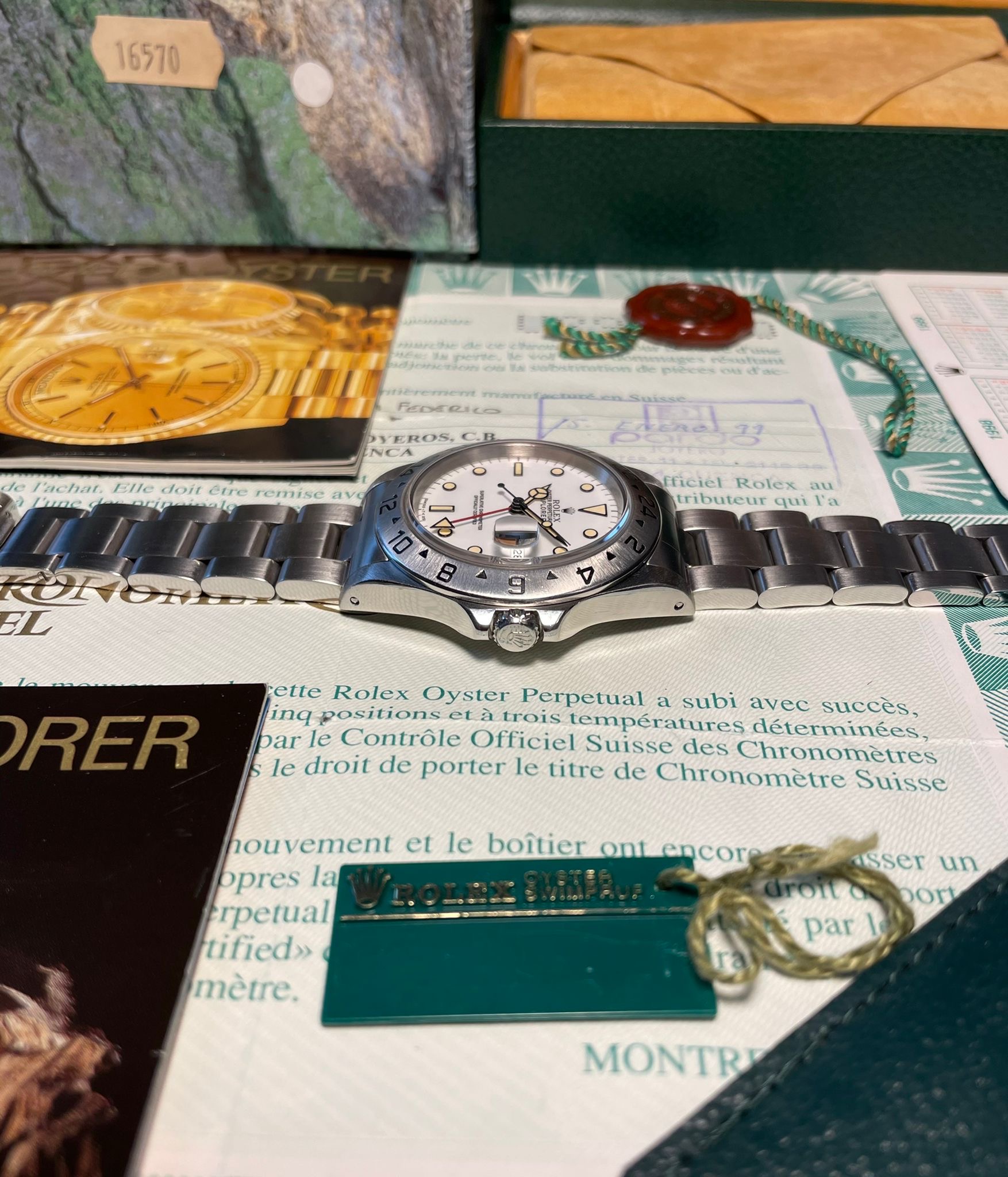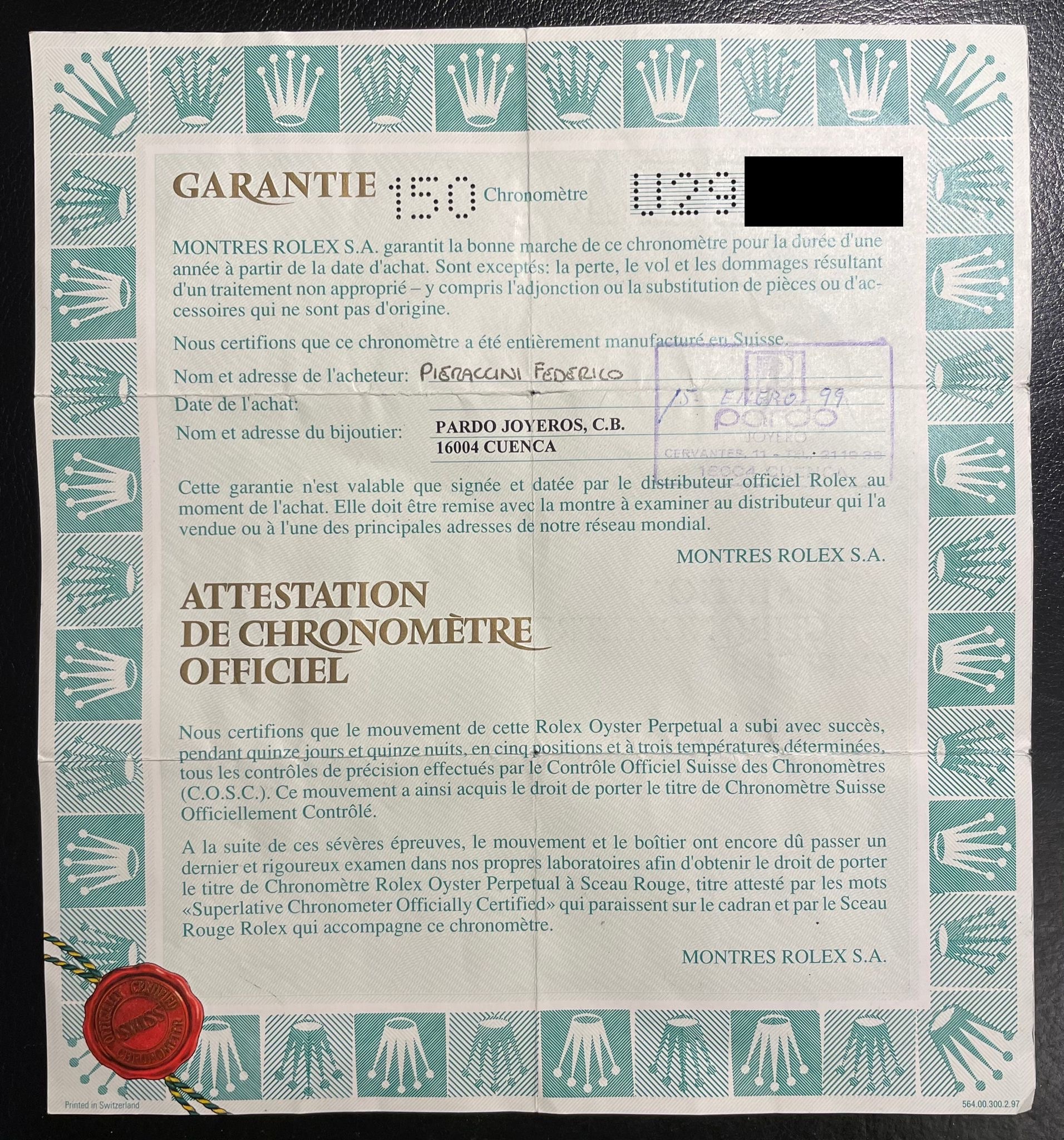 The watch was sold in 1999 in Spain by the official Rolex retailer 'Pardo Joyeros' and it comes with the full set, including the original guarantee (Rolex punched papers).