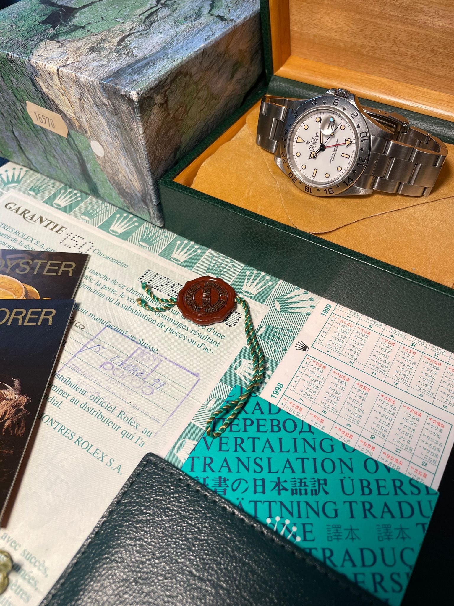 The watch comes with the complete full set: original Rolex box (inner/outer) with sticker, the Rolex warranty certificate, the Rolex warranty holder, the Rolex translation booklet, the Rolex calendar, the Rolex booklet.