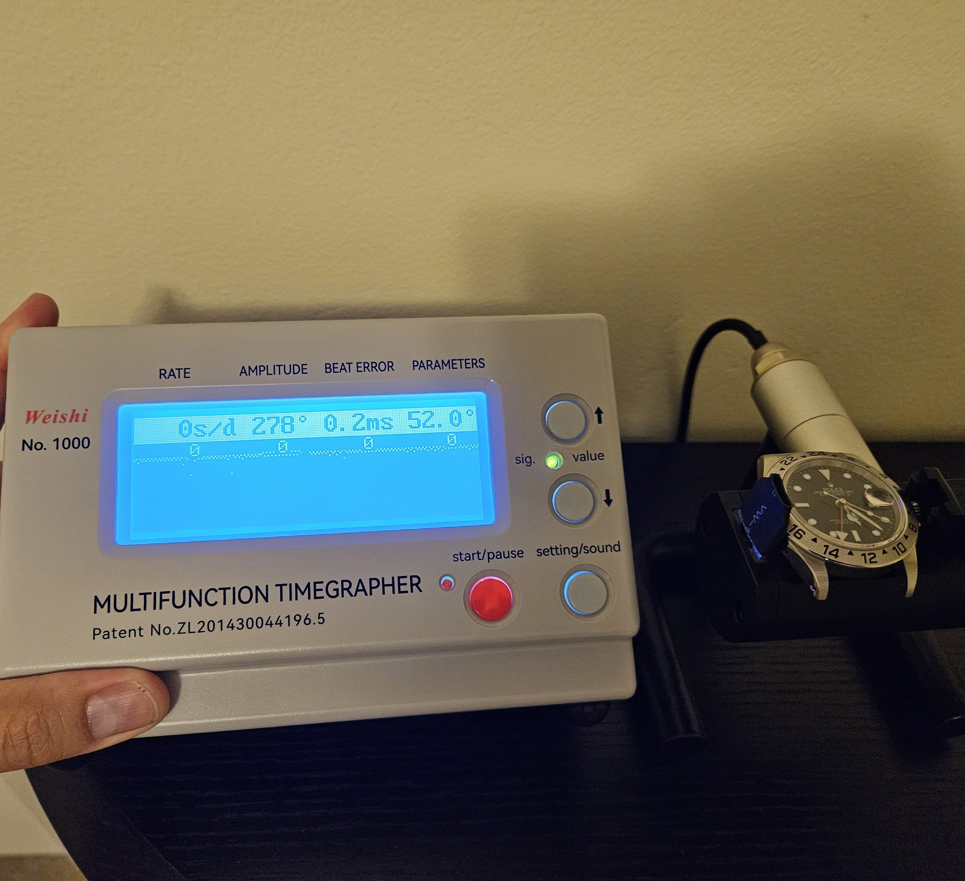 Mechanical Condition: Service history is unknown, but if you look at the timegrapher picture I have included, the daily accuracy (+/- 0 sec/day) and amplitude (278 degrees) both look very healthy. When the crown is pulled out to its first position to wind the mainspring and power the movement, it winds nice and smooth. When the crown is pulled out to its third position, to advance the minute hand, it does seem wind with a bit more resistance than what I would consider 'normal' for this model. The jumping hour hand and date change over, are both in good working order.