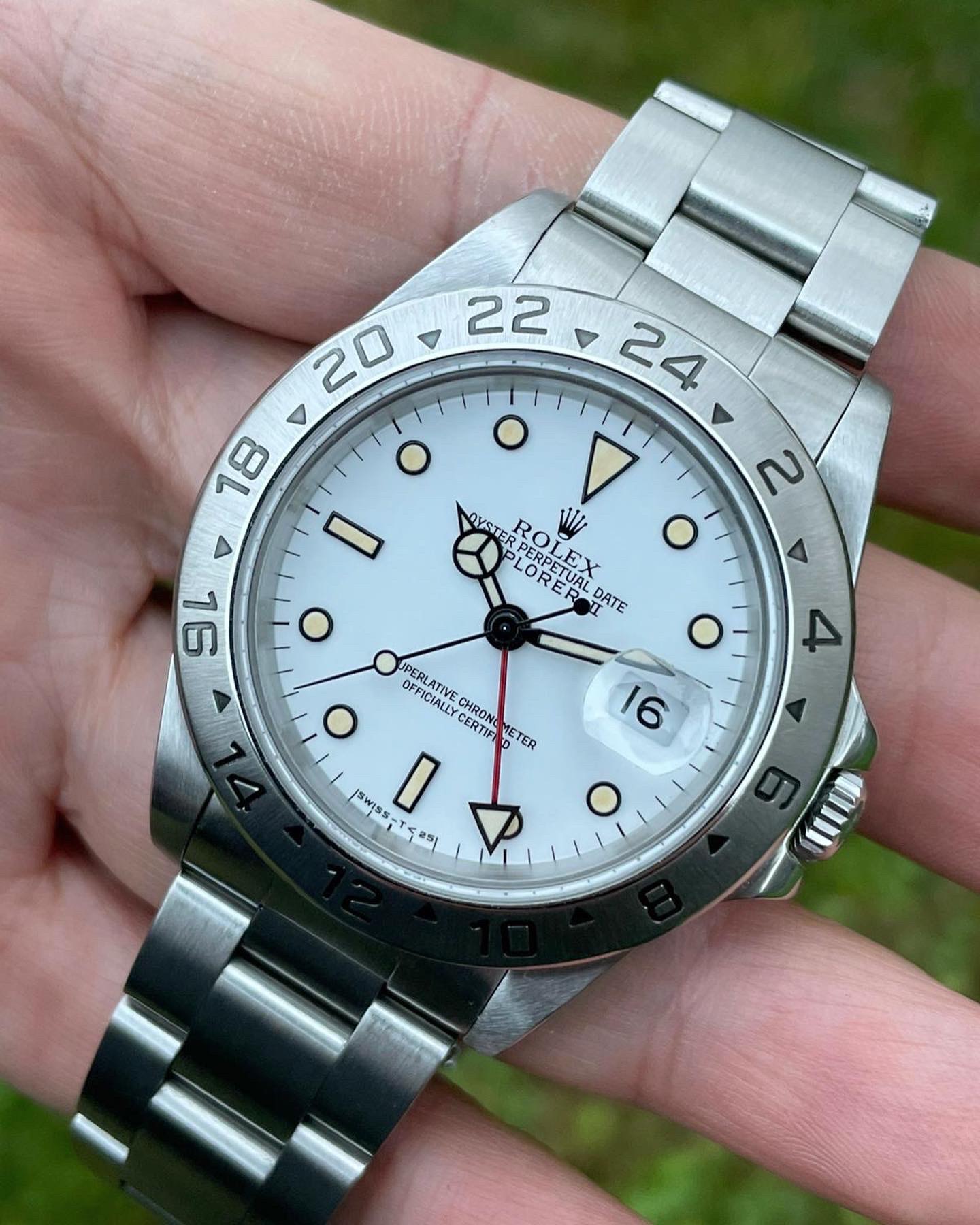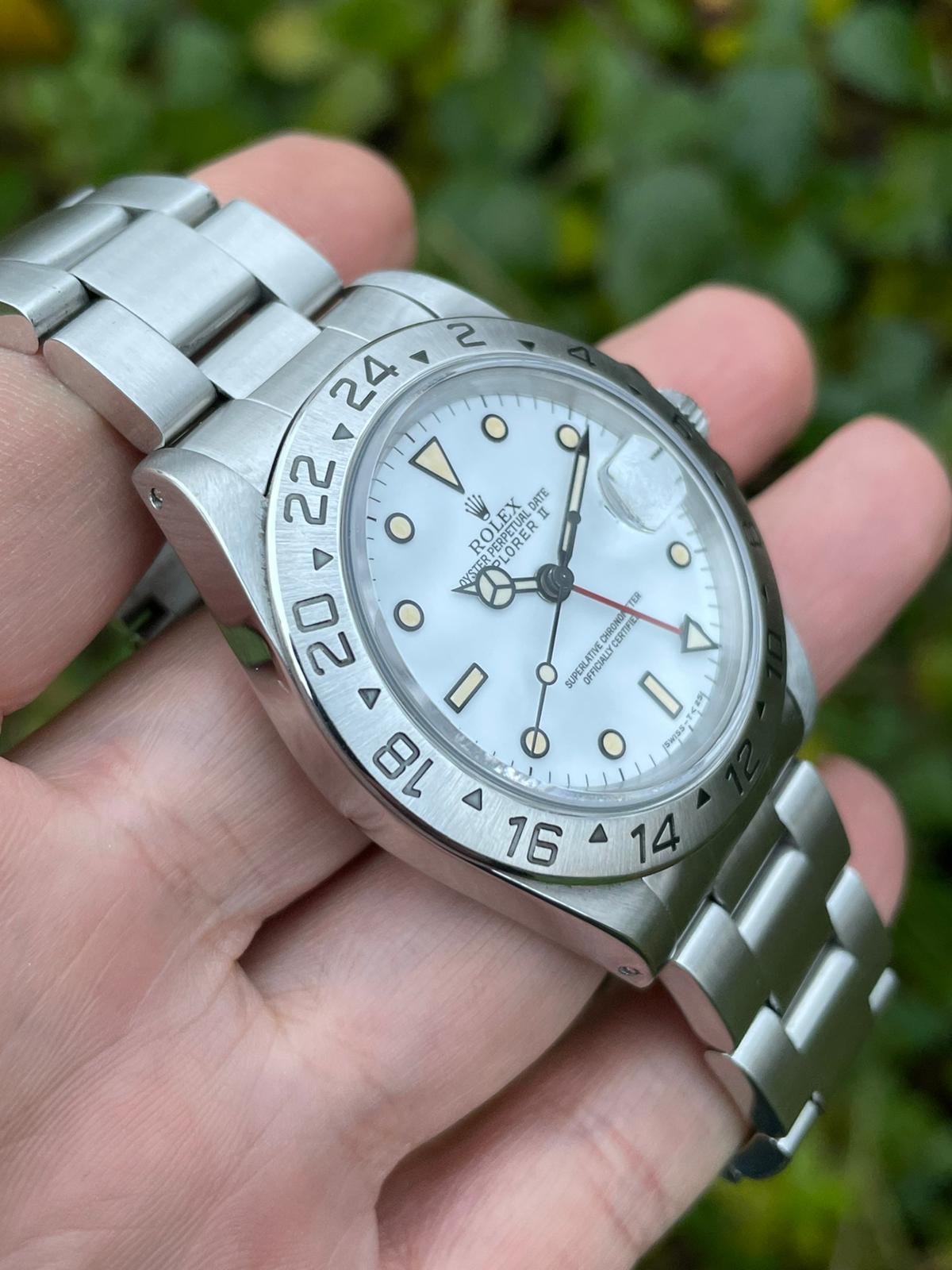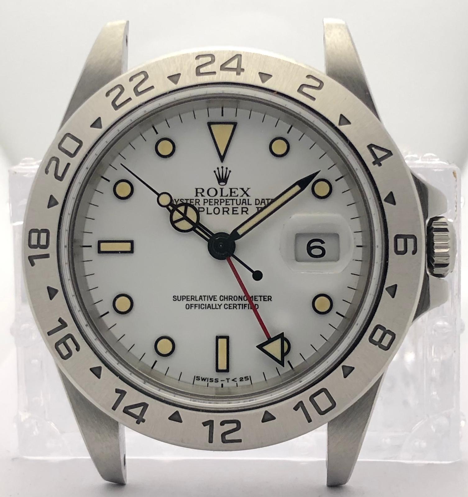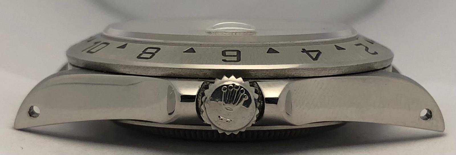 This is an exquisite example of the rarest of the Explorer II ref.16570: the "corn grain dial" (in Italian "chicchi di mais"), nicknamed this way because in this specimen the tritium of the hour markers ages taking a yellow cream patina.