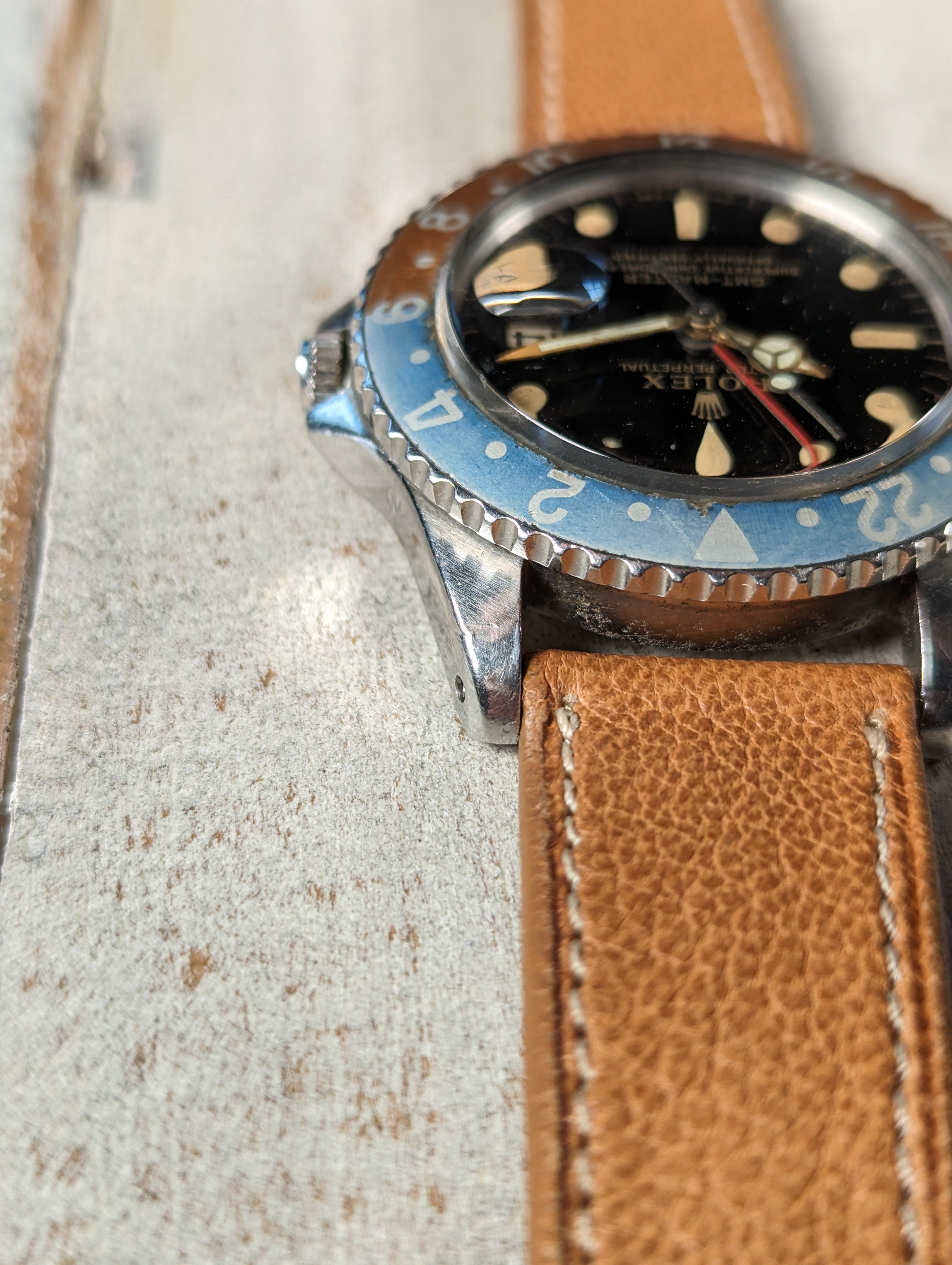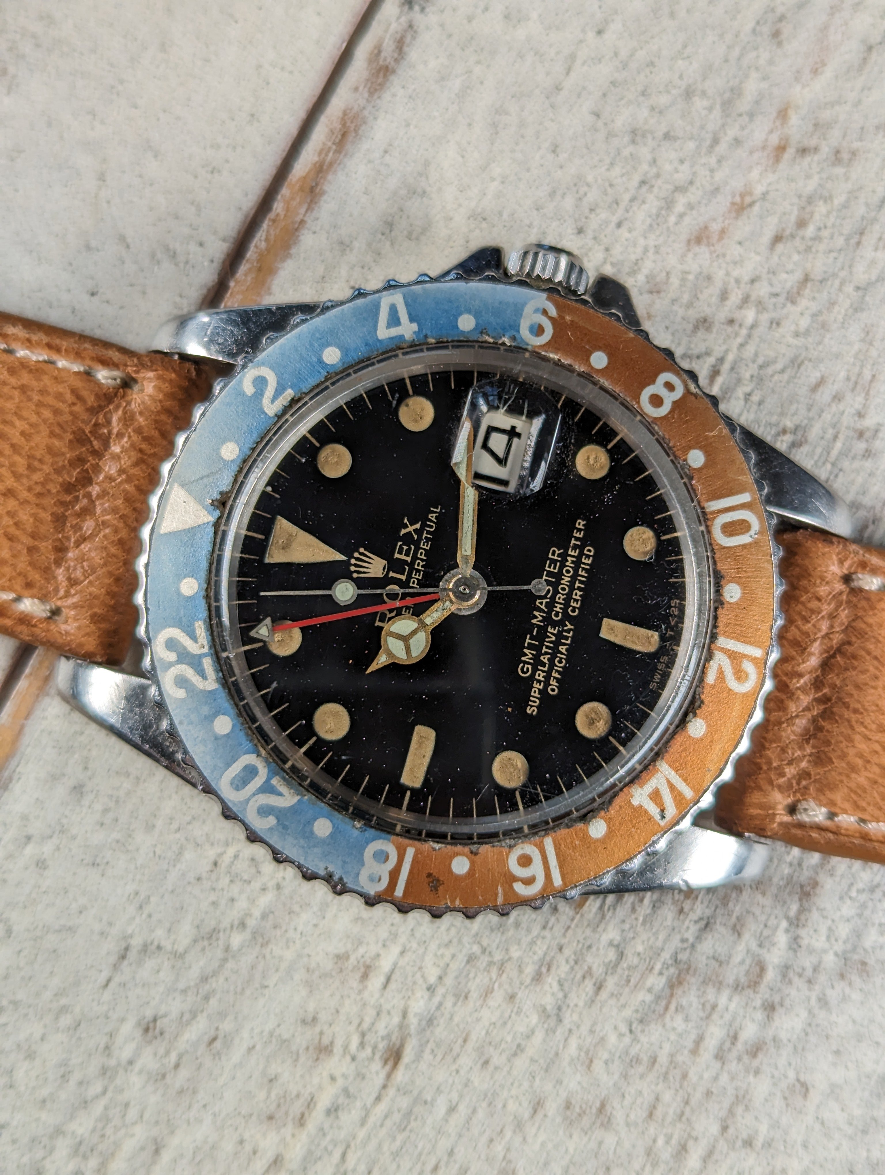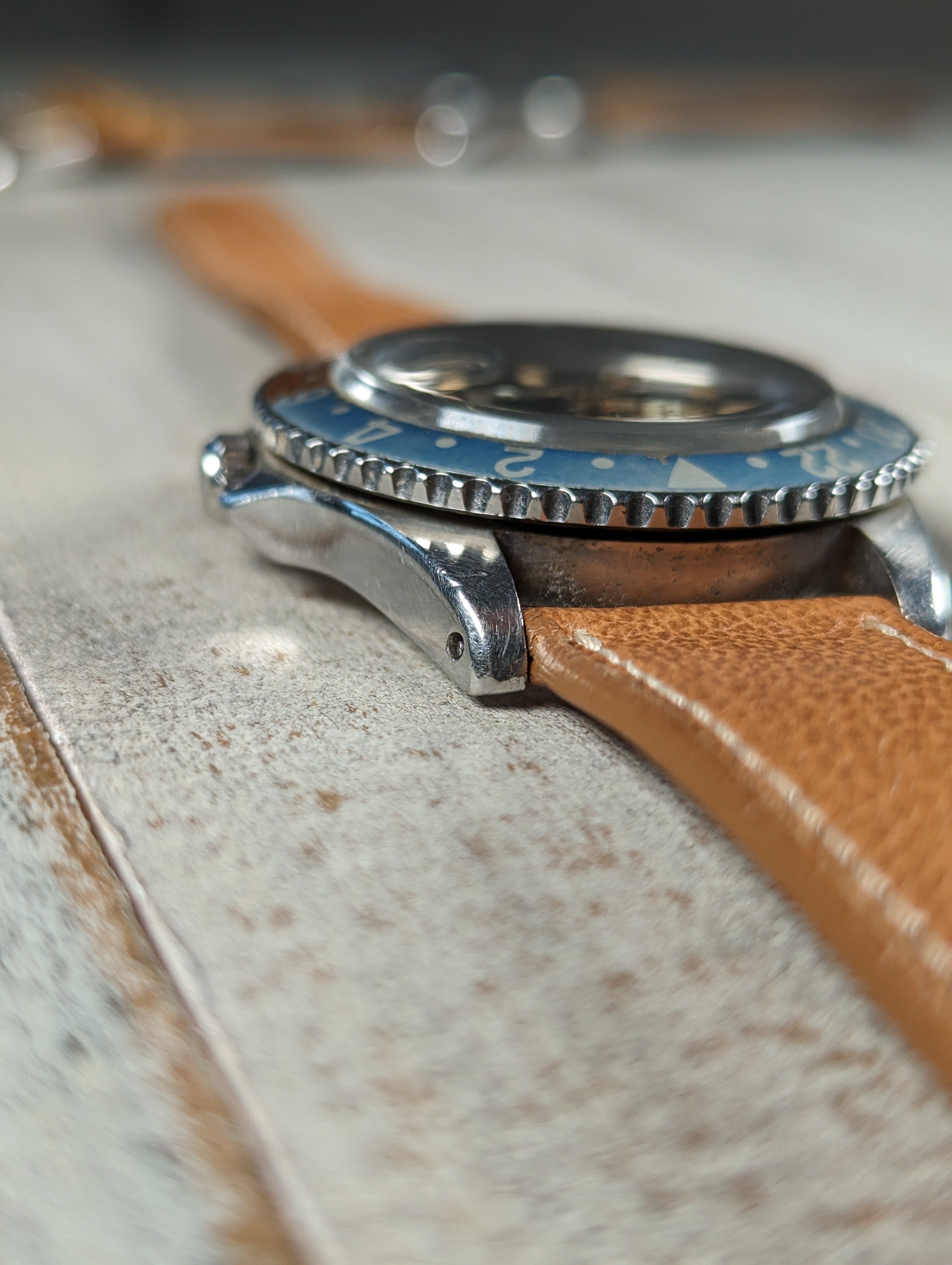 BRACELET: We have paired this beautiful vintage GMT with a complimenting brand new, handmade, hand stitched, hand painted, Italian goat skin strap. Will also include a Rolex jubilee.