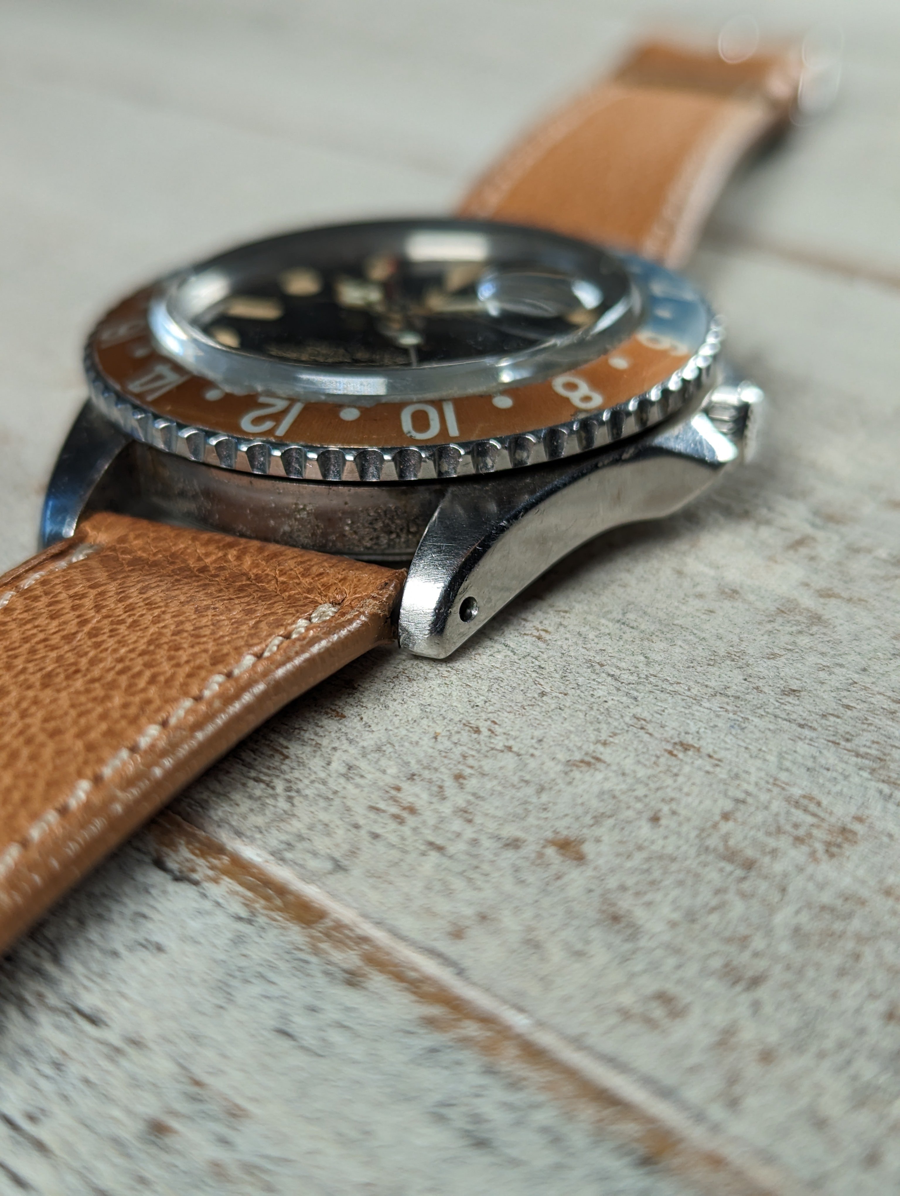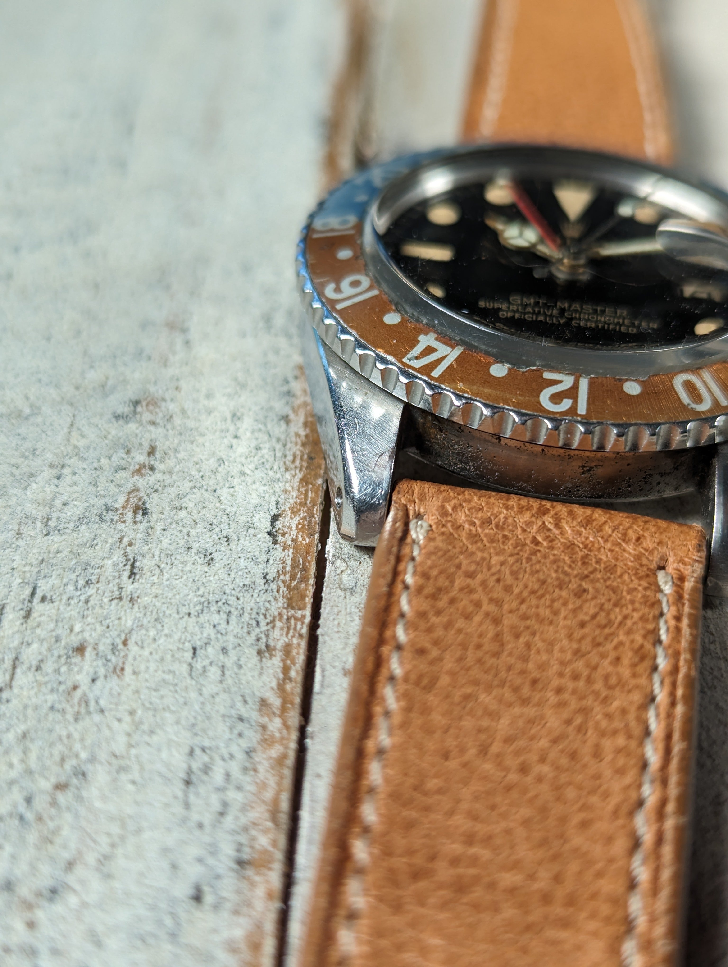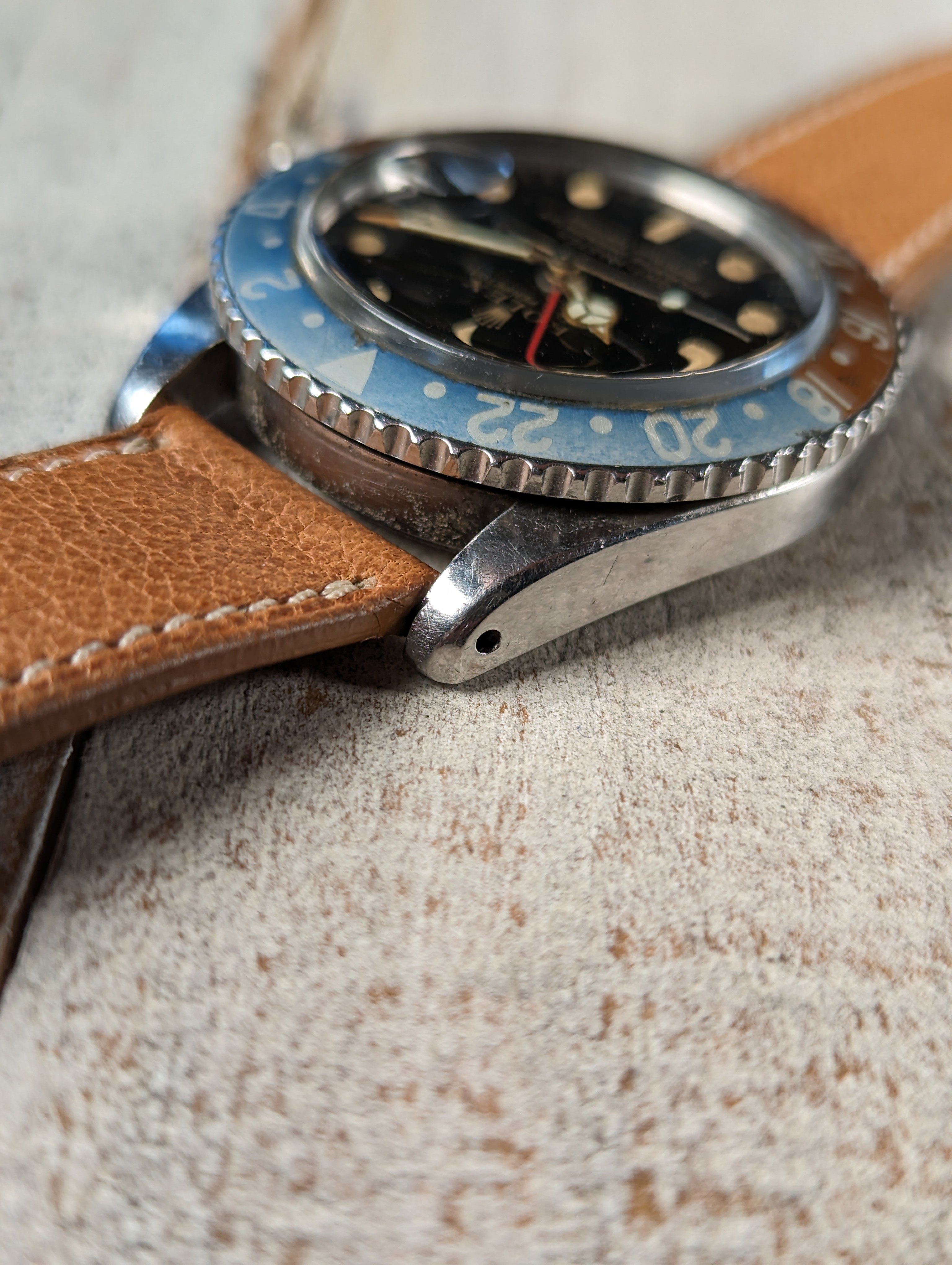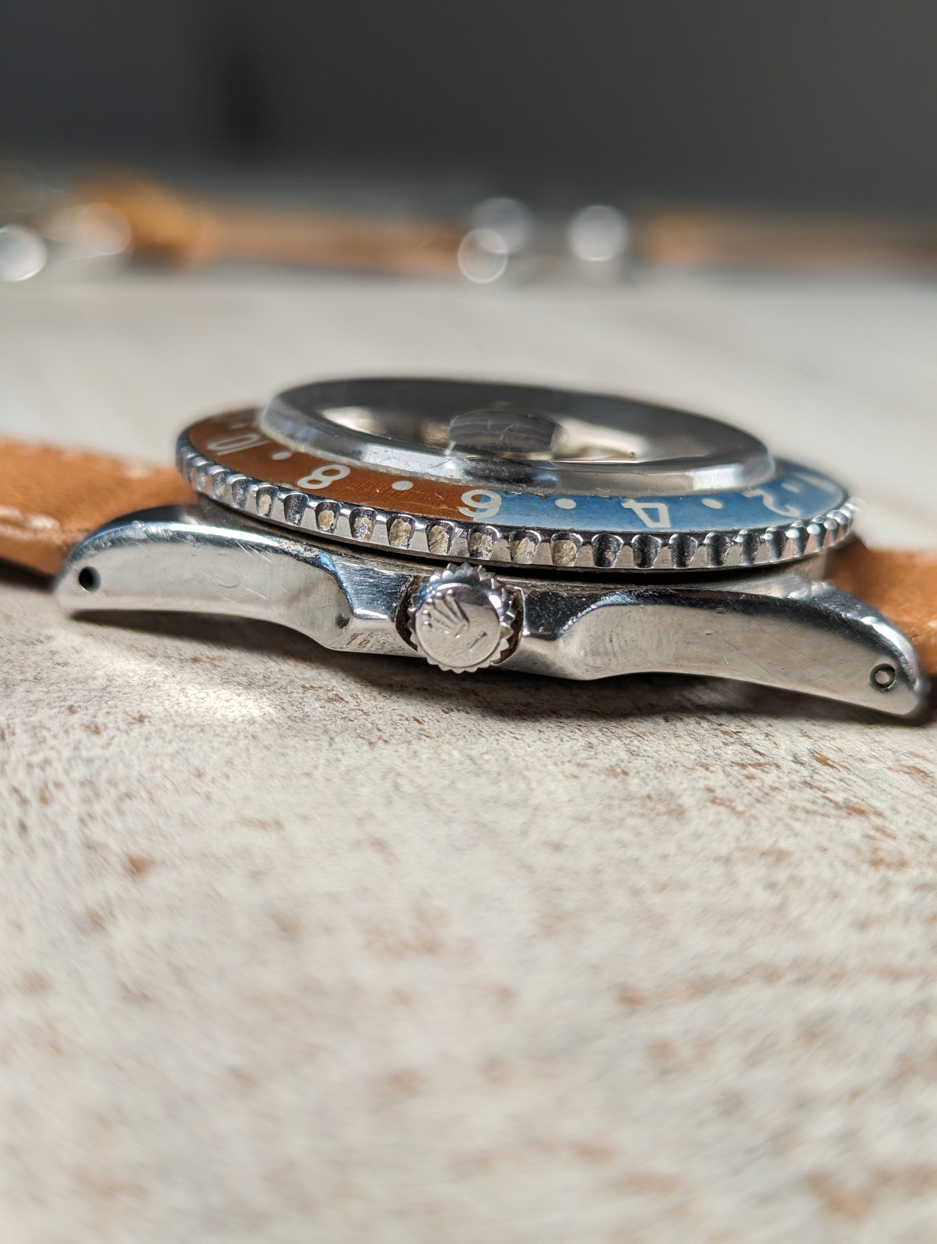 BRACELET: We have paired this beautiful vintage GMT with a complimenting brand new, handmade, hand stitched, hand painted, Italian goat skin strap. Will also include a Rolex jubilee.