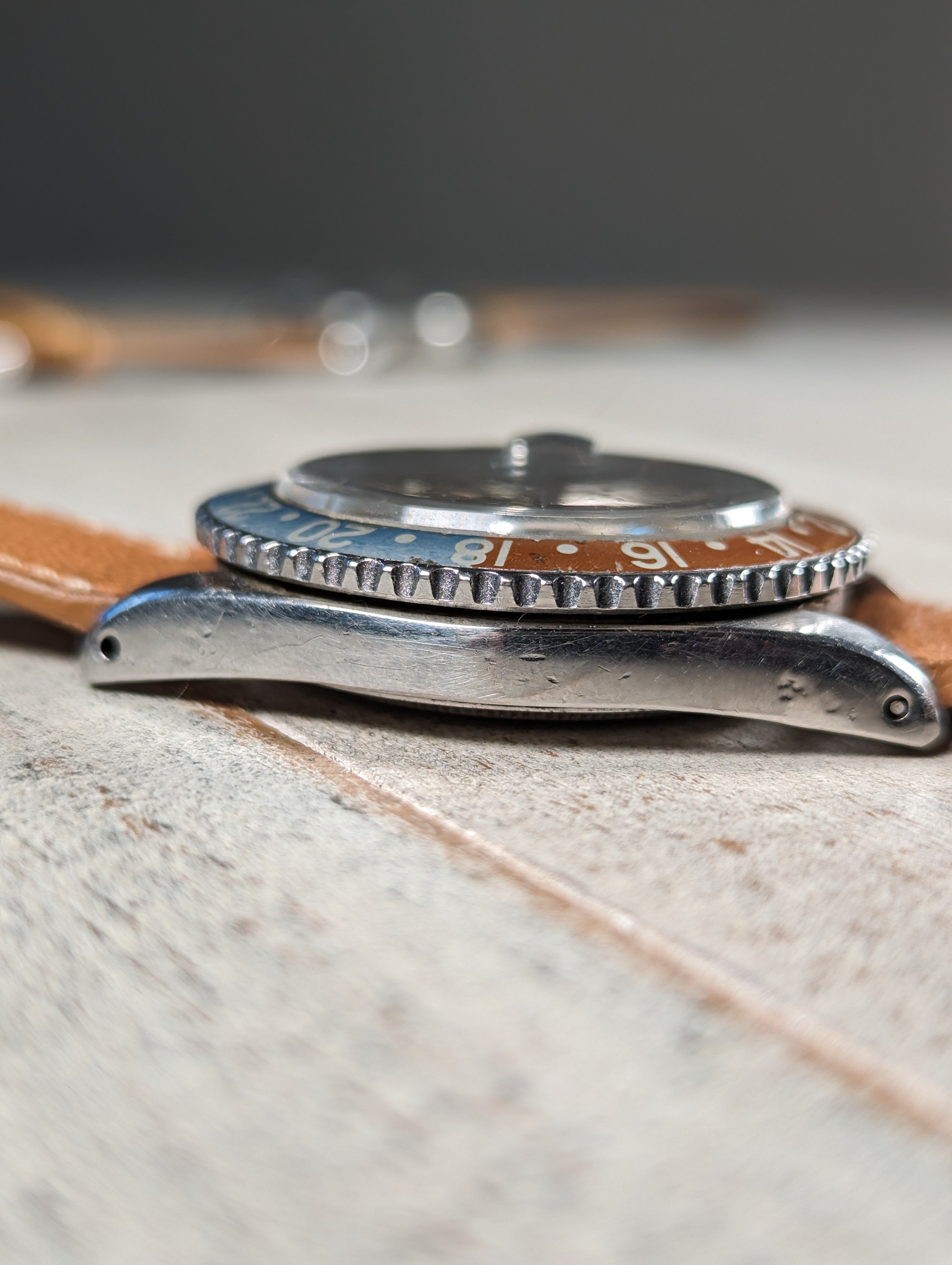 DIAL: We have a Type C, open chapter ring, gilt dial. This dial is the last of the gilt era GMT's and is original fitting within the accepted serial range. This Type C dial variant is the more rare of the two with the wide spread "Swiss T < 25". The dial is completed by its original, gilt, flat handset. The lume on the dial is original to the watch and has aged to a charming, warm deep orange patina. The hands were relumed decades ago. In some lighting they appear to match the dial. In other lighting they are a bit more green. They can be color matched. Simply inquire.