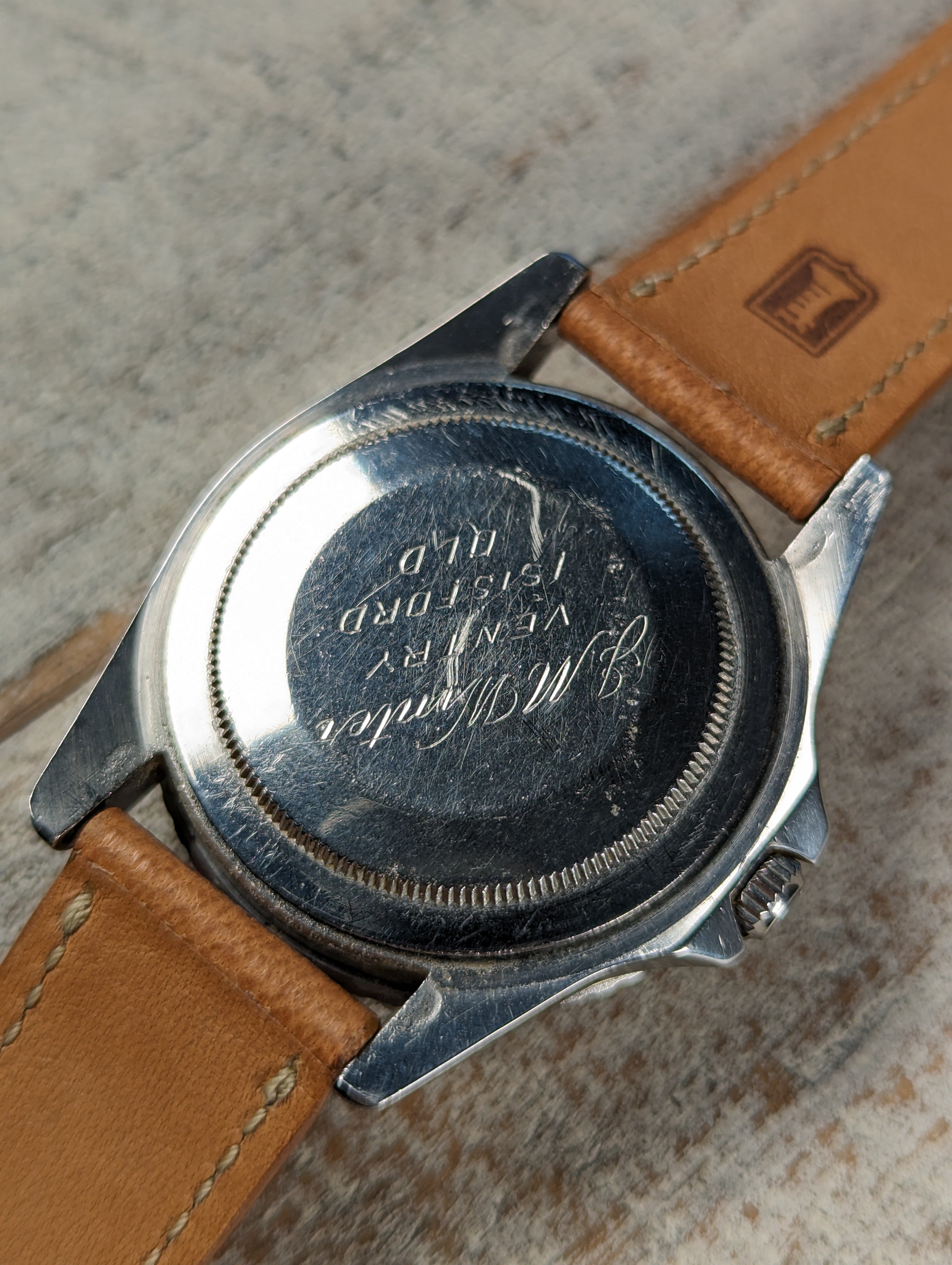 CASE: The 39mm stainless steel pointed crown guard "PCG" case is in good shape. It has been polished in the past. The factory original beveled edges on all four lugs is still visible. So to is the original brushed finish on the anterior portion of the lugs. The caseback features an engraving that reads "J.M. Winter Ventry ISIS Ford QLD."