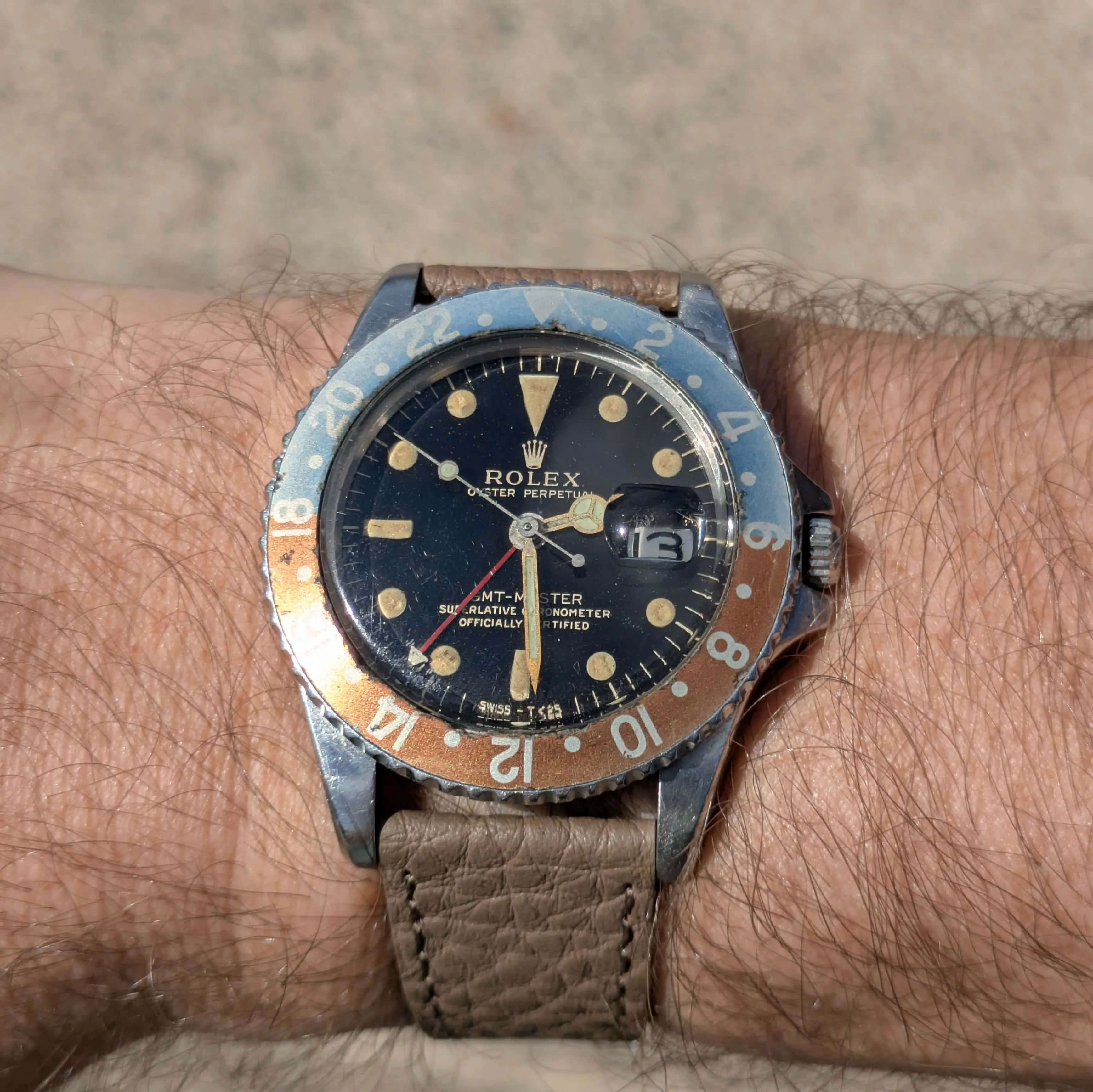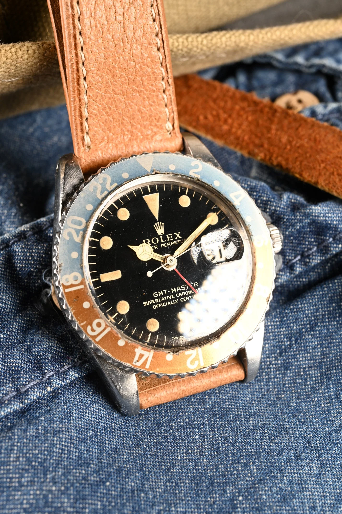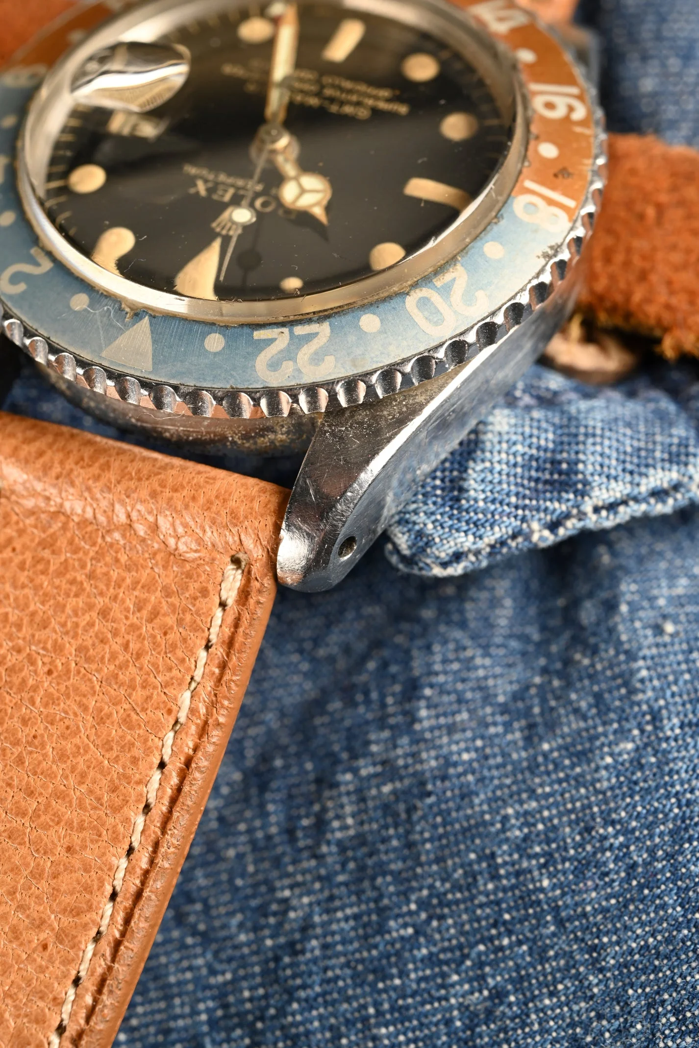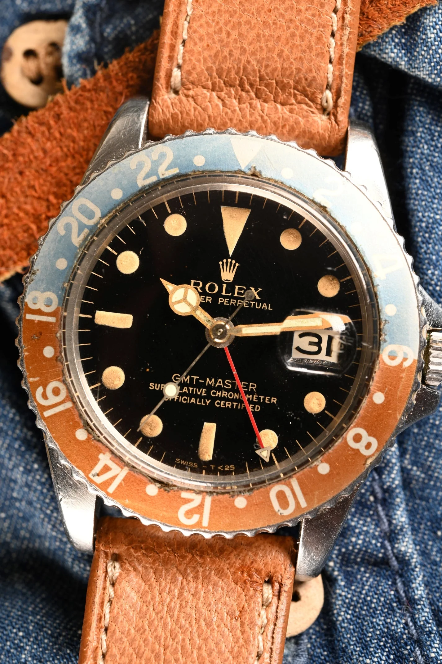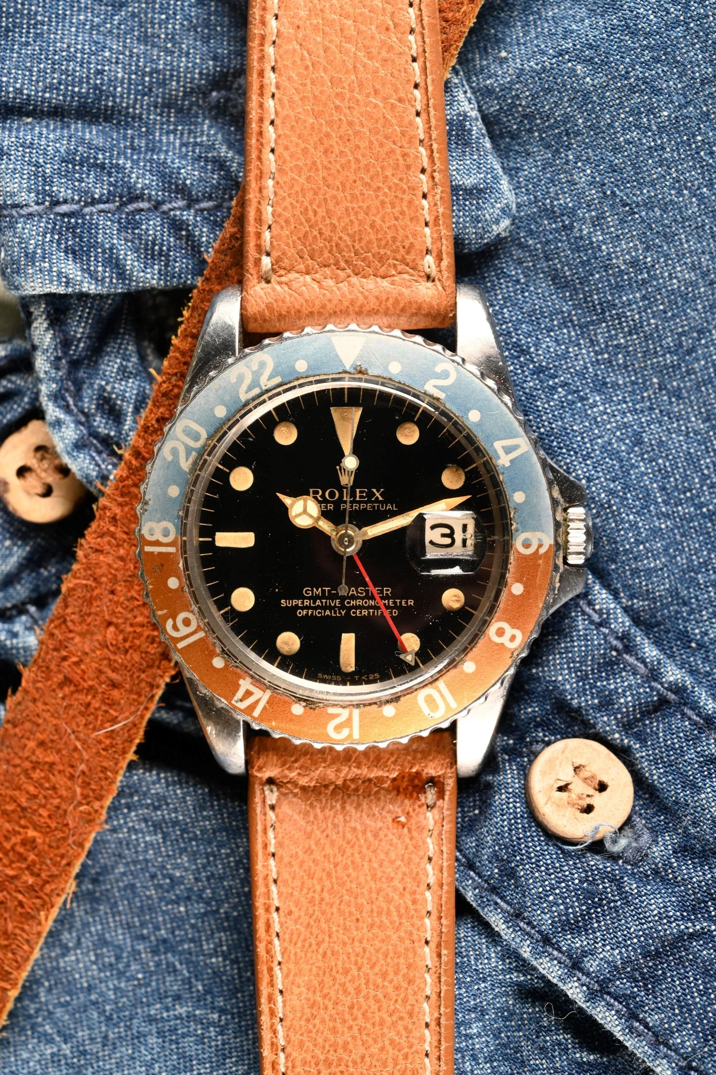 DIAL: Type C, open chapter ring, gilt dial. This dial is the last of the gilt era GMT's and is original fitting within the accepted serial range. This Type C dial variant is the more rare of the two with the wide spread "Swiss T < 25". The dial is completed by its original, gilt, flat handset. The lume on the dial is original to the watch and has aged to a charming, warm deep orange patina. It is presumed the hands were relumed decades ago. In some lighting they appear to match the dial. In other lighting they are a bit more green.