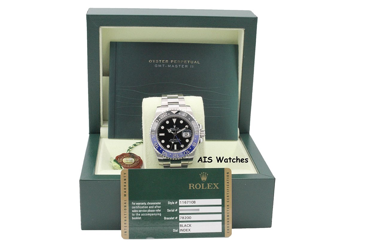 Up for sale is a Discontinued Rolex GMT Master II 116710 BLNR Black Blue Batman Ceramic Bezel Box & Papers. The timepiece is in excellent condition.