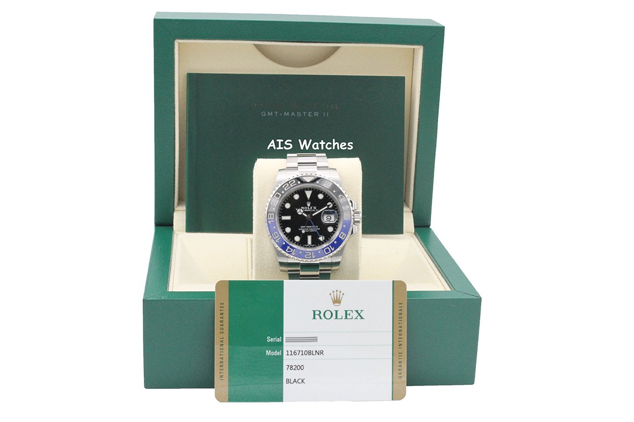 Up for sale is a Discontinued Rolex GMT Master II 116710 BLNR Black Blue Batman Ceramic Bezel Box & Papers. The timepiece is in excellent condition.