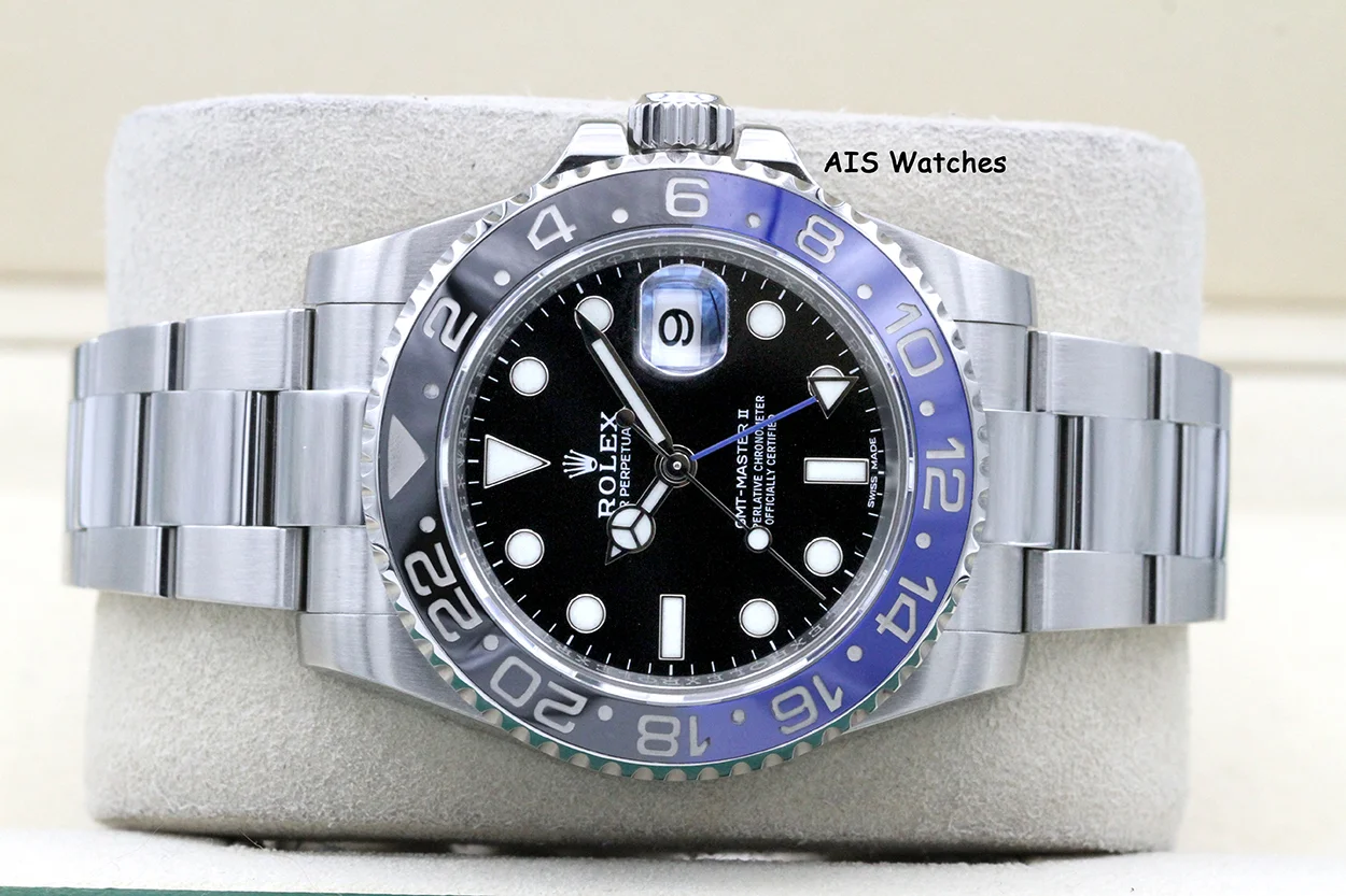 Up for sale is a Discontinued Rolex GMT Master II 116710 BLNR Black Blue Batman Ceramic Bezel Box & Papers. The timepiece is in excellent condition.