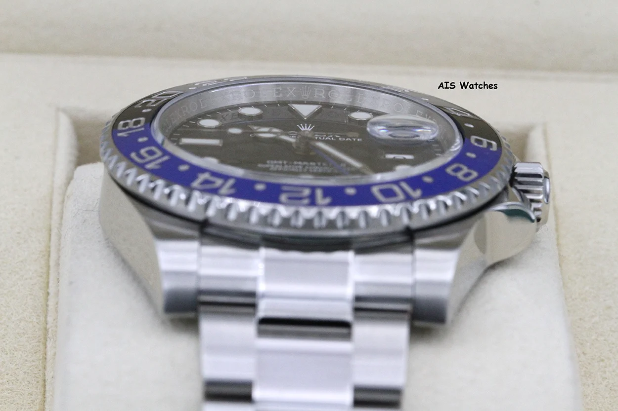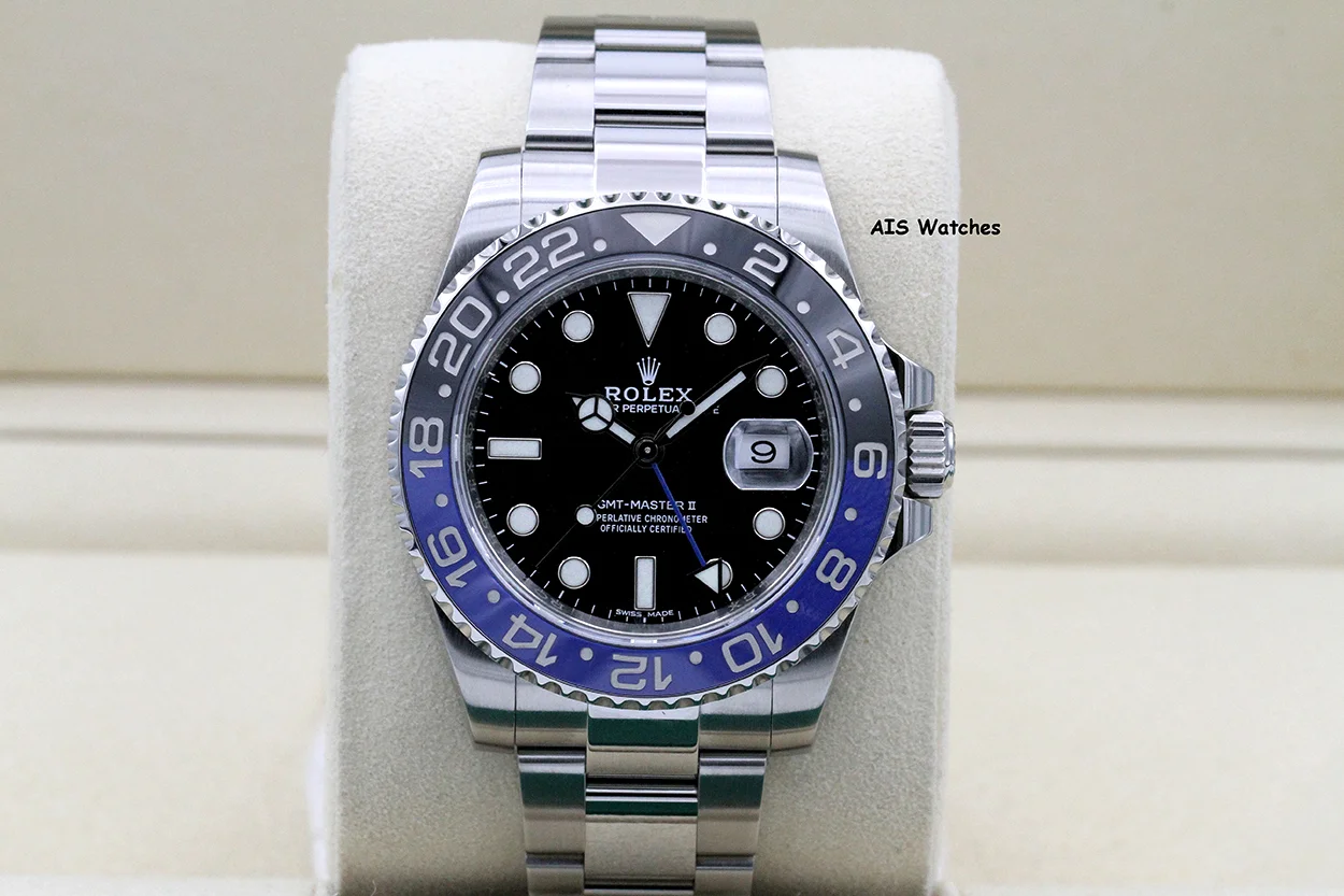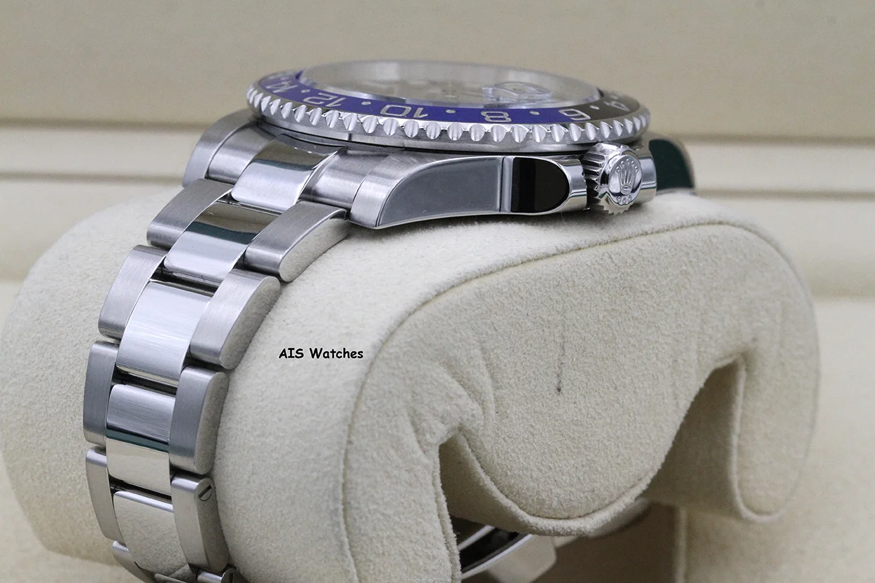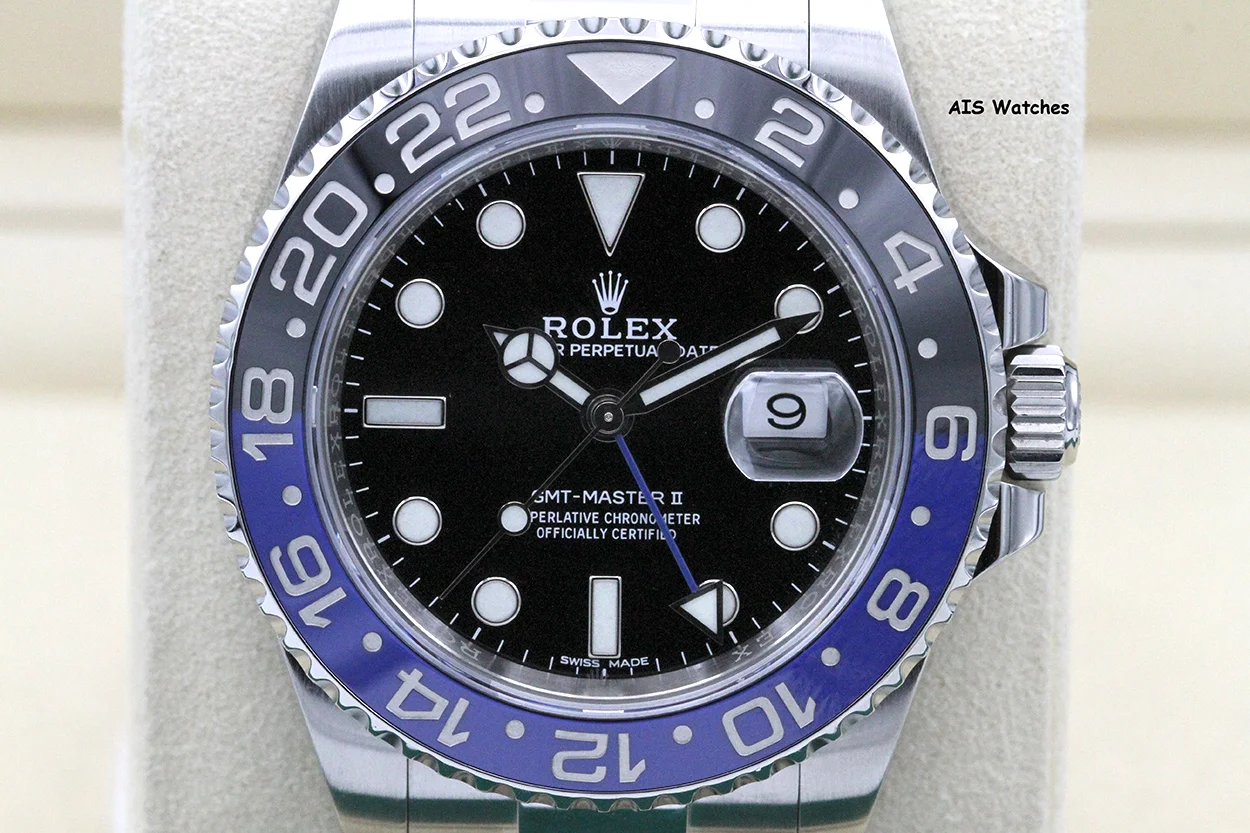 Up for sale is a Discontinued Rolex GMT Master II 116710 BLNR Black Blue Batman Ceramic Bezel Box & Papers. The timepiece is in excellent condition.