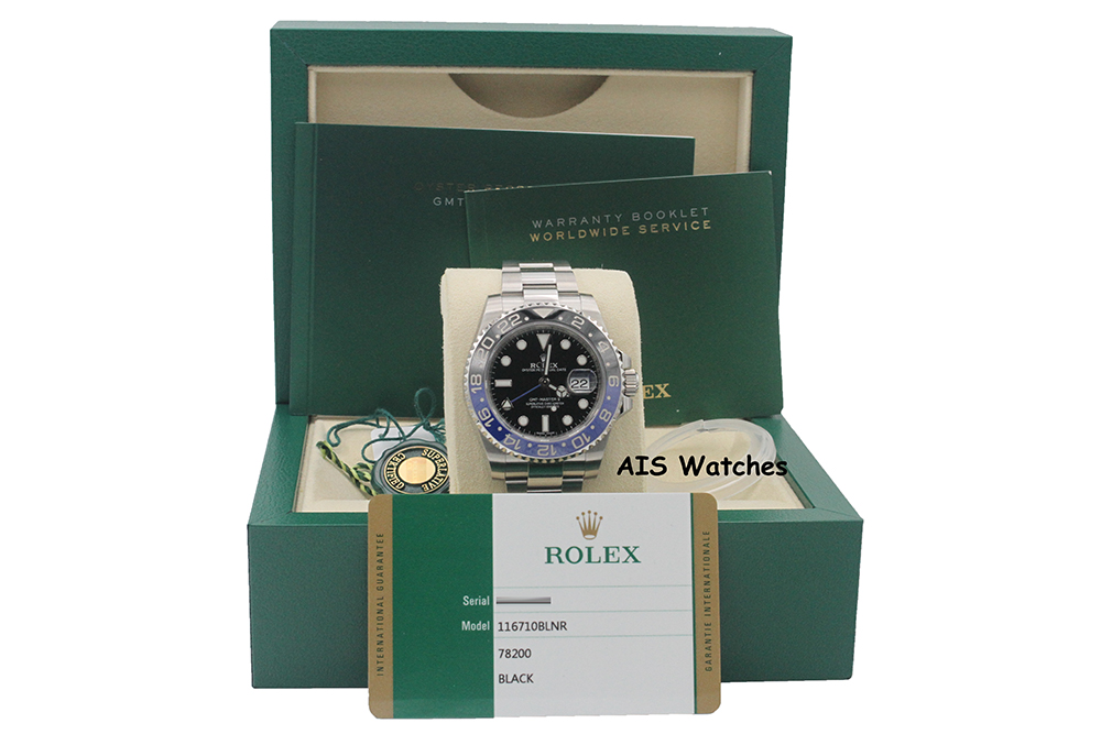 Up for sale is a Discontinued Rolex GMT Master II 116710BLNR Black Blue Batman Ceramic Bezel Box & Papers. The timepiece is in excellent condition.