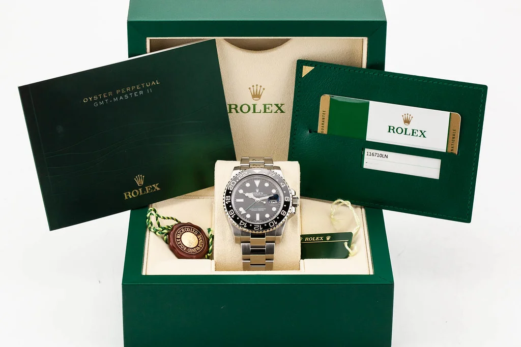 ·Up for sale is an excellent condition Rolex GMT Master II 40mm Black Ceramic Bezel on Oyster Bracelet, reference # 116710LN. It comes complete with all boxes, papers, booklets, hang tags, and Rolex Warranty Card dated March 2015.