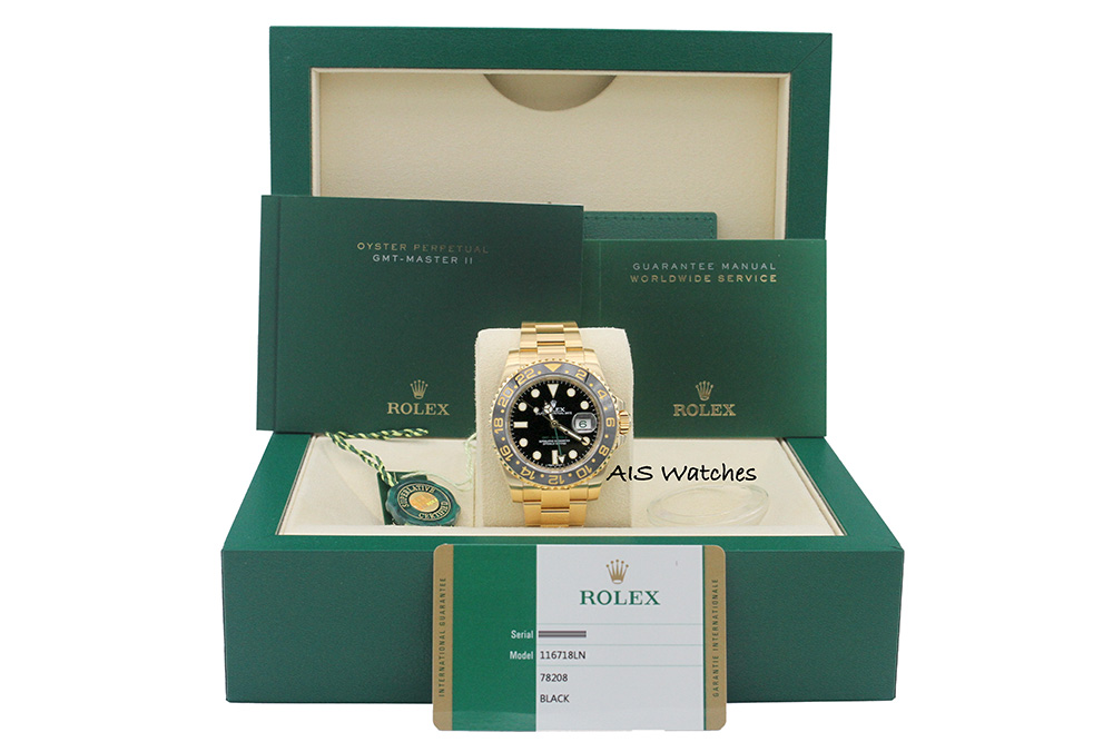 Up for sale is Discontinued Rolex GMT-Master II 116718LN 18K Yellow Gold Black Ceramic Black Dial Random Serial with Box & Papers. The timepiece is in excellent condition.