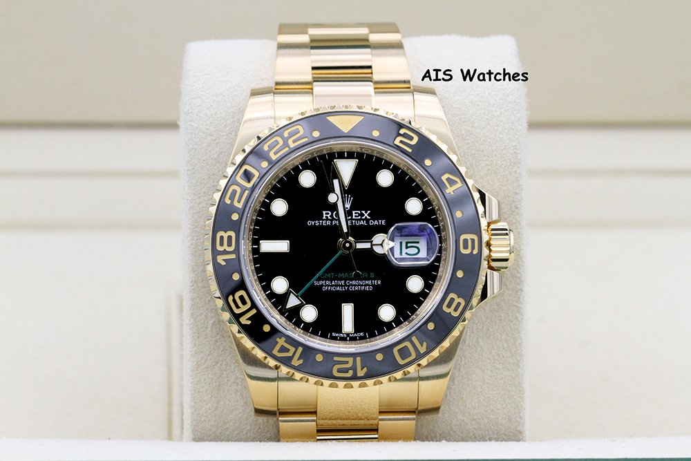 Up for sale is Discontinued Rolex GMT-Master II 116718LN 18K Yellow Gold Black Ceramic Black Dial Random Serial with Box & Papers. The timepiece is in excellent condition.