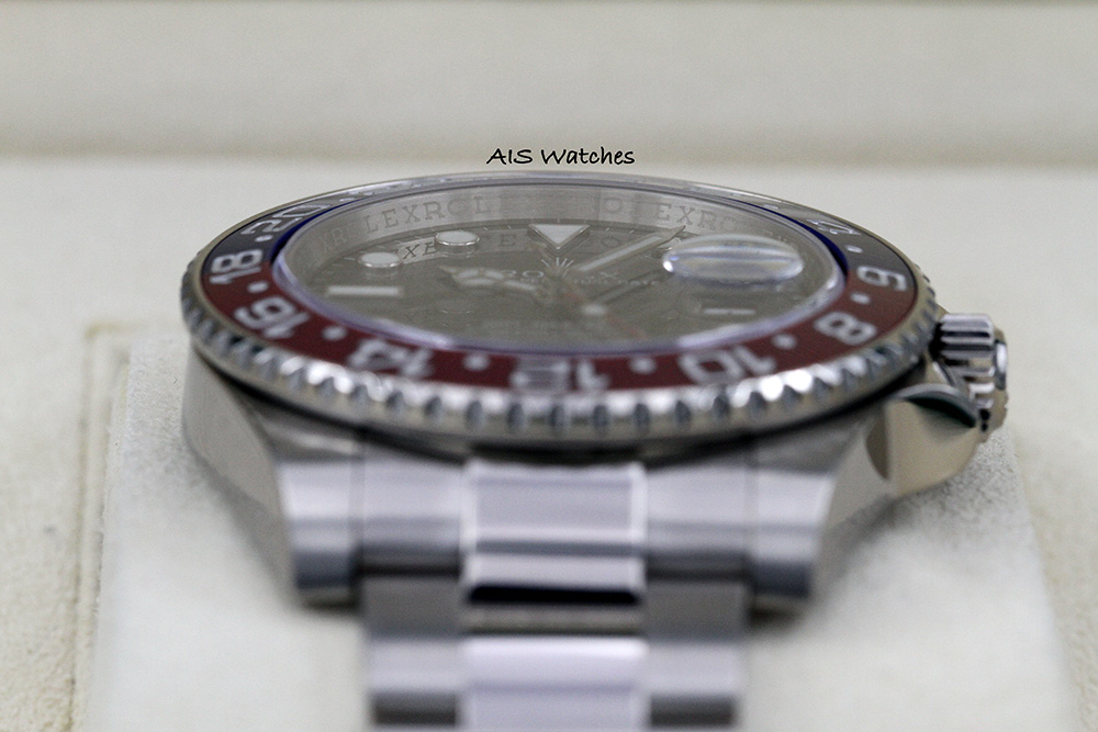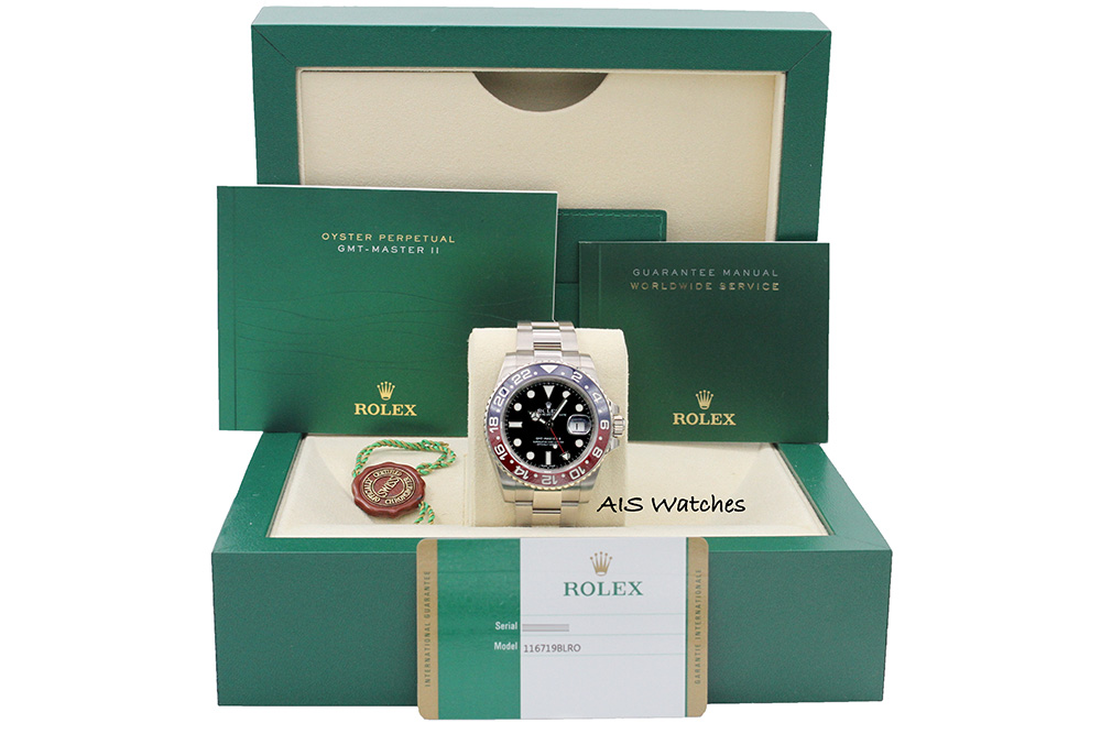 Up for sale is Discontinued Rolex GMT-Master II 116719 BLRO 18K White Gold Pepsi Ceramic Black Dial with Box & Papers. The timepiece is in clean condition.