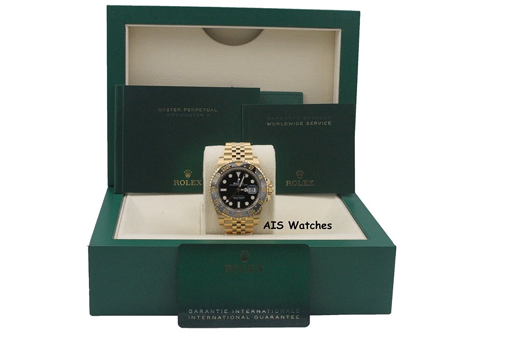 Up for sale is Rolex GMT-Master II 126718 GRNR 18K Yellow Gold Black Dial Jubilee Box & Papers. The timepiece is in excellent condition.