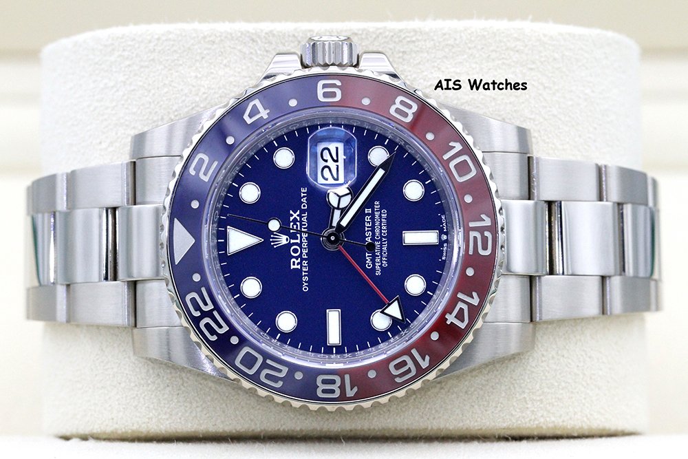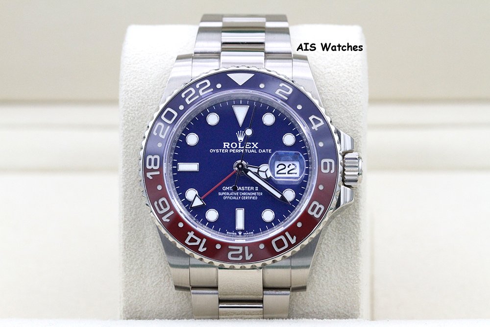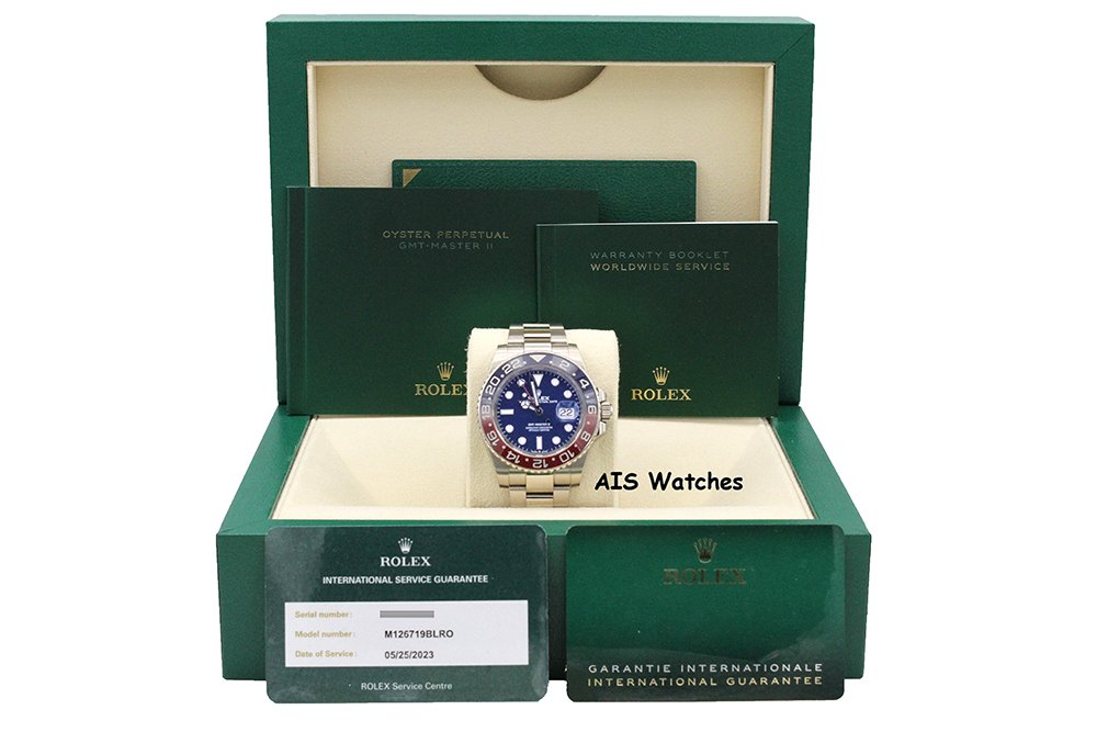 Up for sale is Rolex GMT-Master II 126719 BLRO 18K White Gold Pepsi Ceramic Blue Dial with 2023 RSC Service Card + Box & Papers. The timepiece is in excellent condition