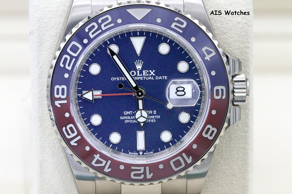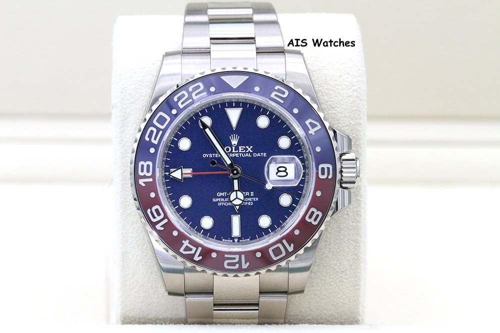 Up for sale is Rolex GMT-Master II 126719 BLRO 18K White Gold Pepsi Ceramic Blue Dial with Box & Papers. The timepiece is in excellent condition with protective stickers.
