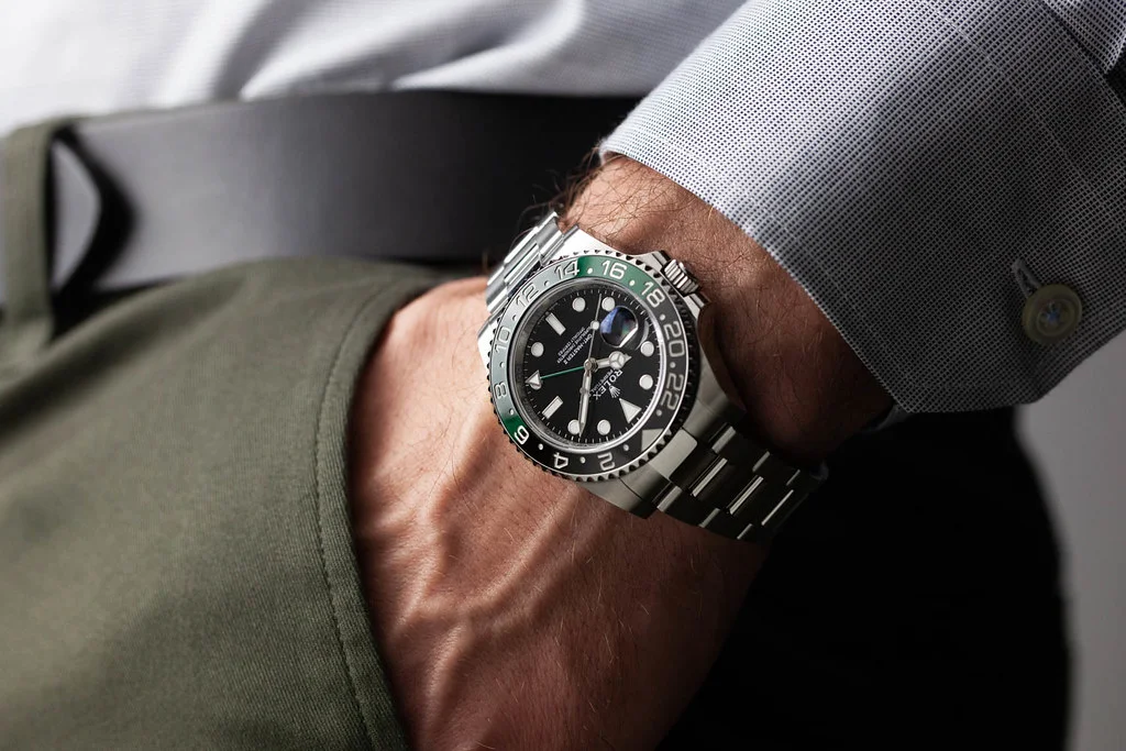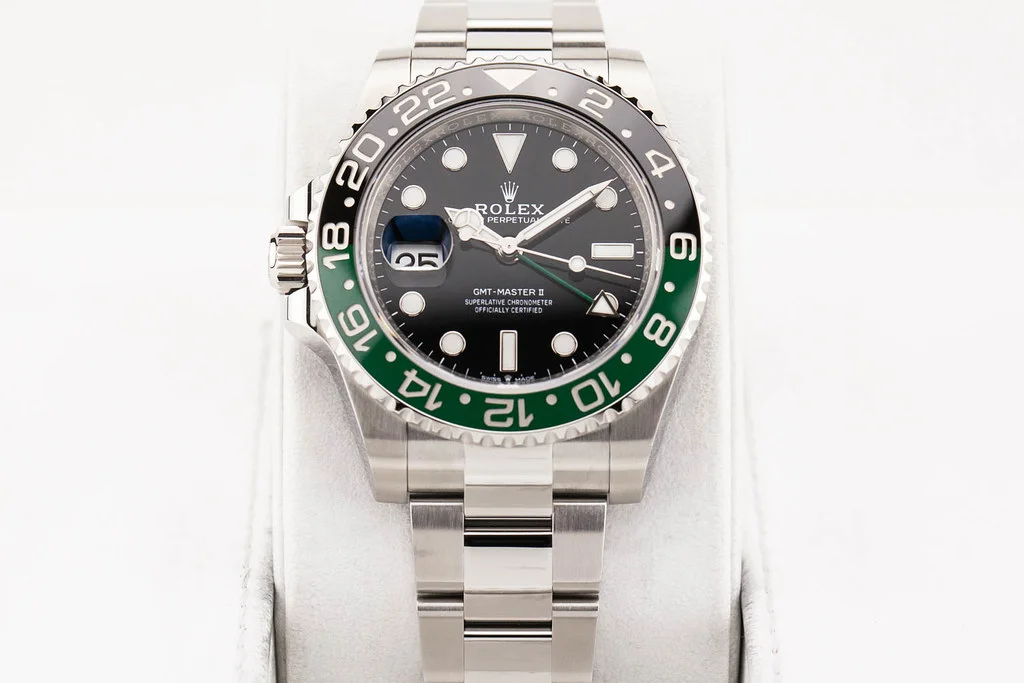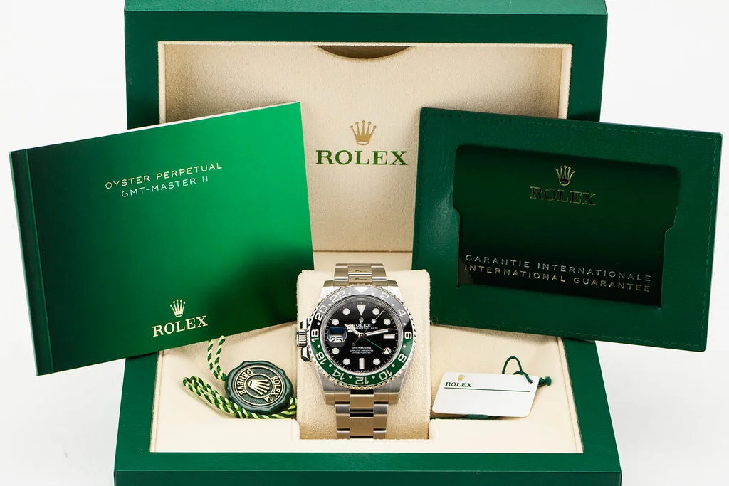 ·Up for sale is a brand new Rolex GMT Master II Sprite Lefty 40mm Black & Green Ceramic Bezel on Oyster Bracelet, reference # 126720VTNR. It comes complete with all boxes, papers, booklets, hang tags, and Rolex Warranty Card dated September 2024.