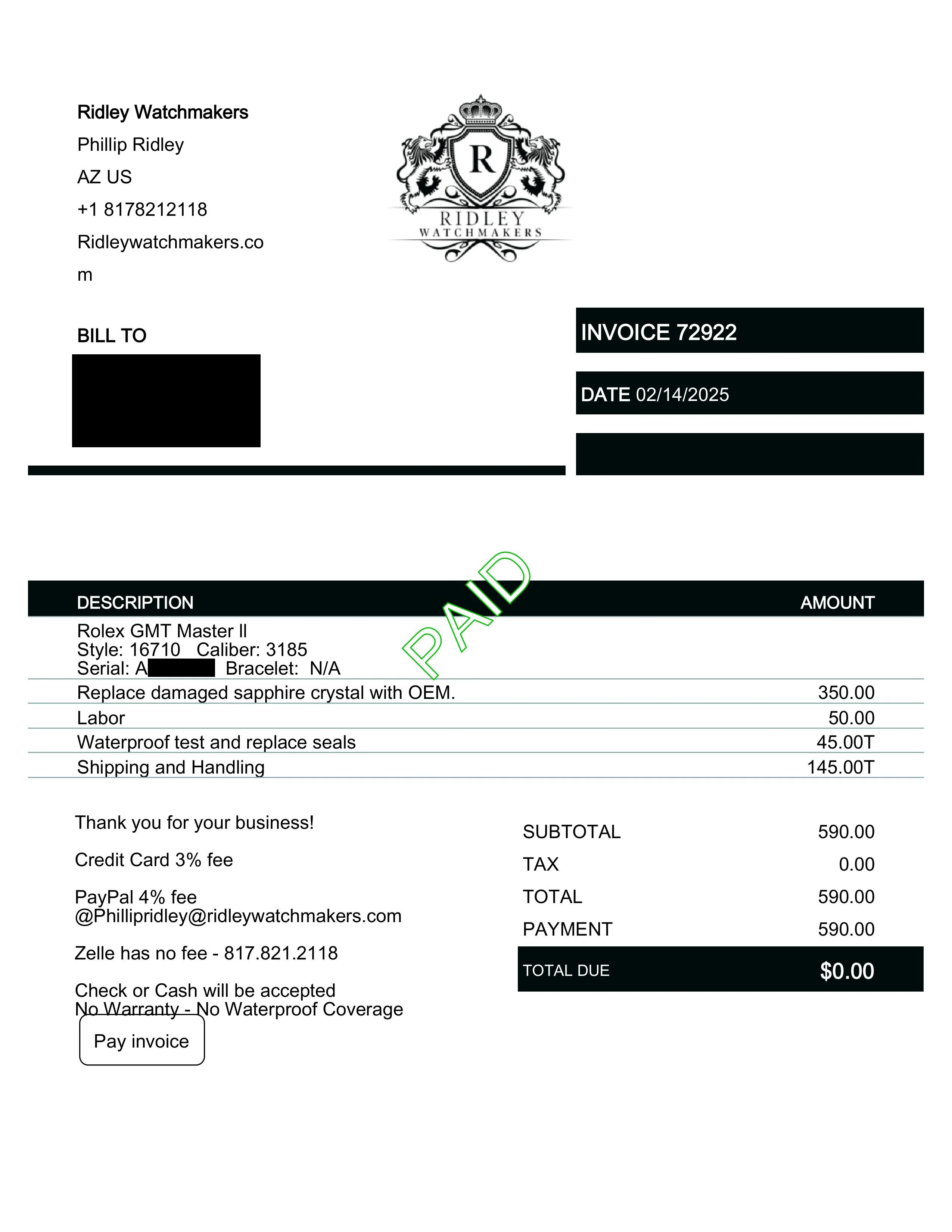 In February, I sent it to esteemed CW21 watchmaker Phillip Ridley, for installation of a new OEM sapphire crystal, new gaskets, and a water pressure test.
