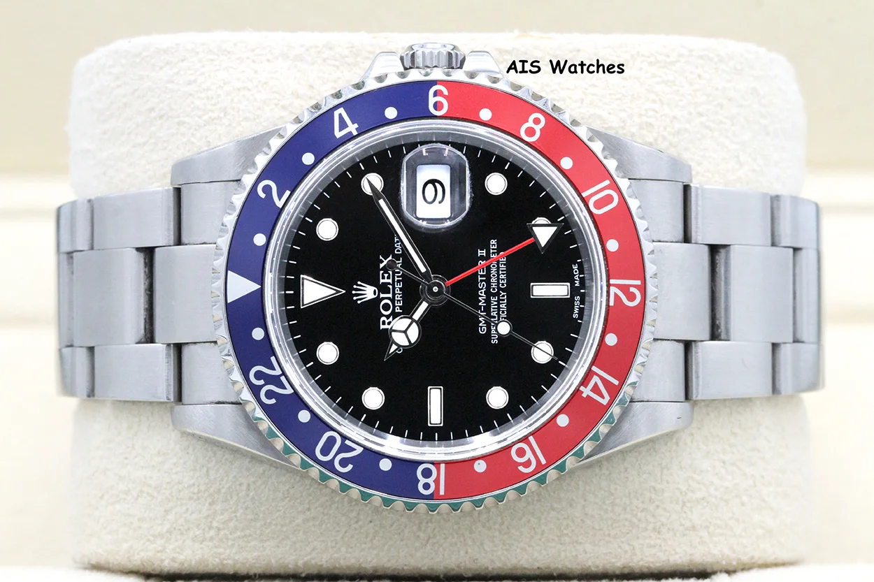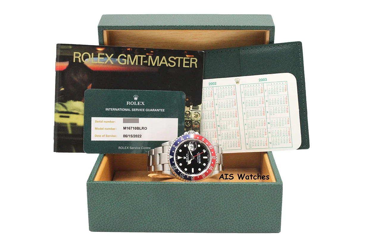 Up for sale is a Rolex GMT Master II 16710 K Serial Pepsi Box & Papers. Solid End Links (SEL) and Lug Holes Case. The timepiece is in excellent condition with minimal bracelet stretch.