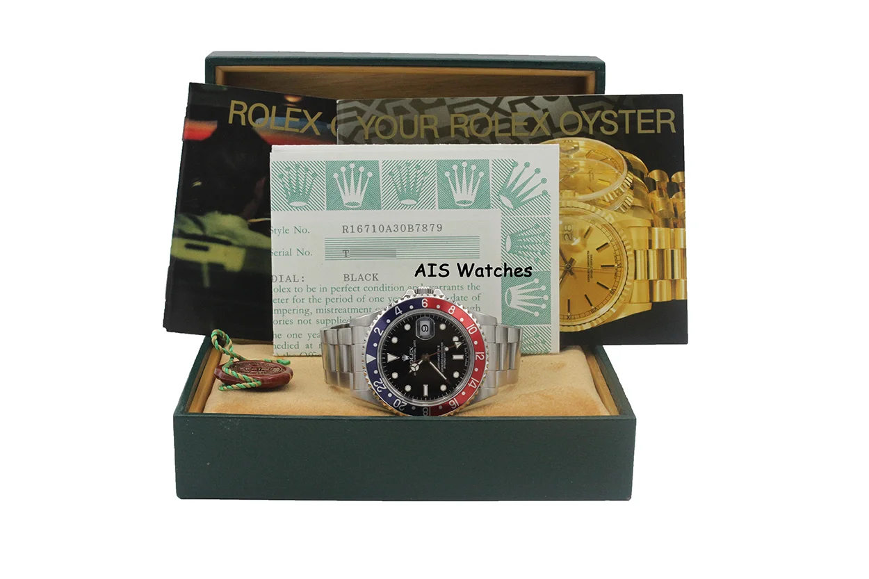 Up for sale is a Rolex GMT Master II 16710 T Serial Pepsi Box & Papers. Non-Solid End Links (Non-SEL) and Lug Holes Case. The timepiece is in excellent condition with minimal bracelet stretch.