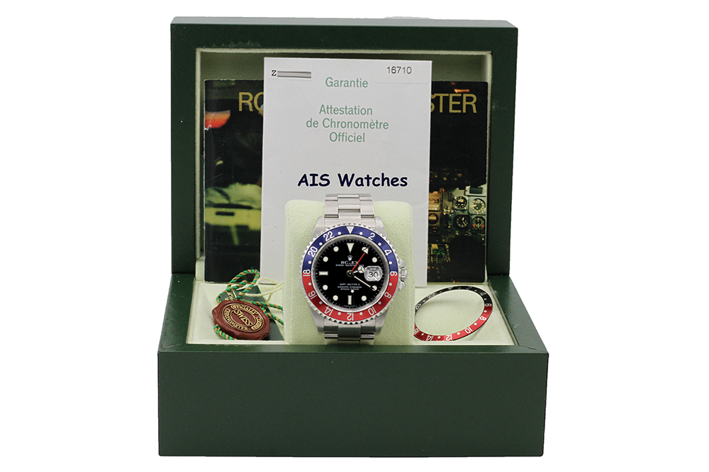 Up for sale is a Rolex GMT Master II 16710 Z Serial Pepsi Insert Box & Papers + Coke Insert. Solid End Links (SEL) and NO Holes Case. Watch is in excellent condition for its age.