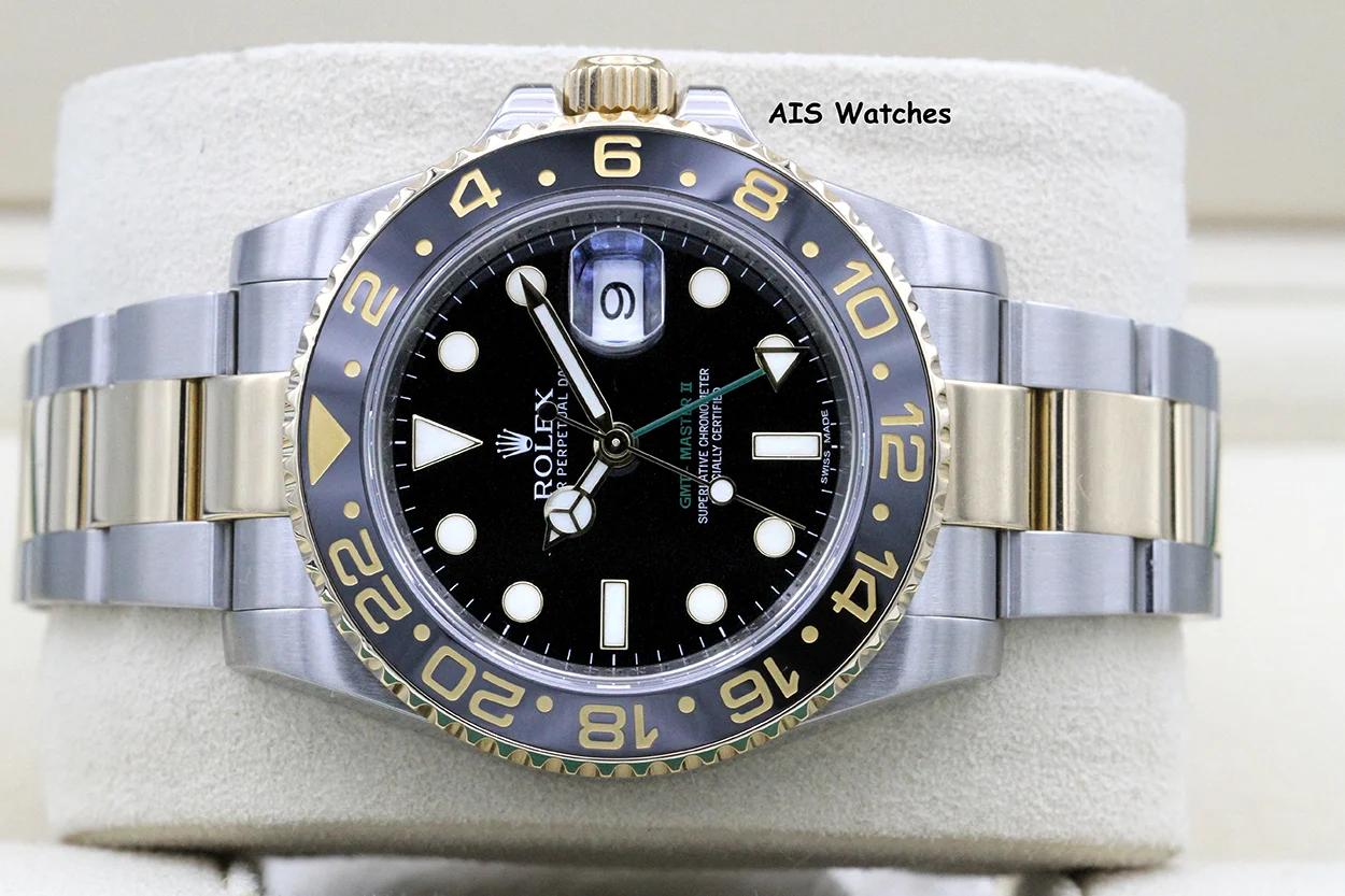 Up for sale is a Rolex GMT Master II 18K/SS 116713 LN 40MM Black Dial Box & Papers. The timepiece is in excellent condition.