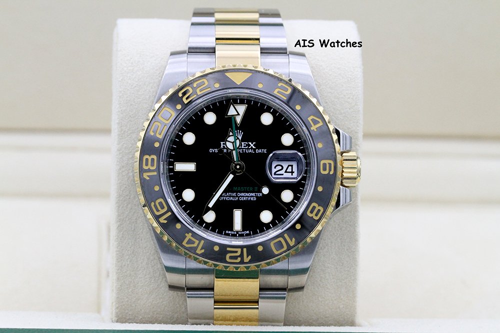 Up for sale is a Rolex GMT Master II 18K/SS 116713 LN 40MM Black Dial Box & Papers. The timepiece is in excellent condition.