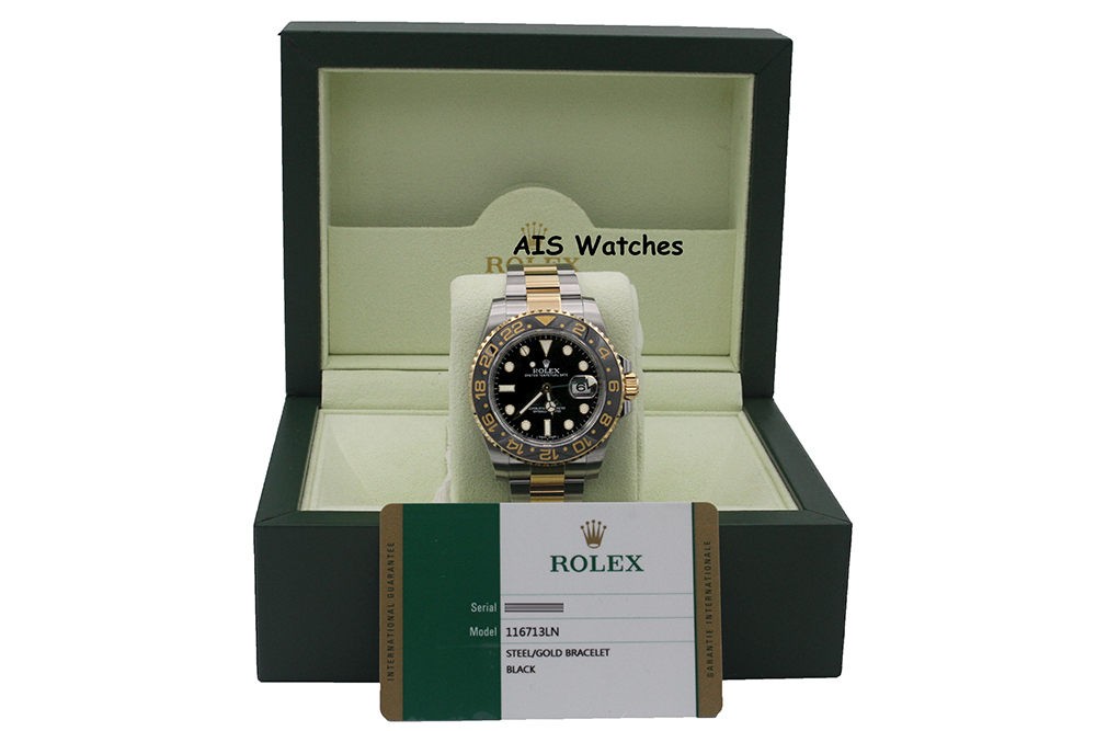 Up for sale is a Rolex GMT Master II 18k/SS 116713 LN 40MM Black Dial Random Box & Papers. The timepiece is in excellent condition.