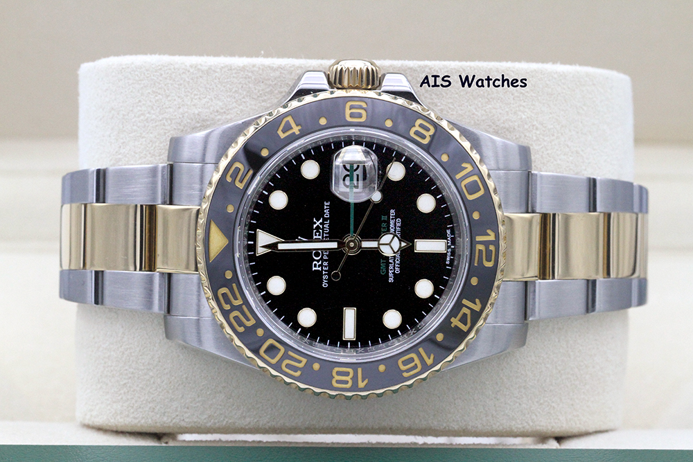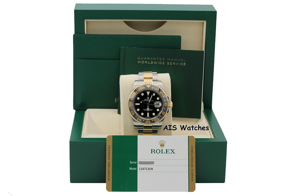 Up for sale is a Rolex GMT Master II 18k/SS 116713 LN 40MM Black Dial Random Box & Papers. The timepiece is in excellent condition.