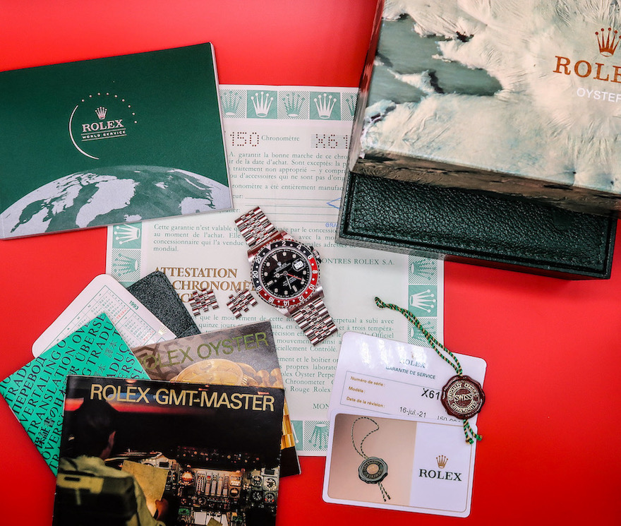 Accessories: Outer&Inner Box, GMT Master II Booklet, Your Rolex Oyster Booklet, Rolex Chronometer tag, Rolex Calendar 1993/94, Rolex document holder, Rolex Translation Booklet, Rolex Service Card (July 2021) and Service booklet.