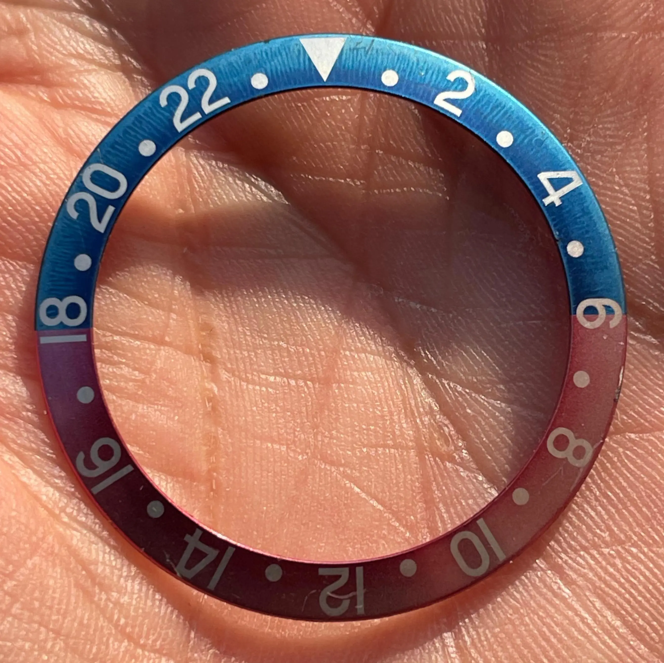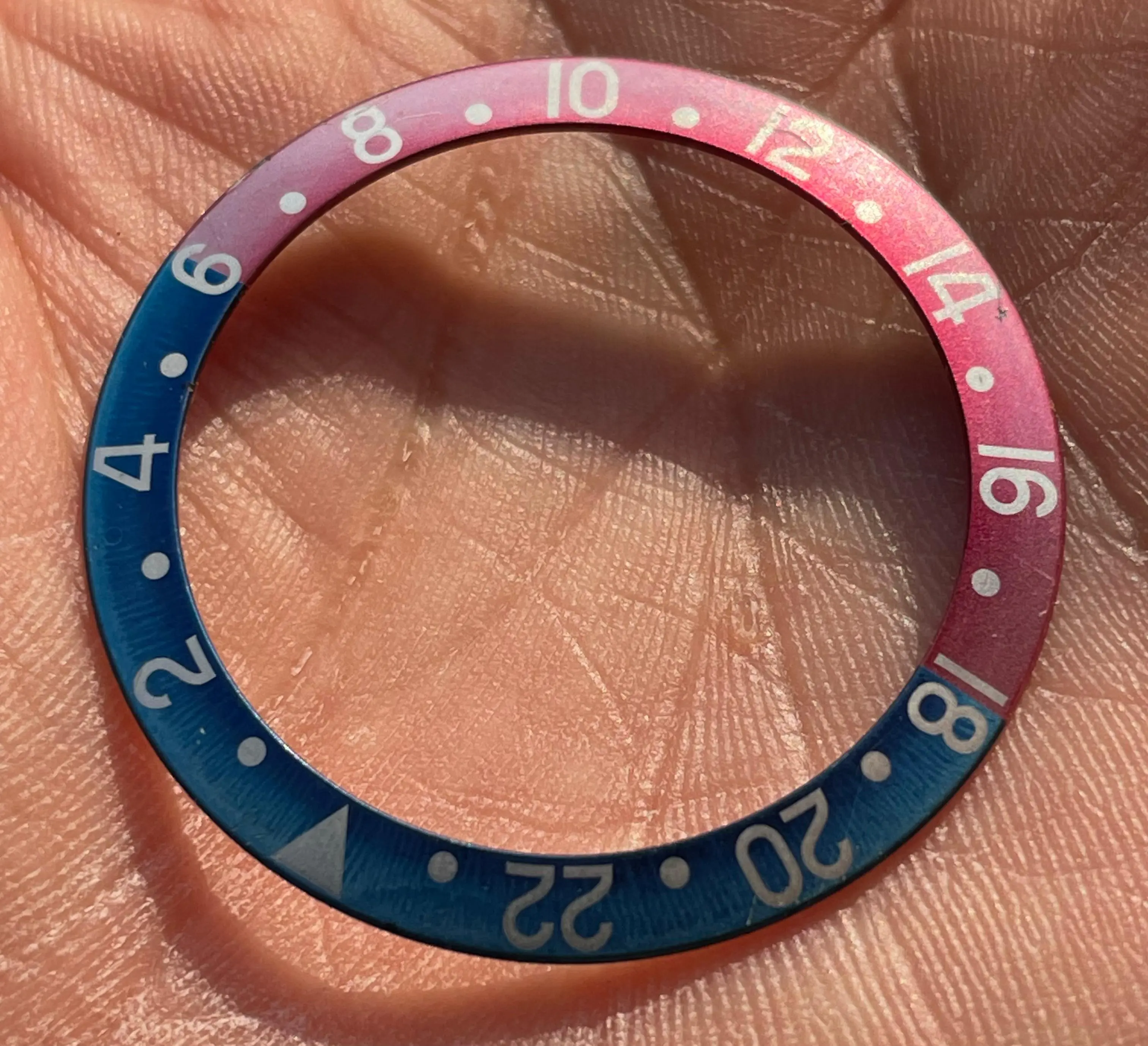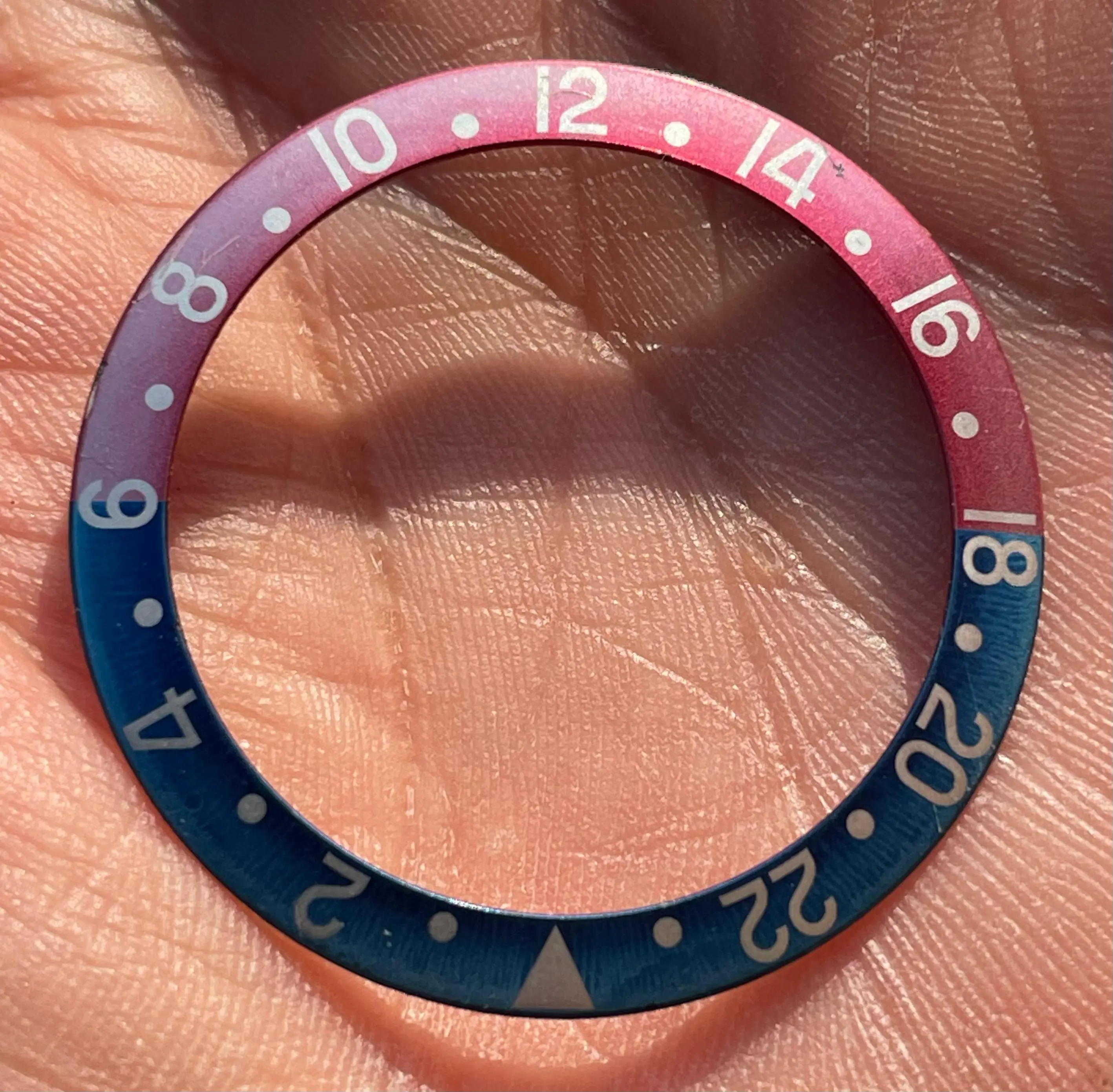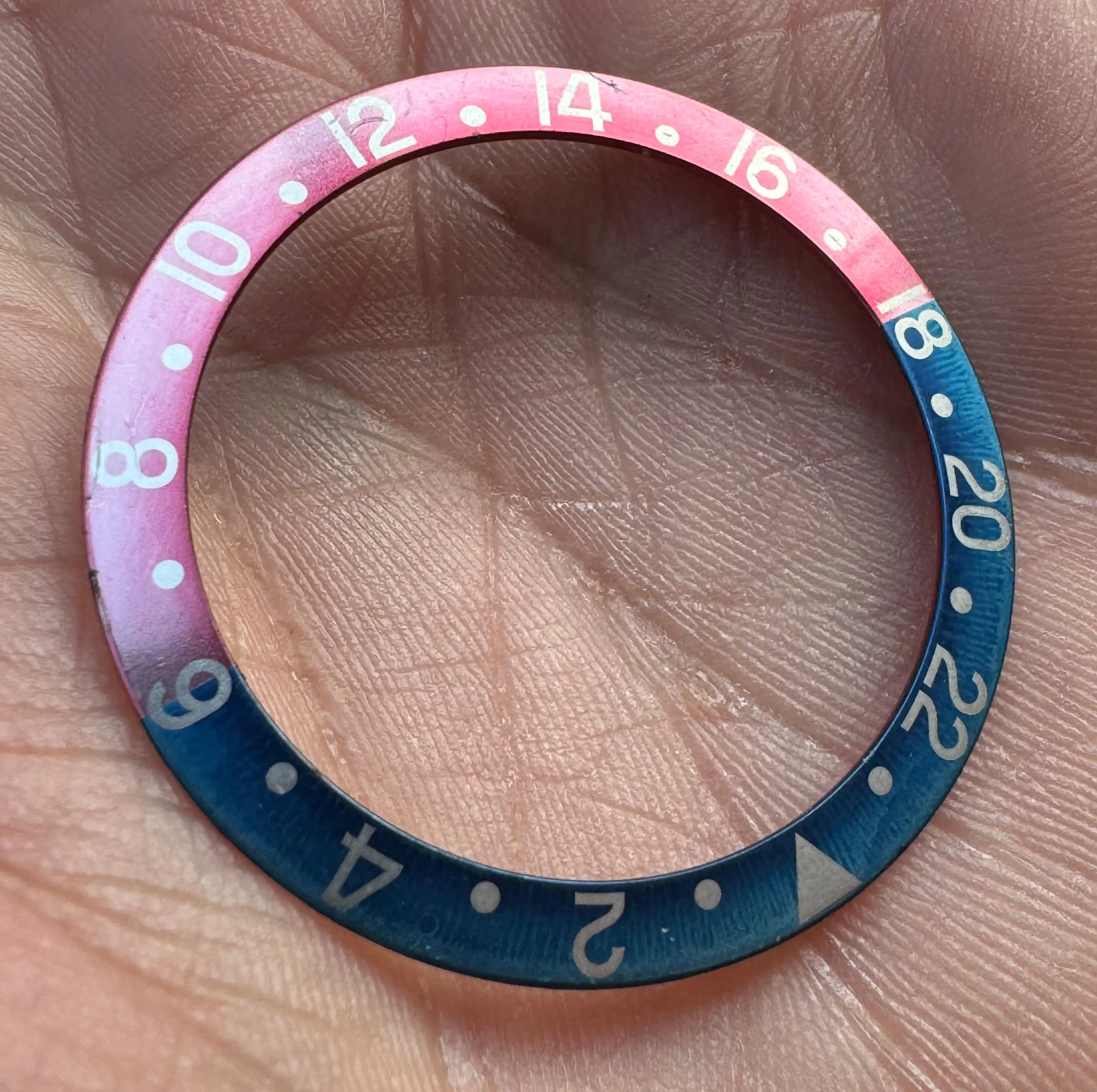 Selling a beautiful Rolex GMT 1675/16750 "Pepsi" red back inlay bezel insert.
