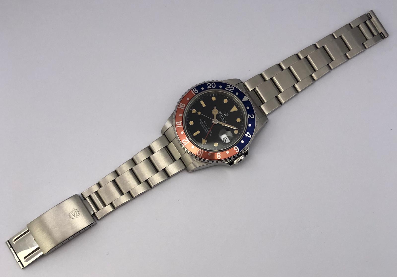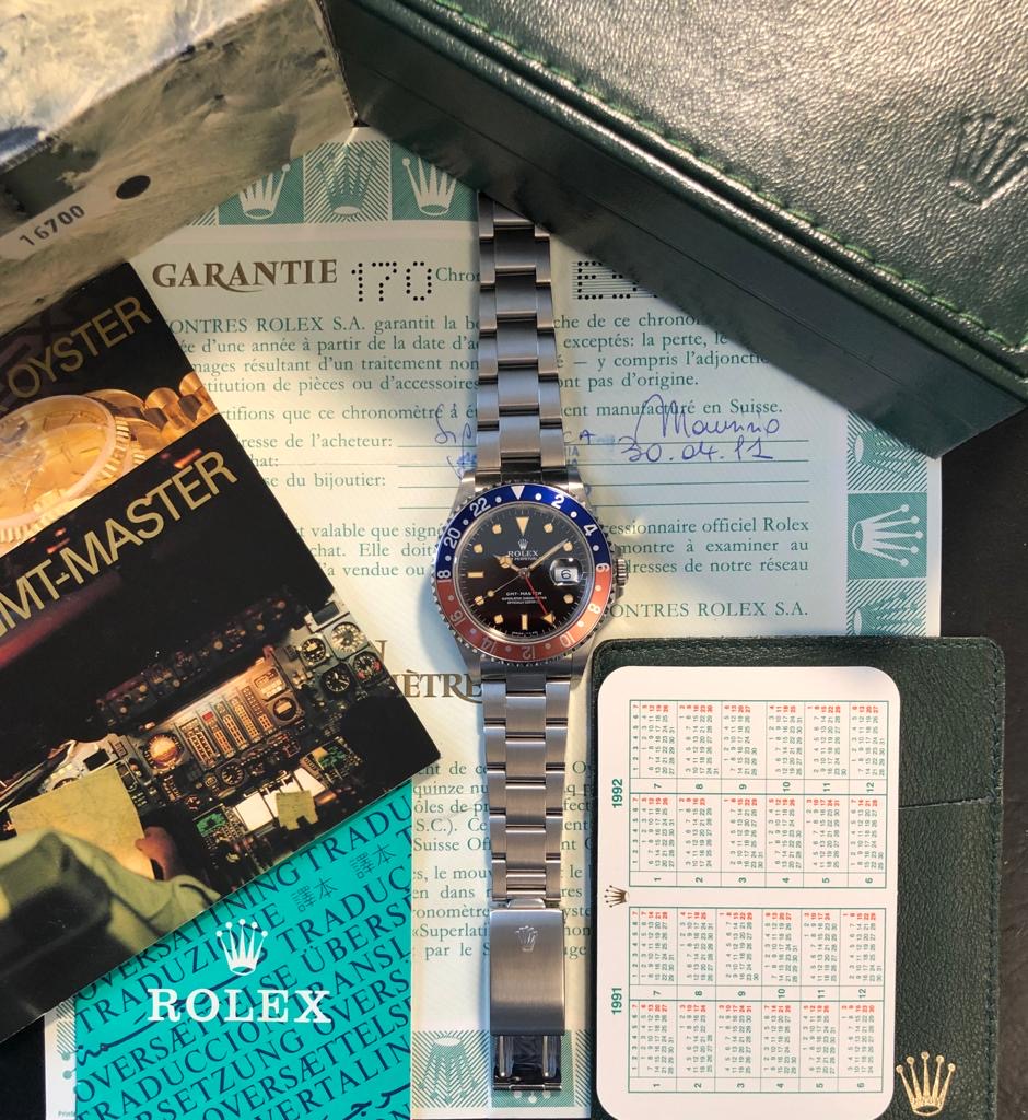 The watch comes with the full set: original Rolex box (inner/outer) with reference sticker, the Rolex warranty certificate (punched papers), the Rolex warranty holder, the Rolex calendar, the Rolex booklets ('Your Rolex Oyster' and 'Rolex Gmt-Master').