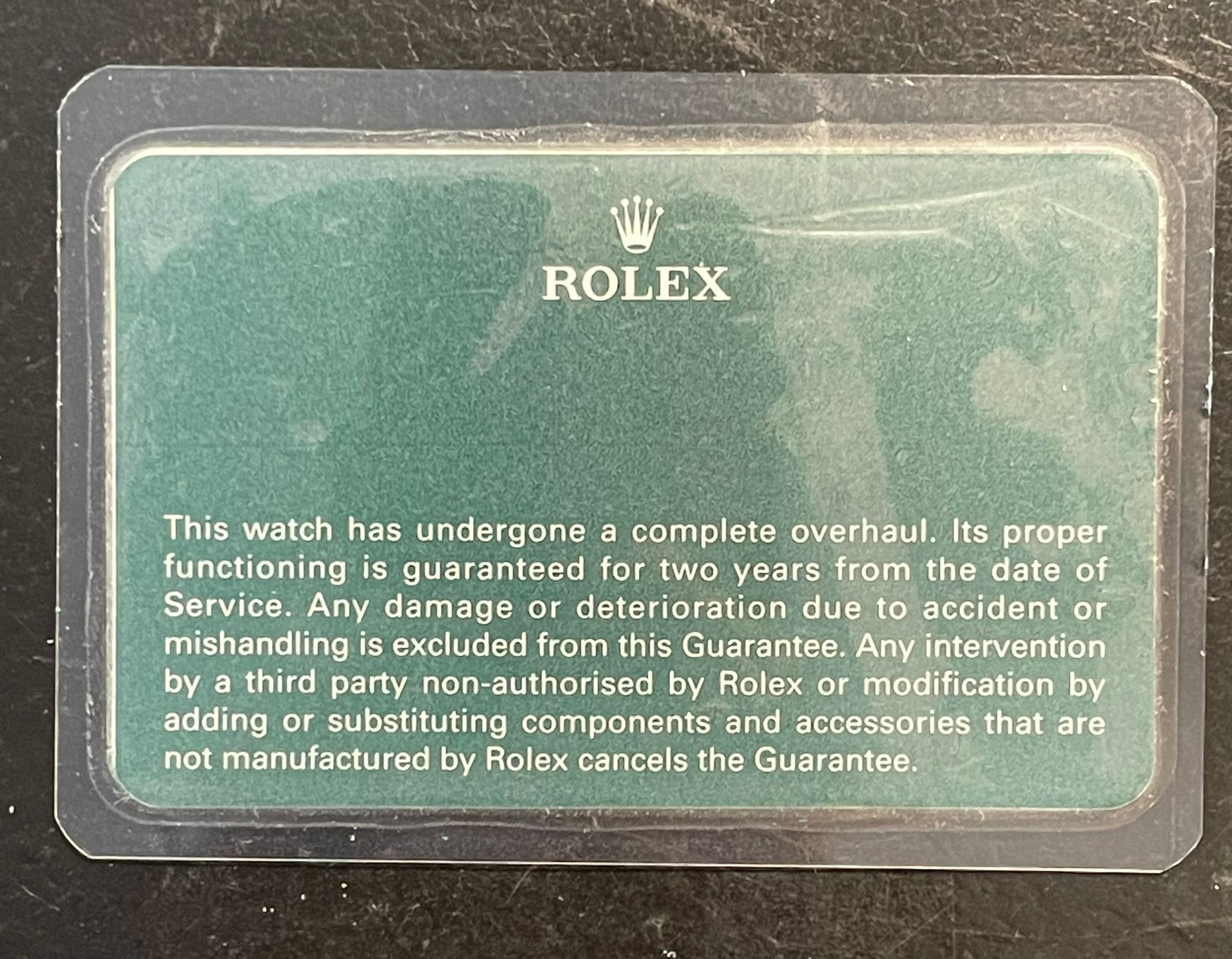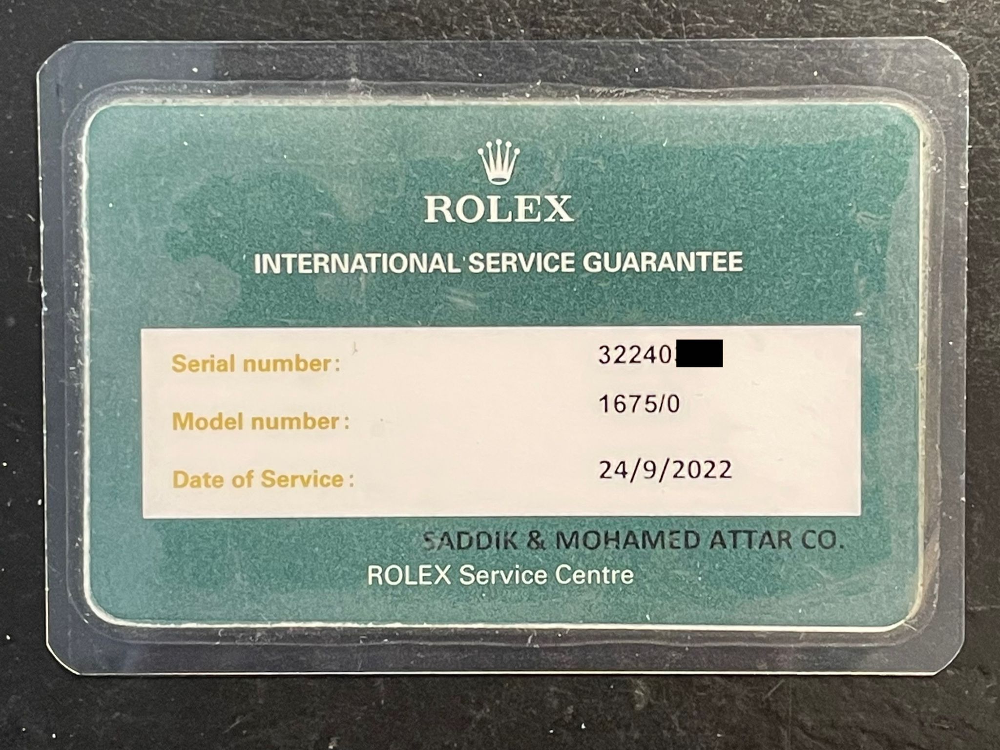 The watch was fully serviced in September 202 at the Rolex Service Center "Saddik and Mohamed Attar Co.", as per request during the service nothing was replaced and the case wasn't polished; the Rolex international service guarantee is included.